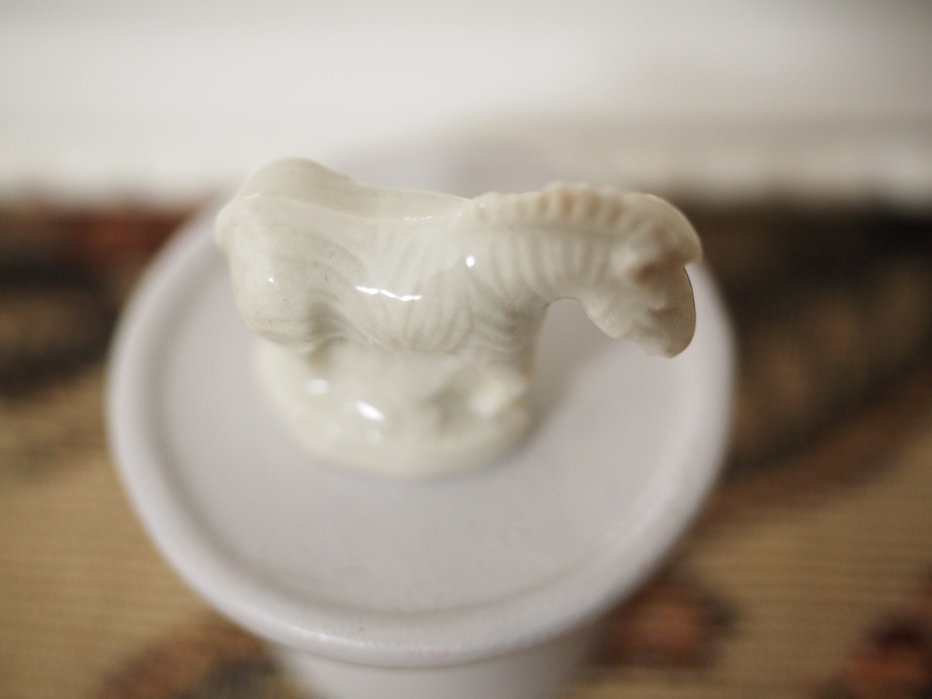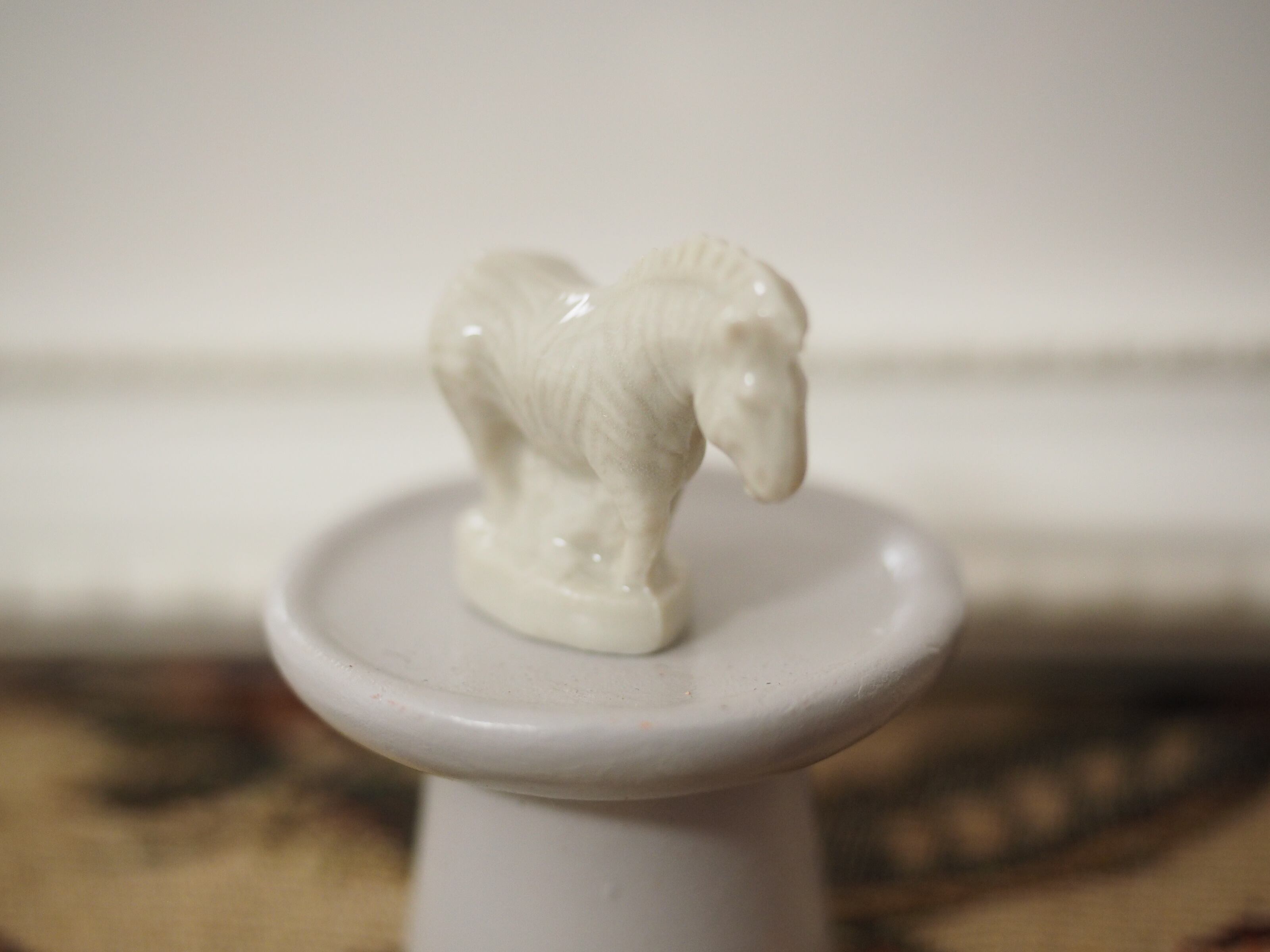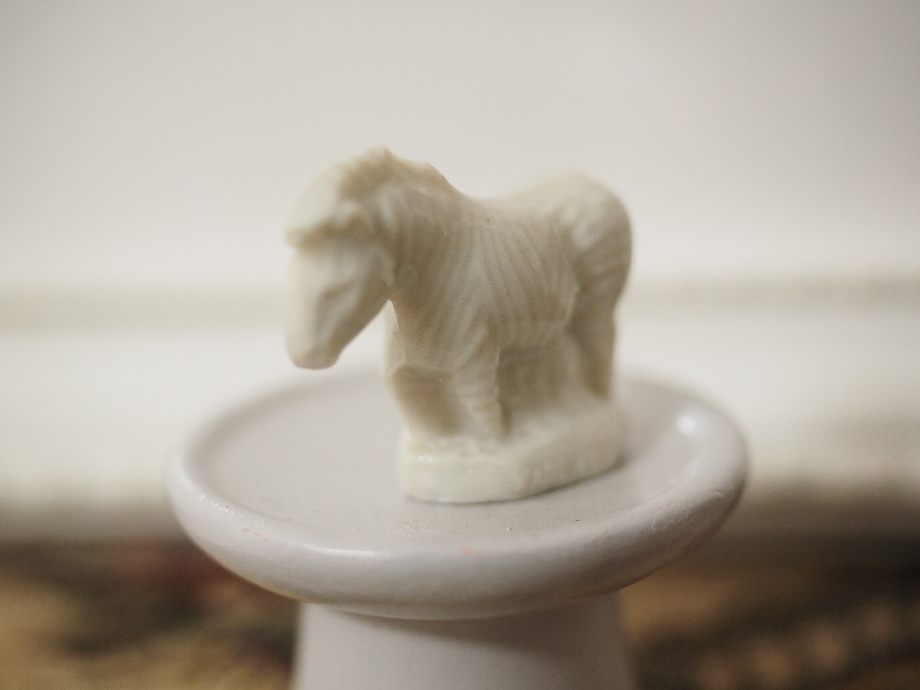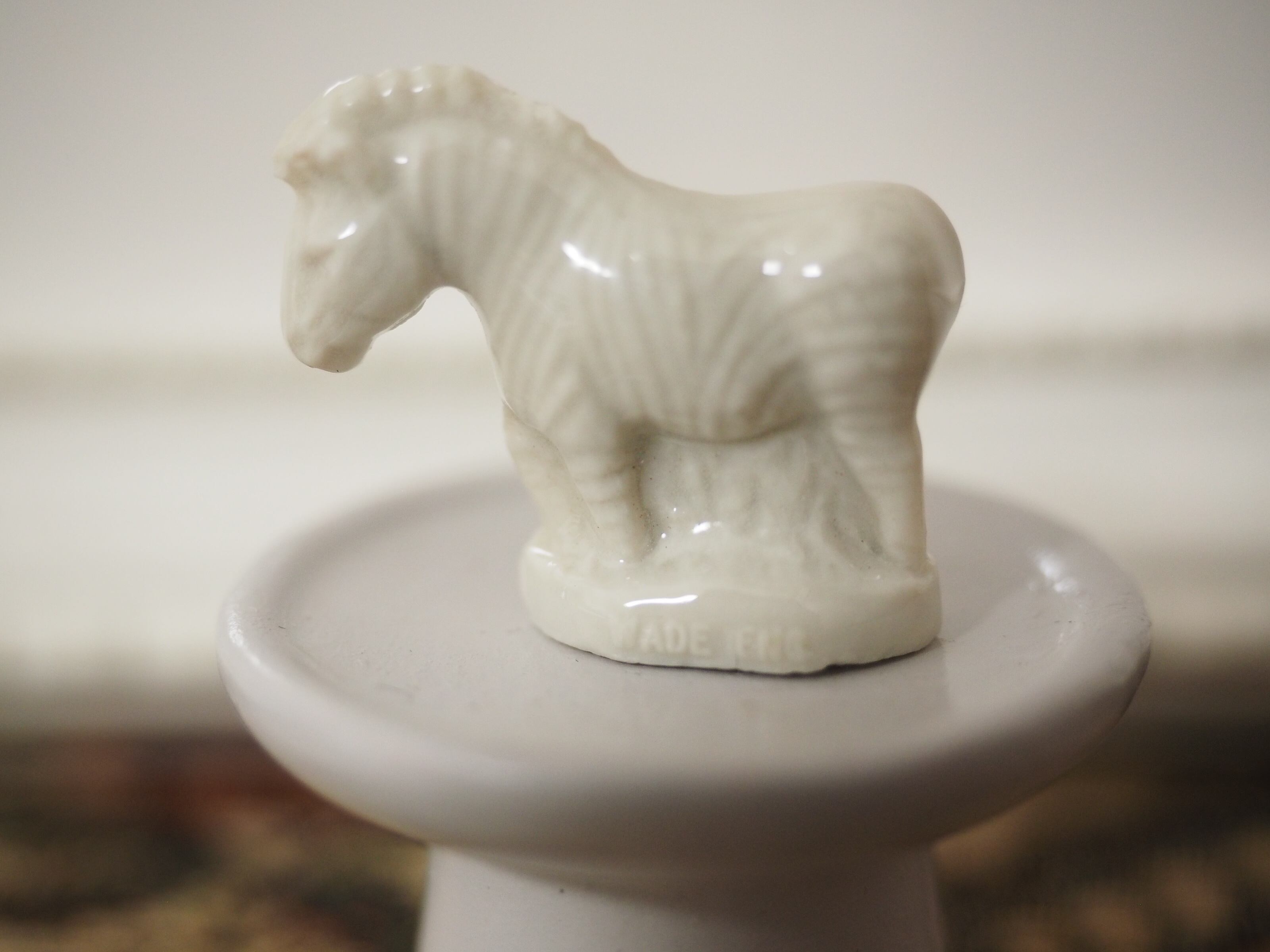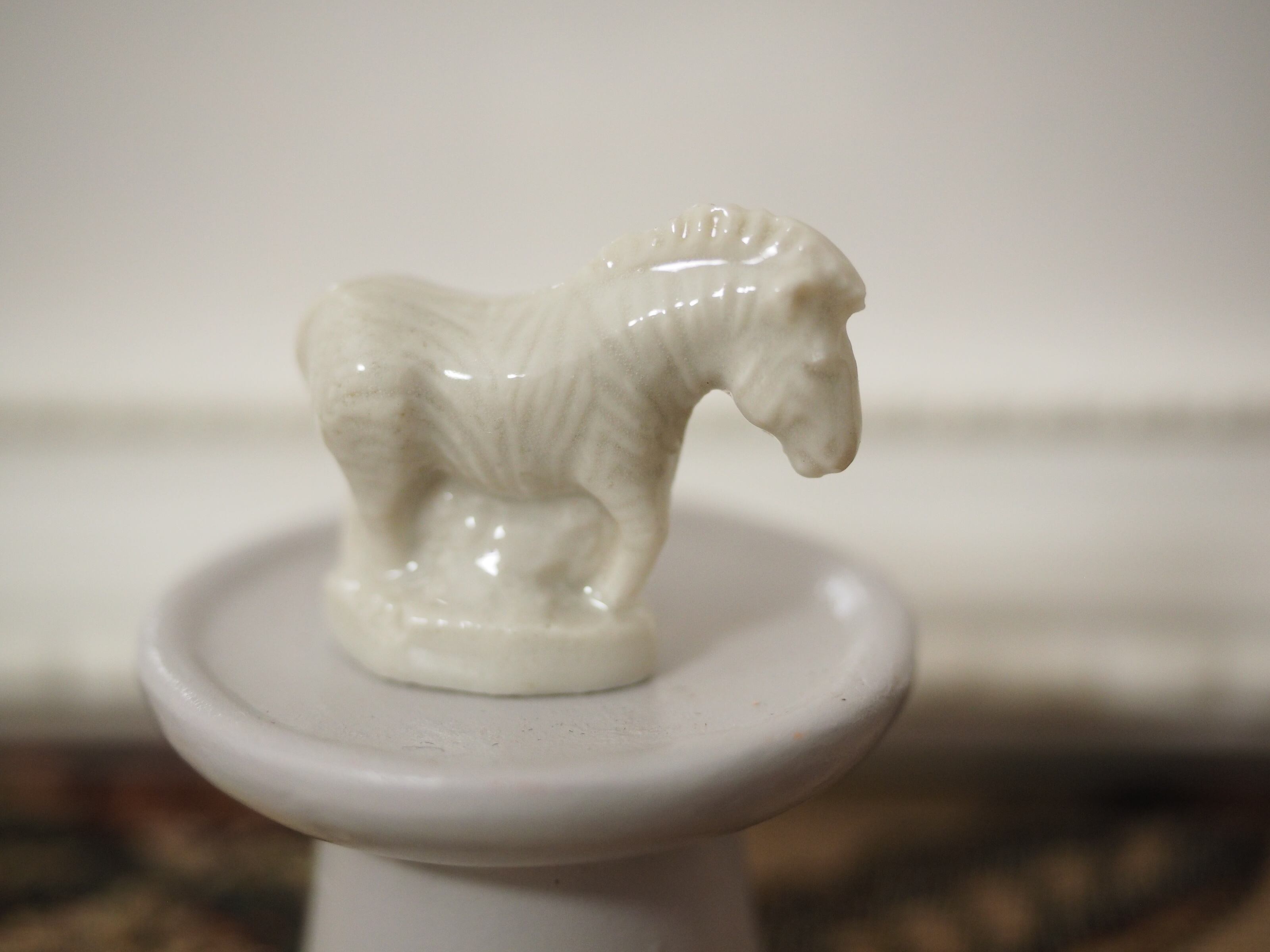下を向き加減にたたずむ様子の白いシマウマ、グレーがかったホワイトで、真っ白なのですが縞模様やたてがみ、顔立ちもはっきりしており飾るとミニチュア彫刻のようでとても素敵です!