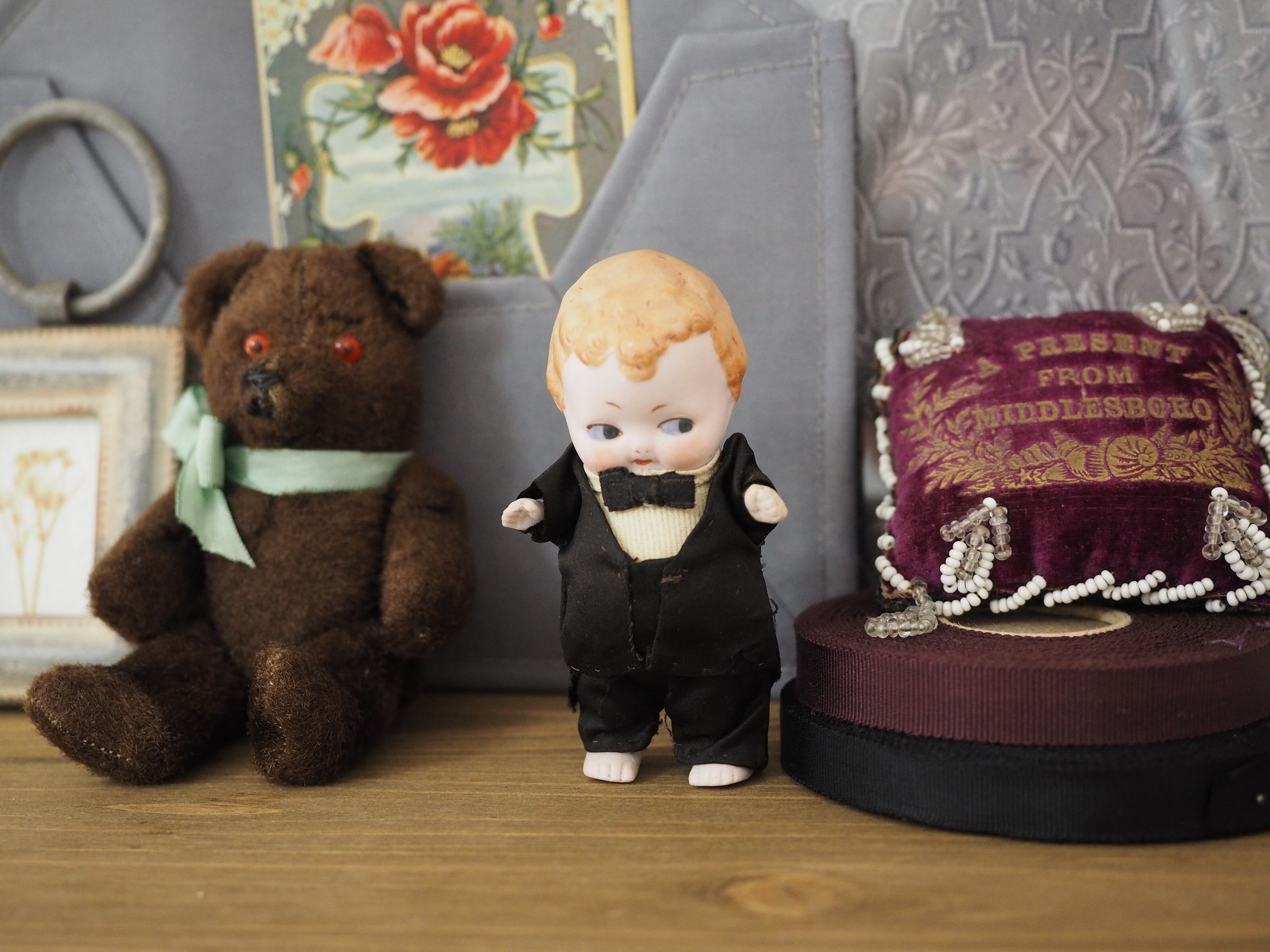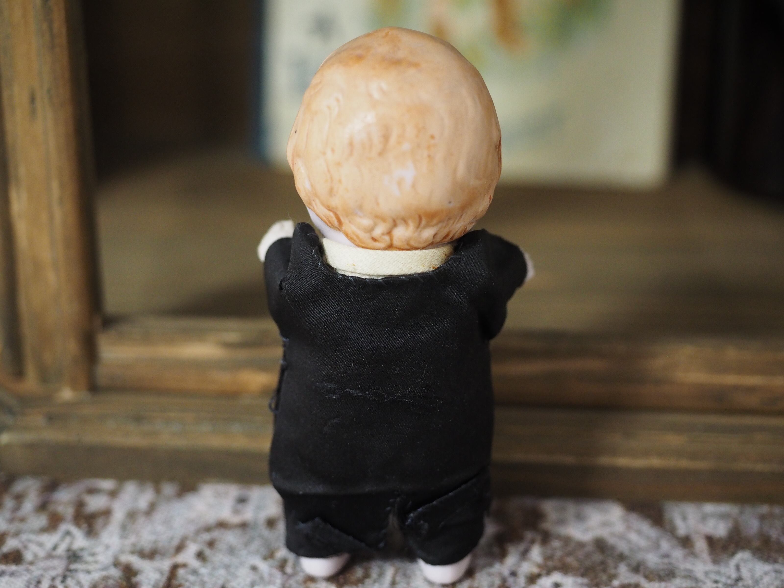 お洋服は手縫いでほつれ、折れがありますが、お人形にぴったりの作りに温かみを感じます。