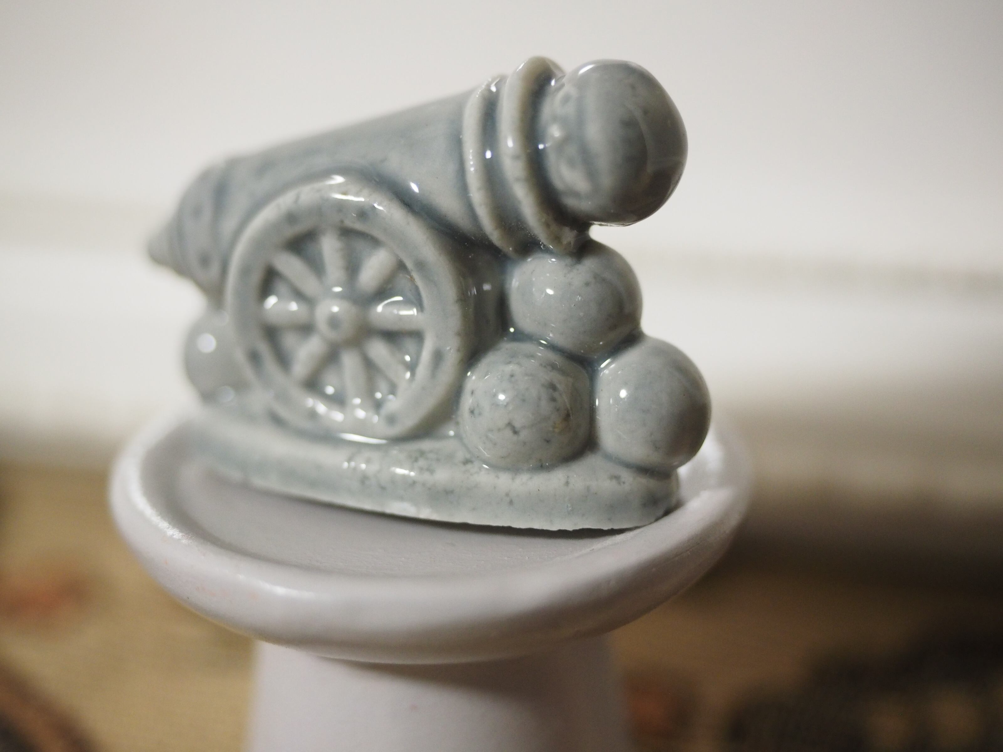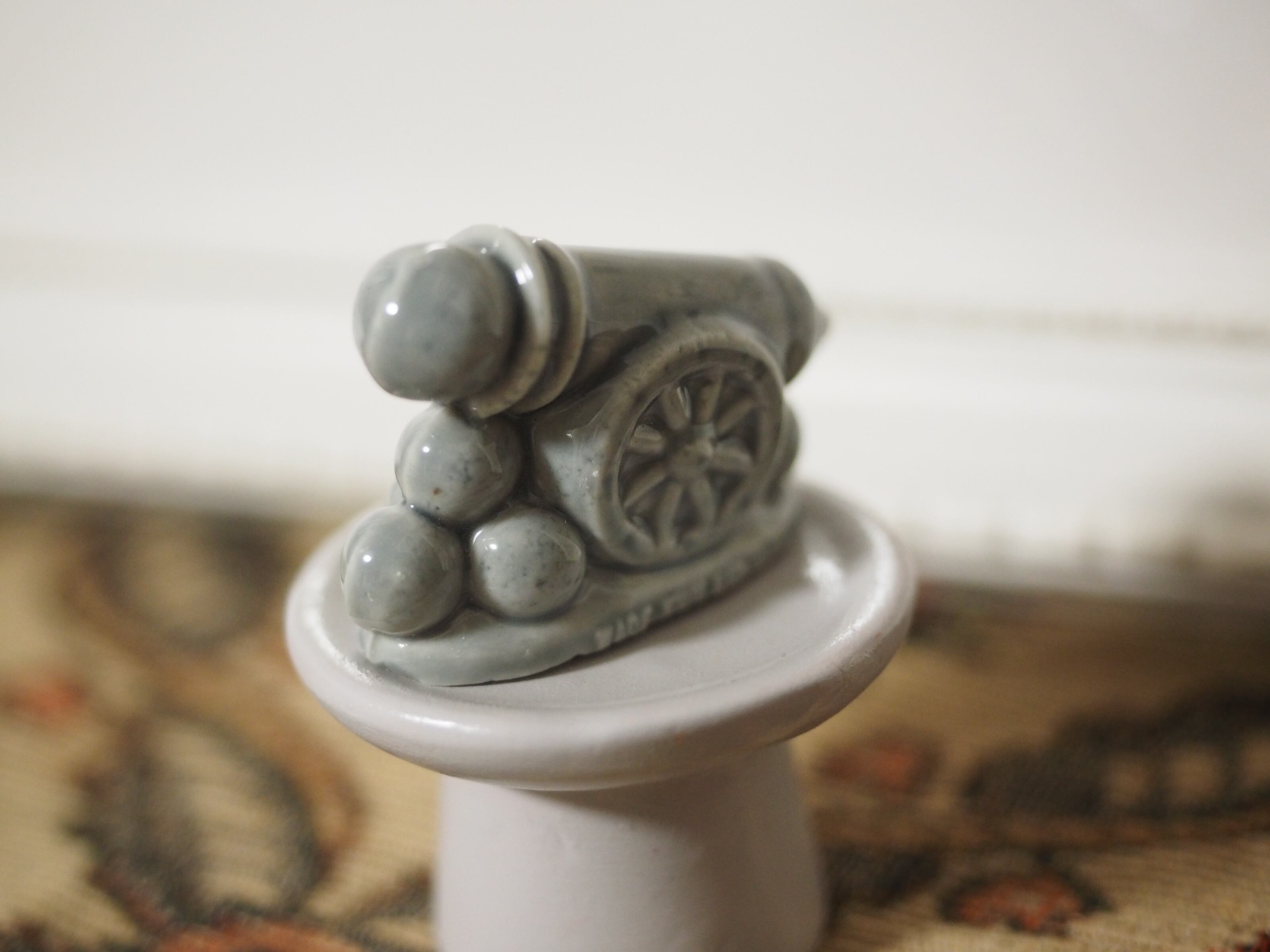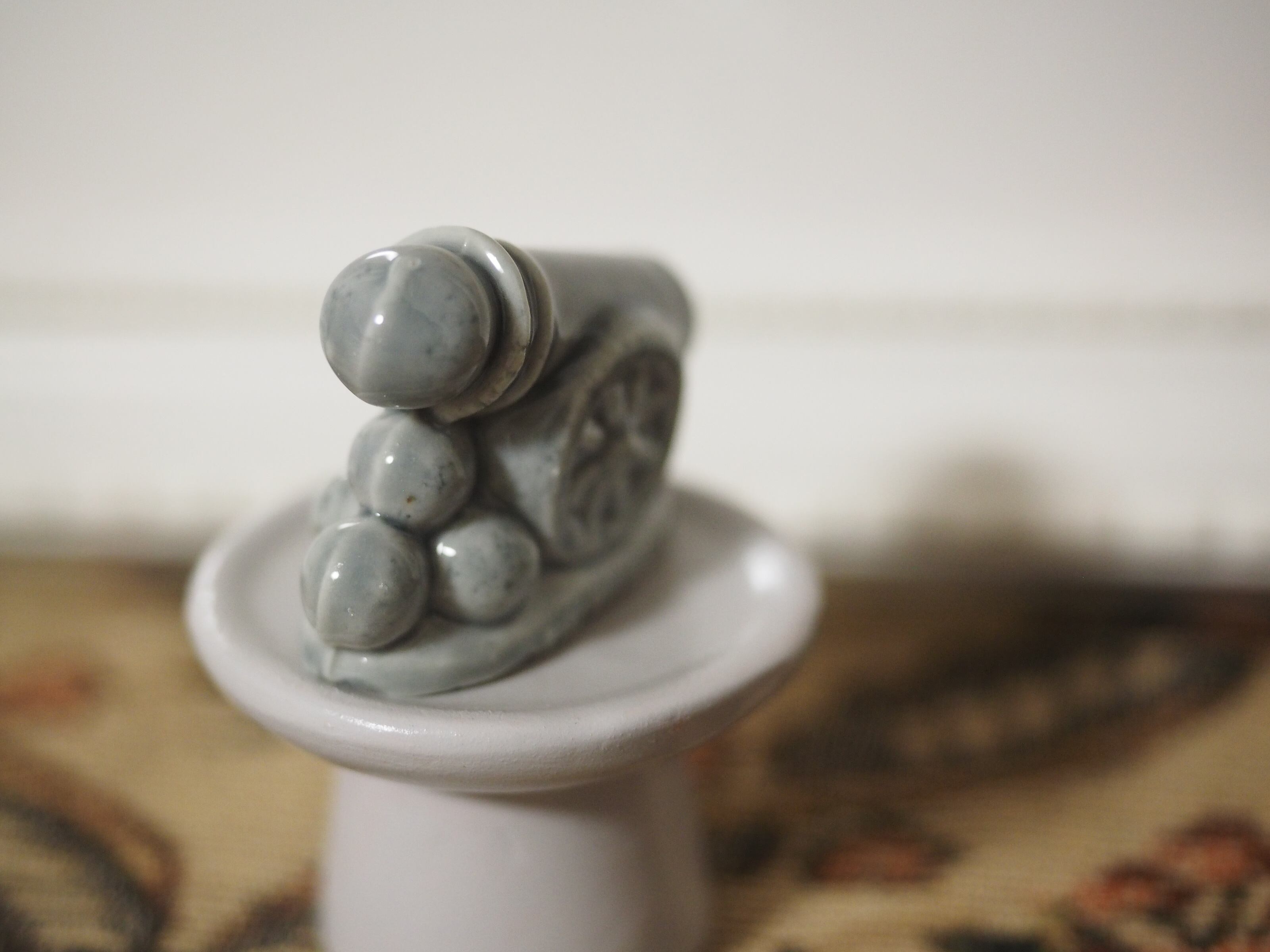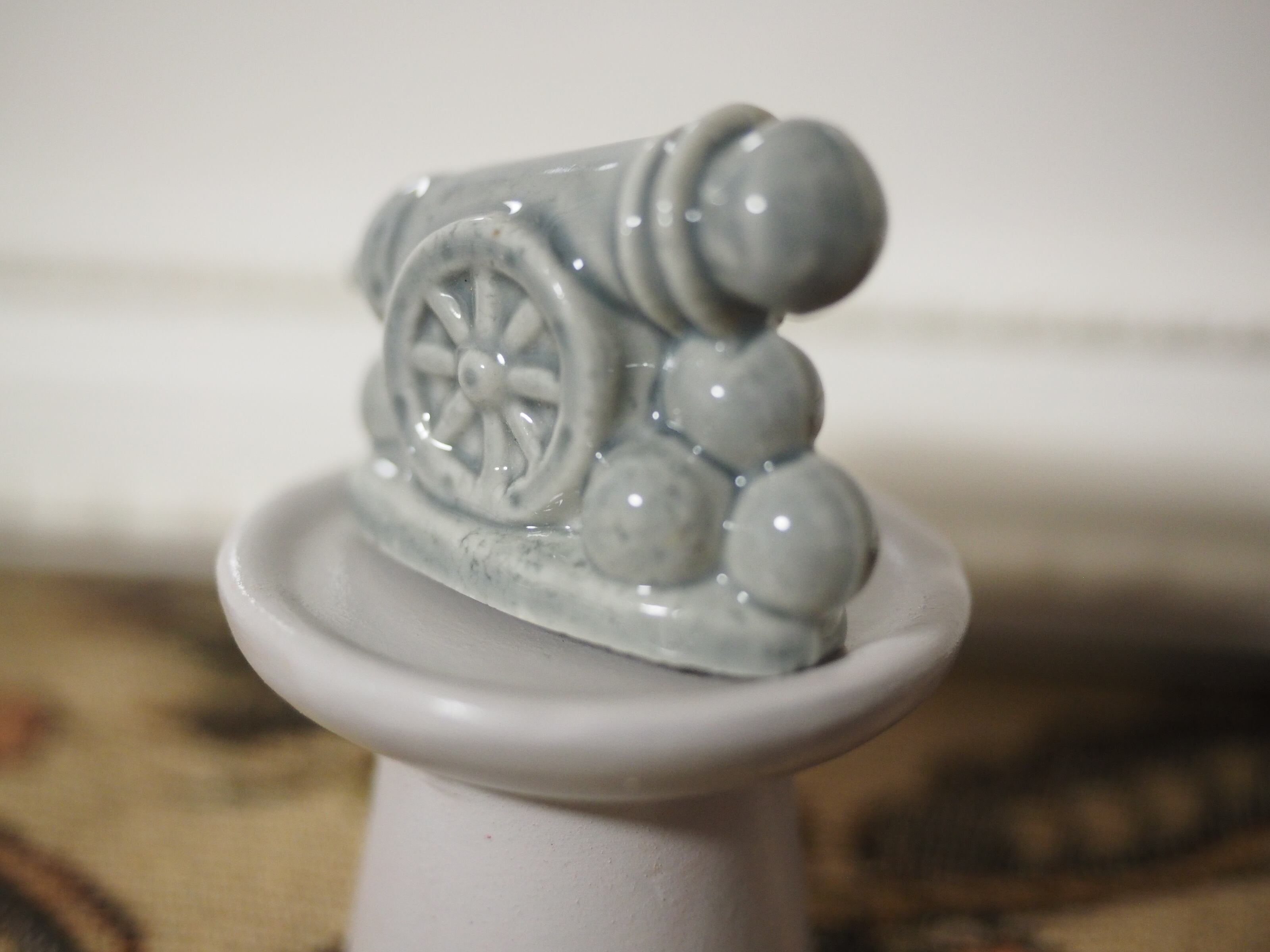 大砲?と思いましたら、なんとサーカスの人間大砲 なのだそう。確かに大砲の右手にかわいい顔が覗いています!丸いヘルメットにゴーグルをかけ、小さな鼻ににっこり口元の成形が細やか。