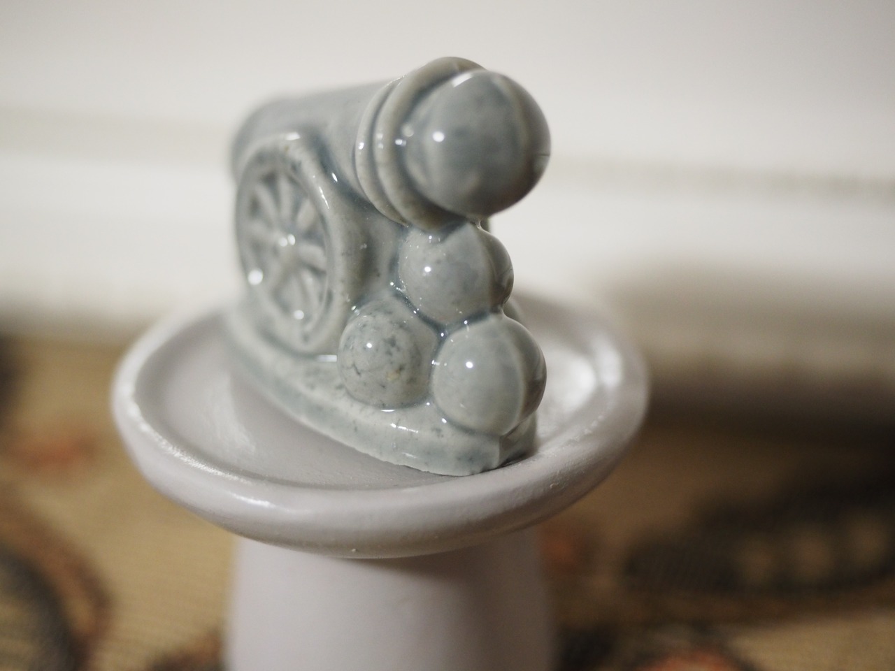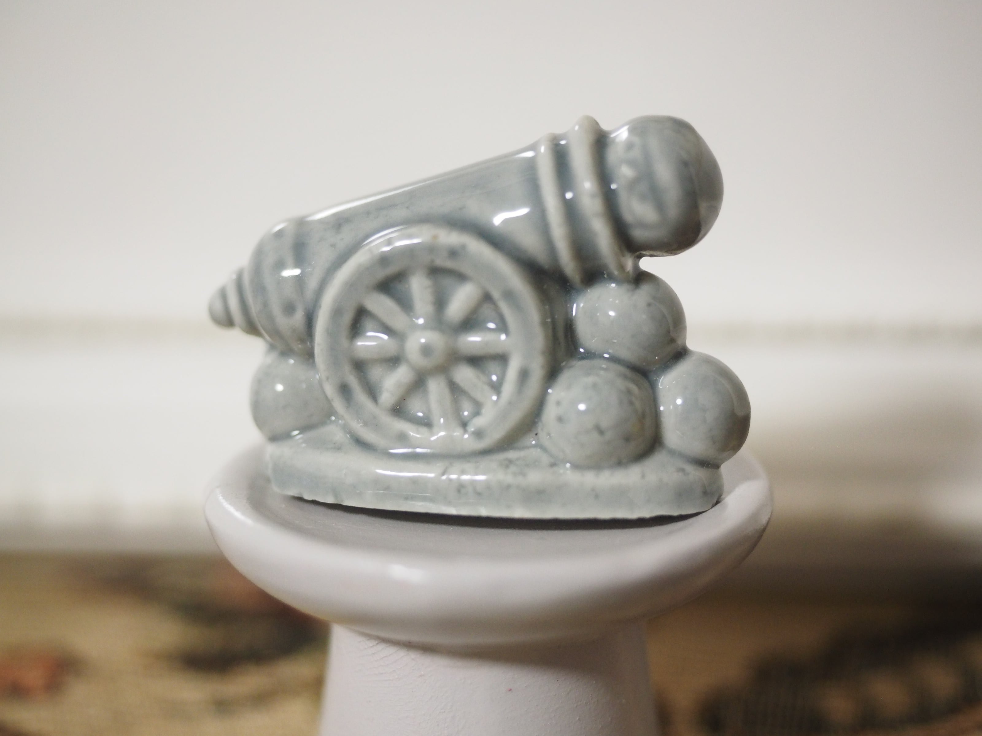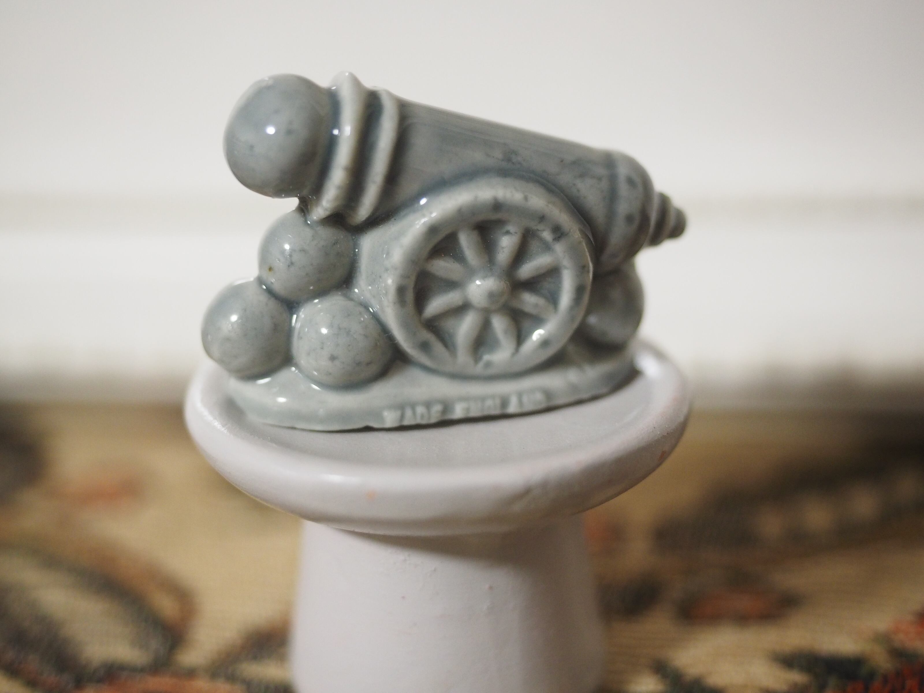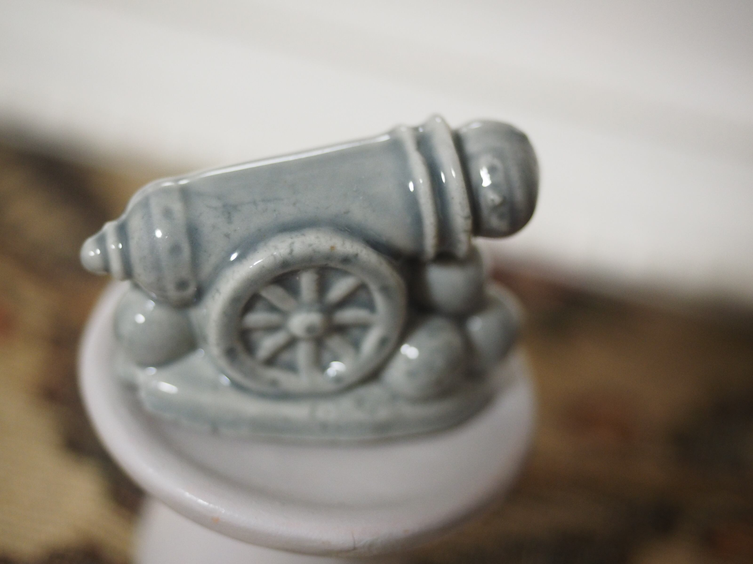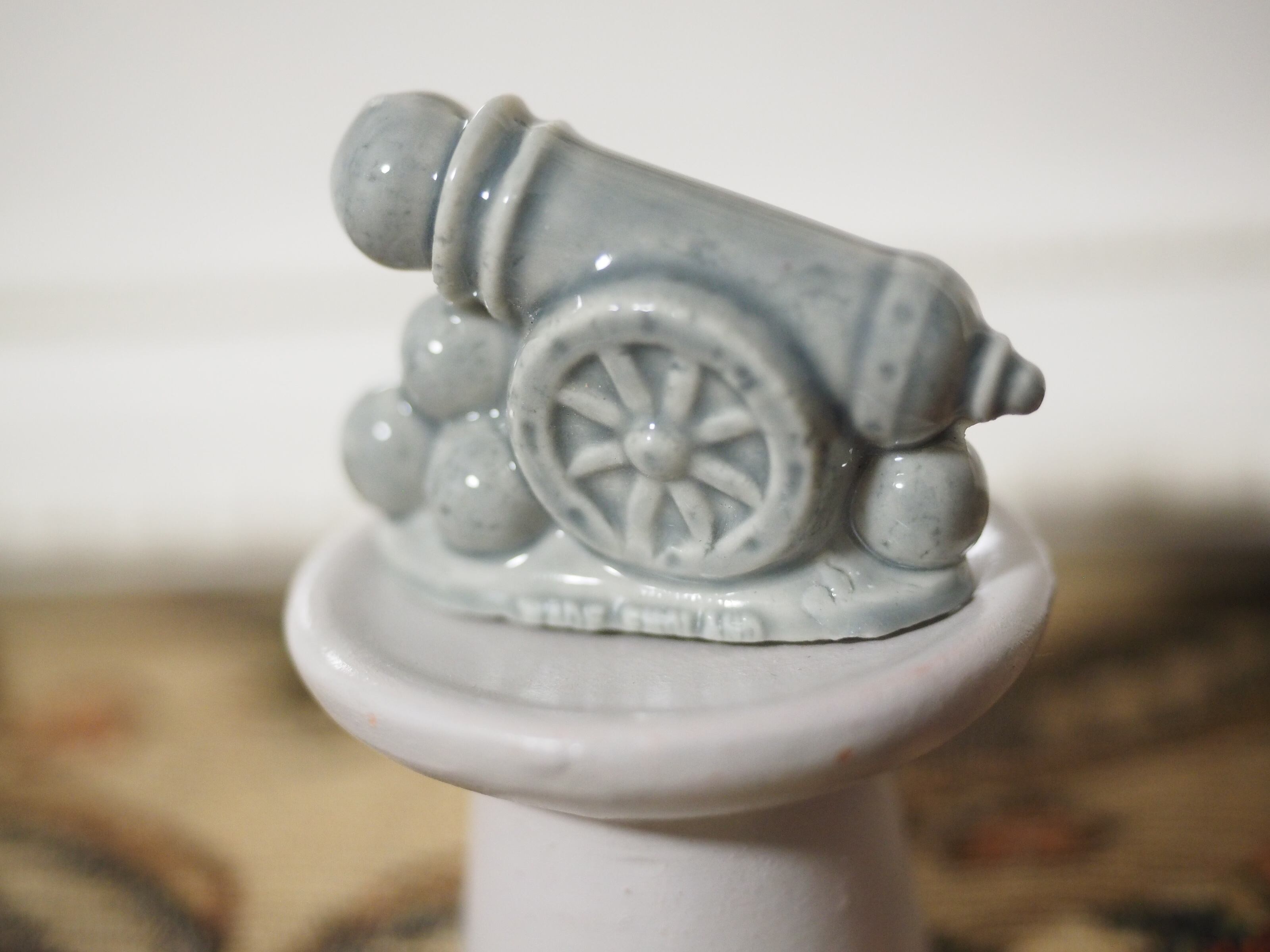 大砲?と思いましたら、なんとサーカスの人間大砲 なのだそう。確かに大砲の右手にかわいい顔が覗いています!丸いヘルメットにゴーグルをかけ、小さな鼻ににっこり口元の成形が細やか。