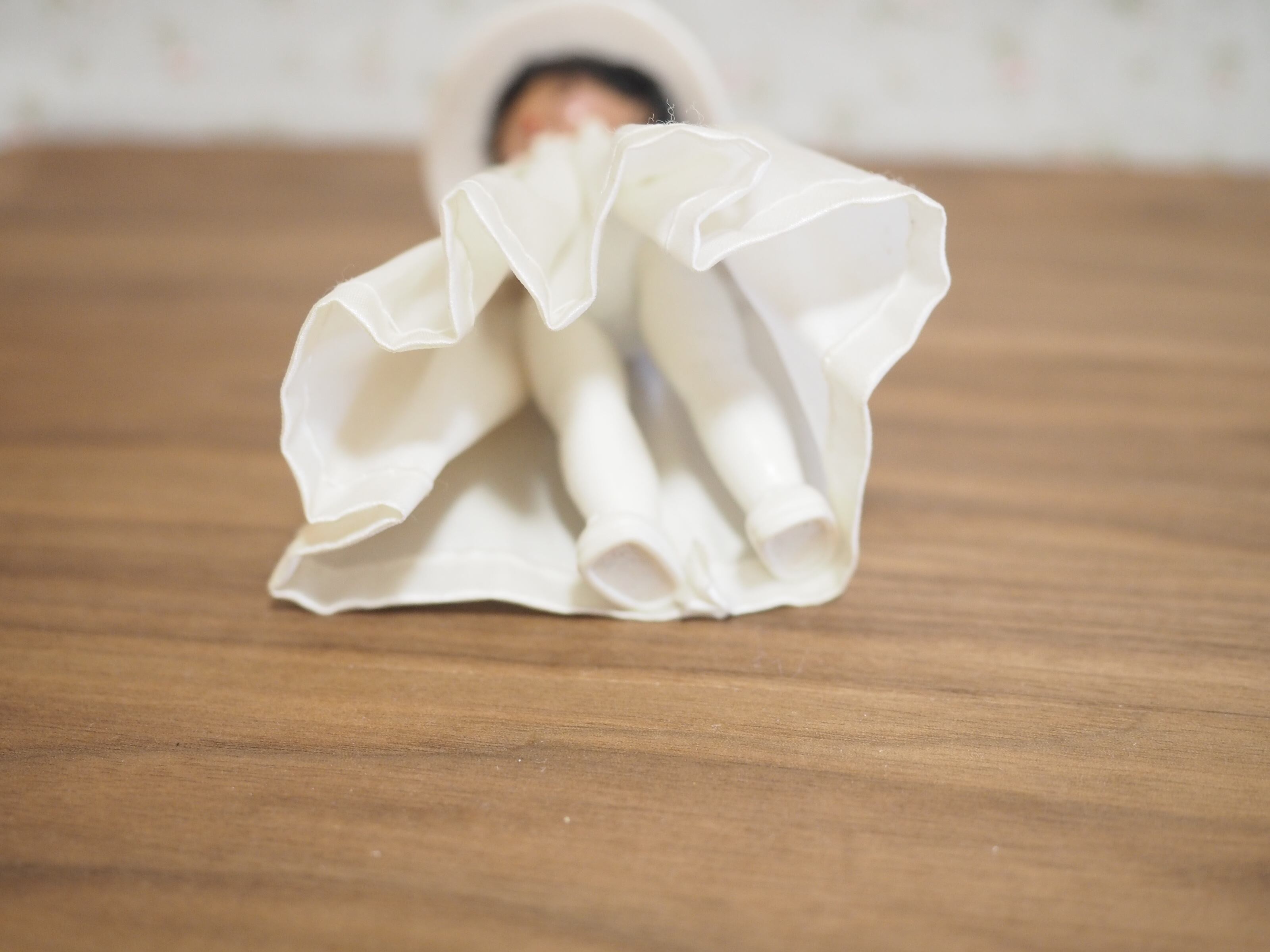 ドレスに所々点シミあり、うっすら黄色みがかった部分がございます。両腕の手袋のペイントに黒ずみ、左腕あたりに黒い点があります。