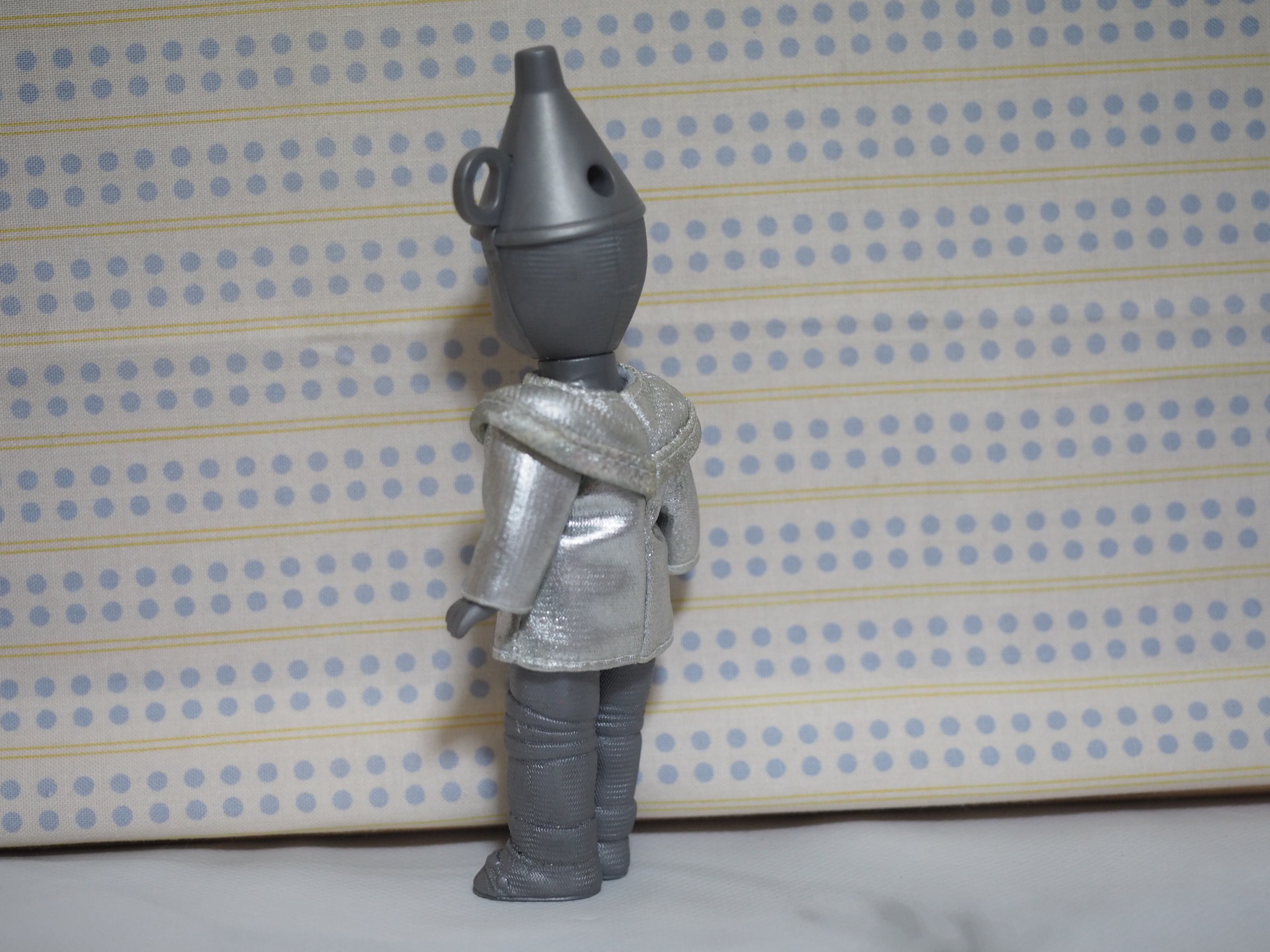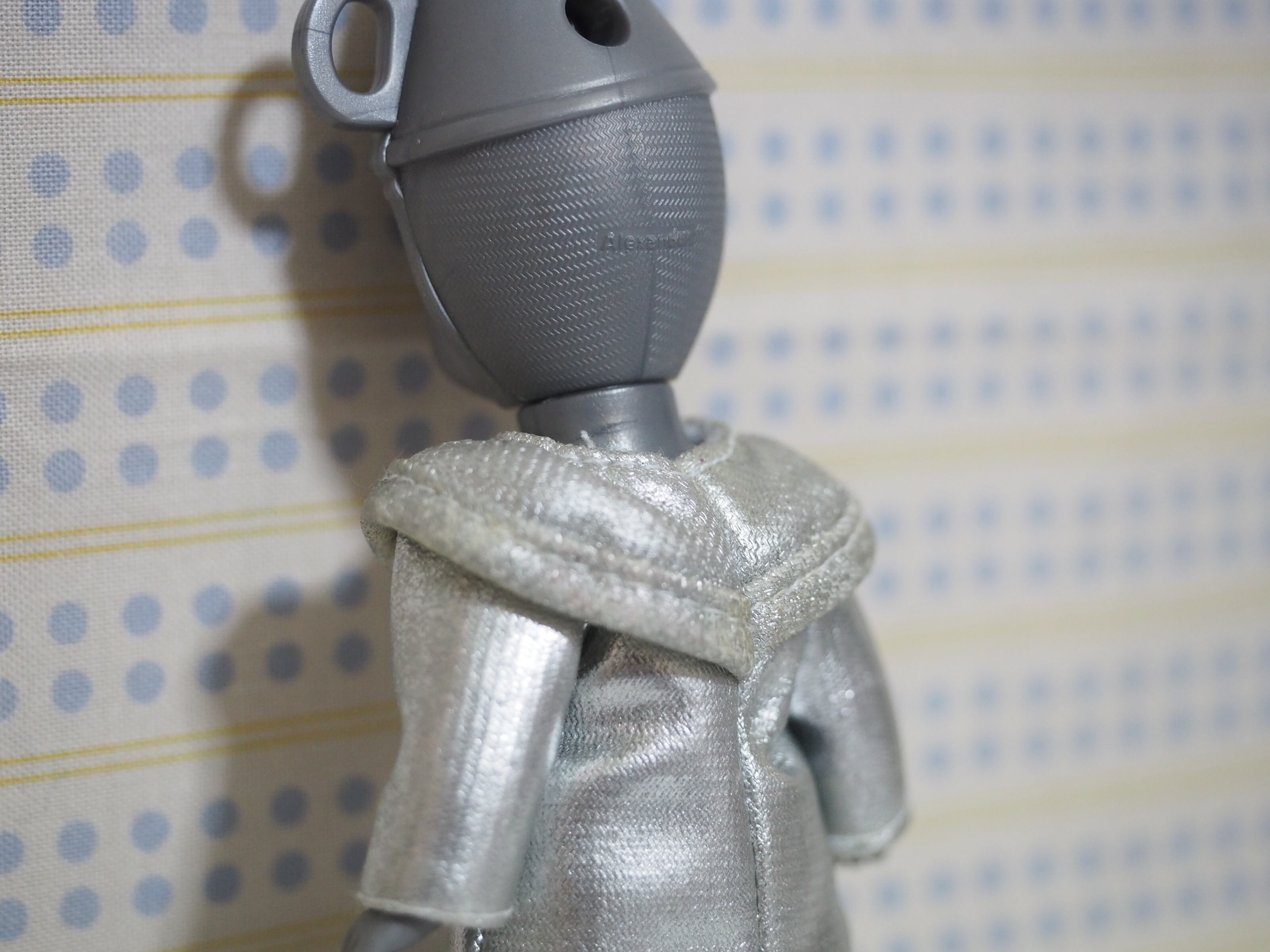 全身が金属風のデザイン、頭は油さしでしょうか?銀色のトップスにはブリキが求めていたハートがワンポイントになっています。トップスの素材はすれて銀色が薄くなっています。