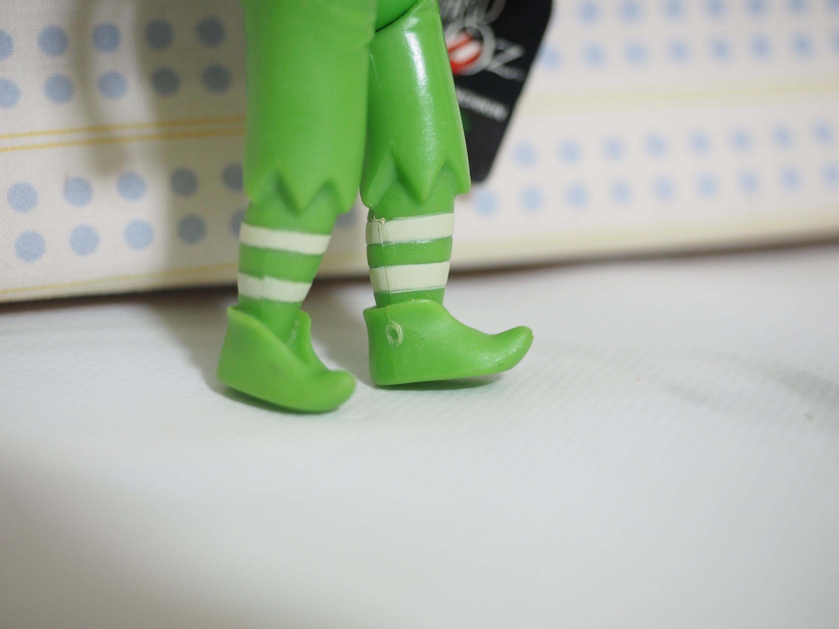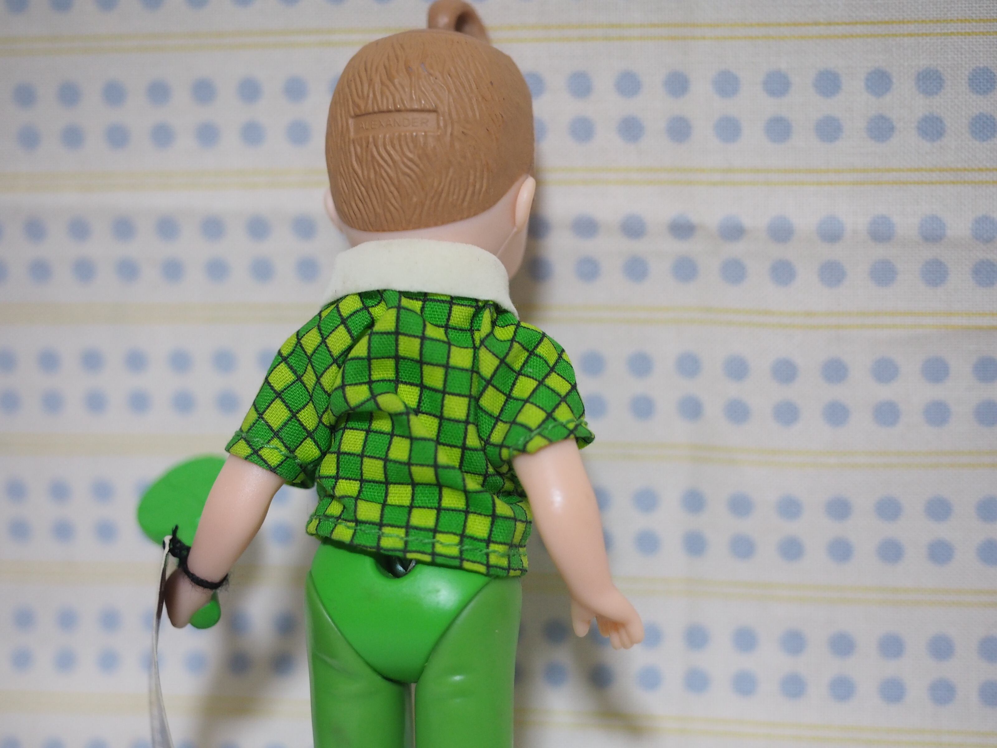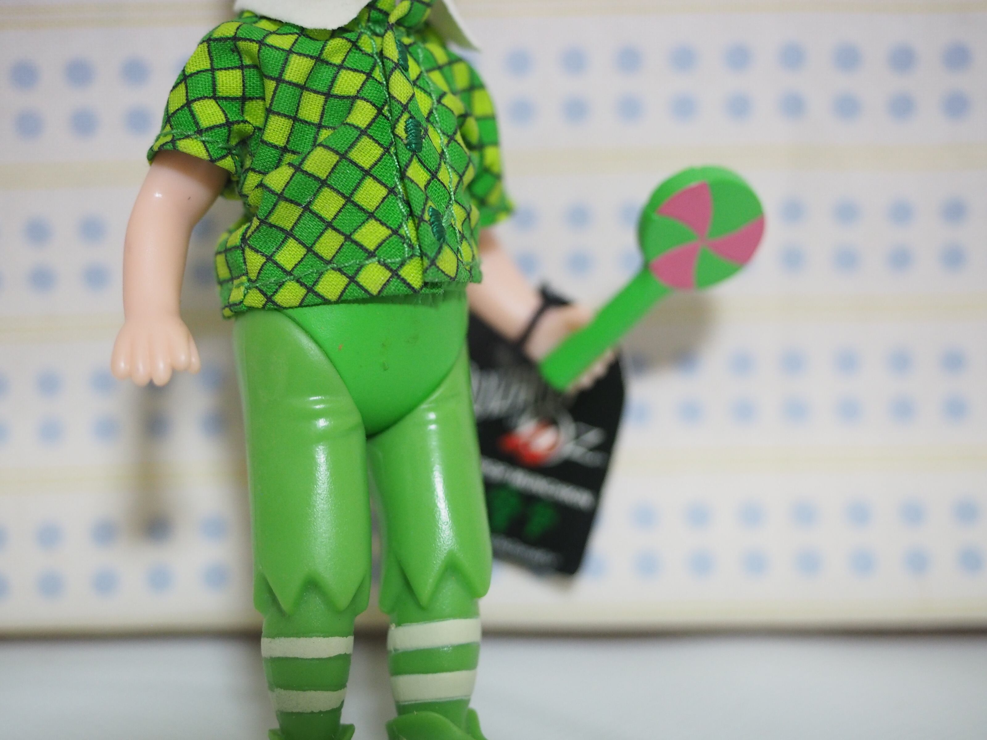 こちらのマンチキンはハッピーミールの中でも特に凝ったデザインです。頭ともみあげはくるんとカールしていて、困ったような眉の表情がたまりません。ロリポップを持ち、襟付きの柄シャツ、とんがり靴もおしゃれ。ウエストはちゃんとゴムのようなデザインです。起毛した襟にややくすみがあります。