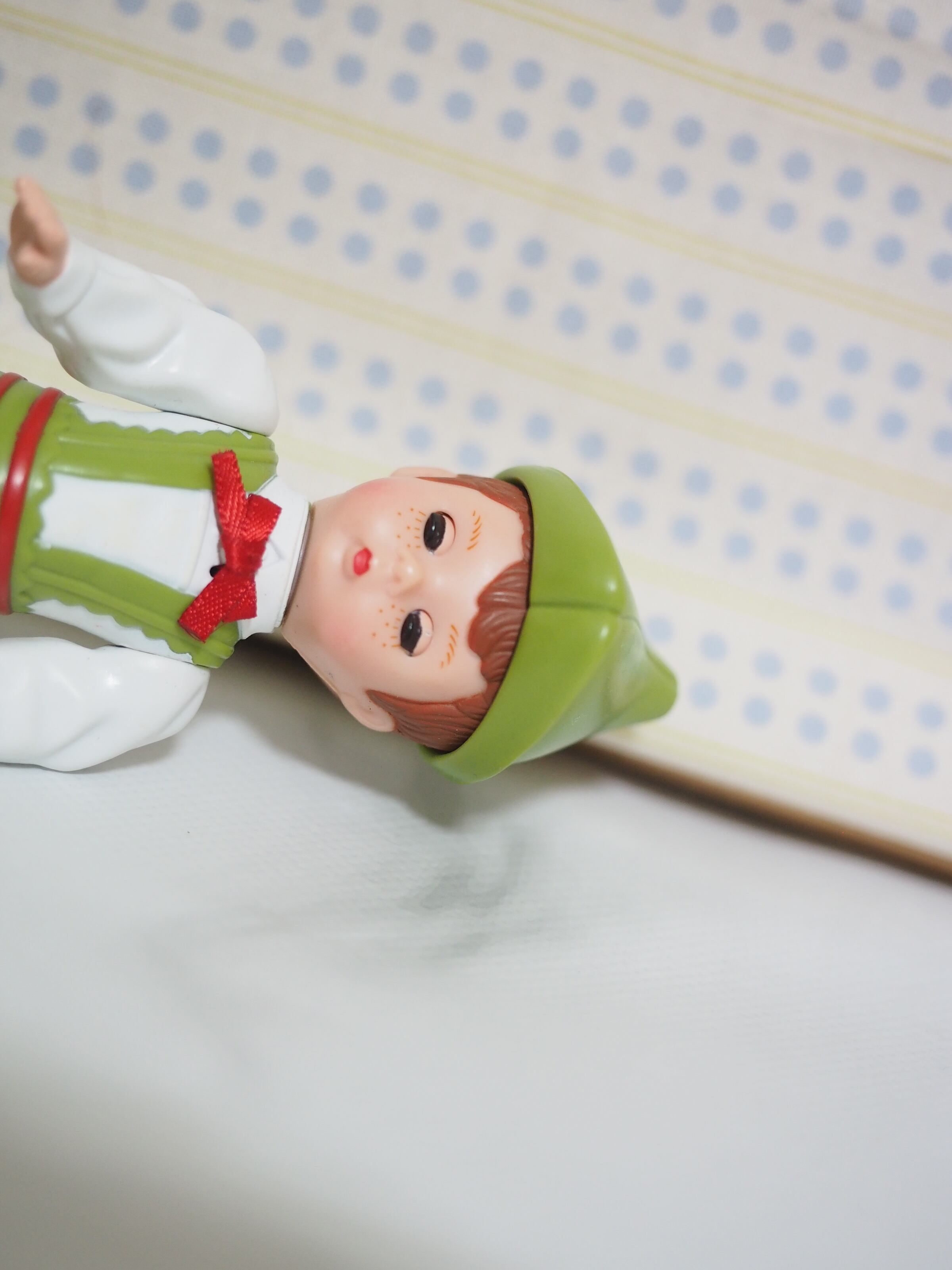 約13.5㎝の小さなサイズですが、ぽちっと小さな瞳が寝かせると閉じるスリープアイ仕様、首、腕付け根、脚付け根も可動します。座らせることも出来ます。(お洋服や帽子の付属品は取り外せません。)
