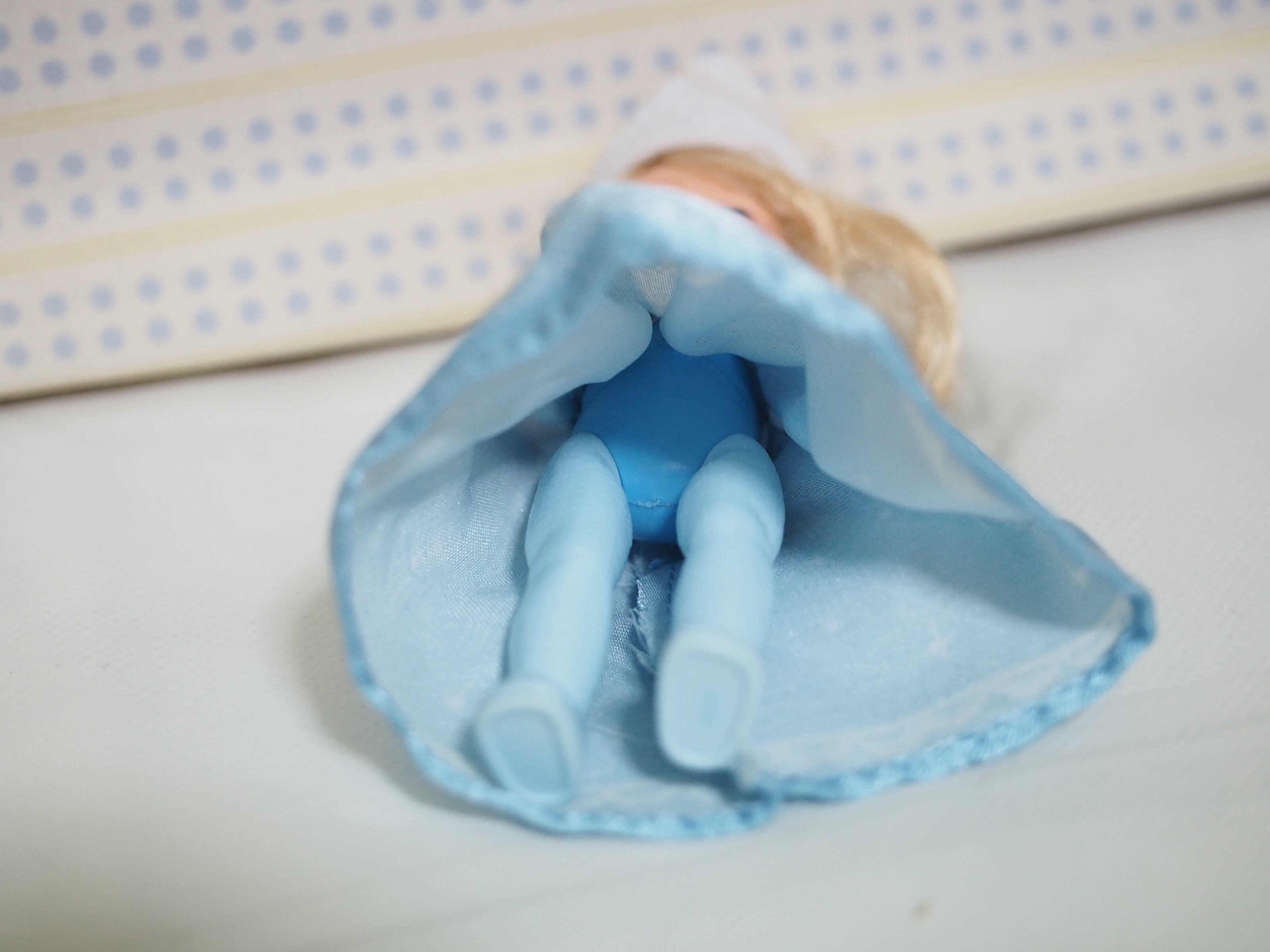 爽やかなライトブルーのドレスにレースとキラキラしたプリント、胸元もレースデザインになっています。王子さまは白い帽子、シンデレラは白いティアラでお揃いです。