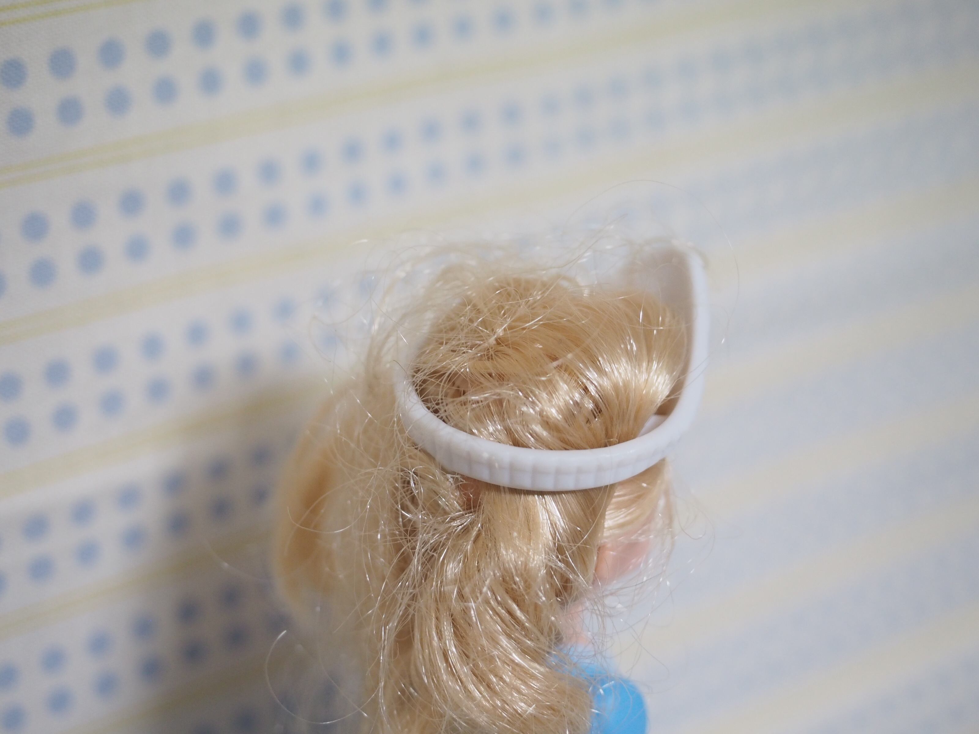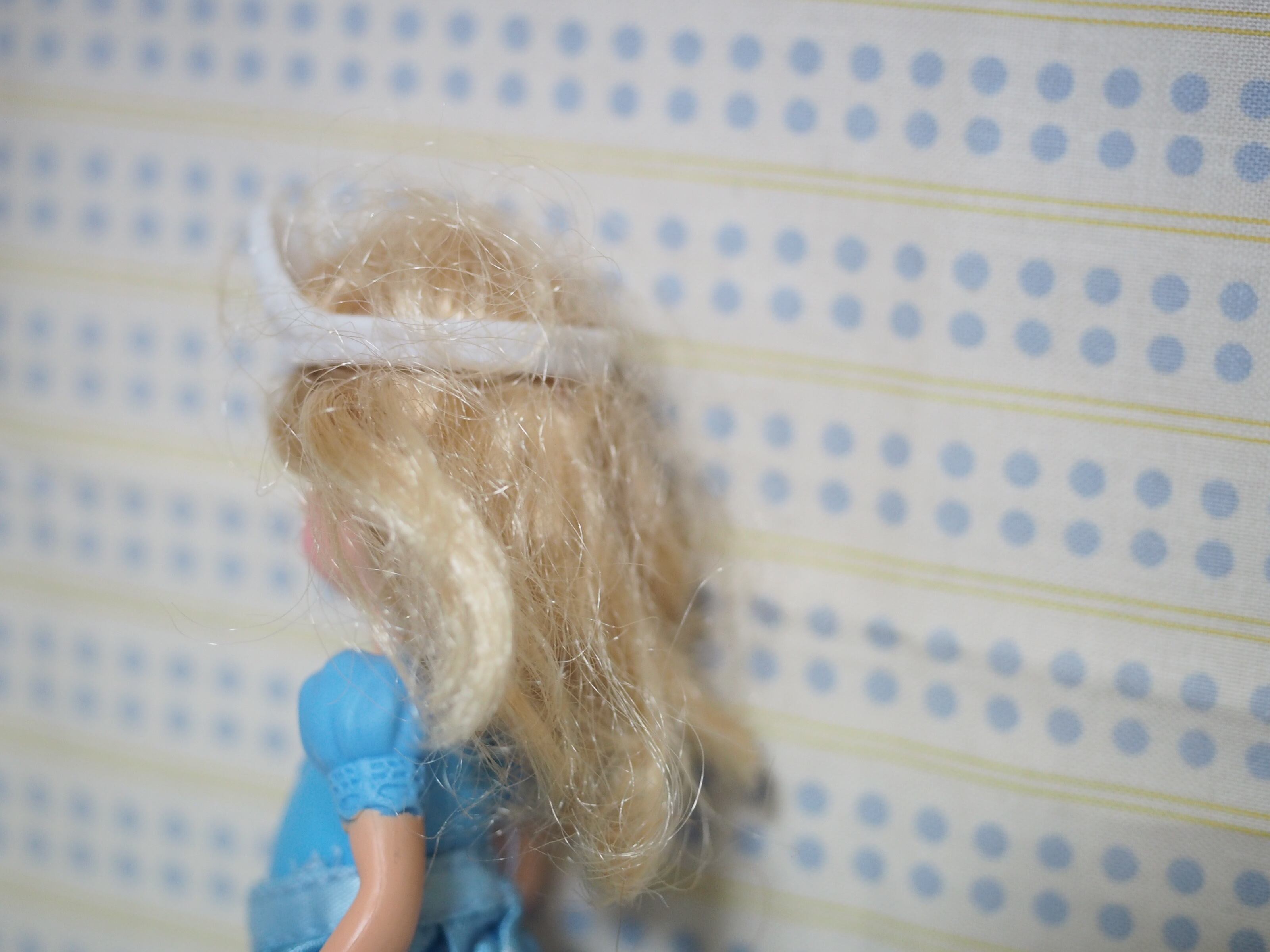 ブロンドヘアはティアラからはみ出し、乱れがあり、後ろ側の右手がやや薄く地肌が透けています。