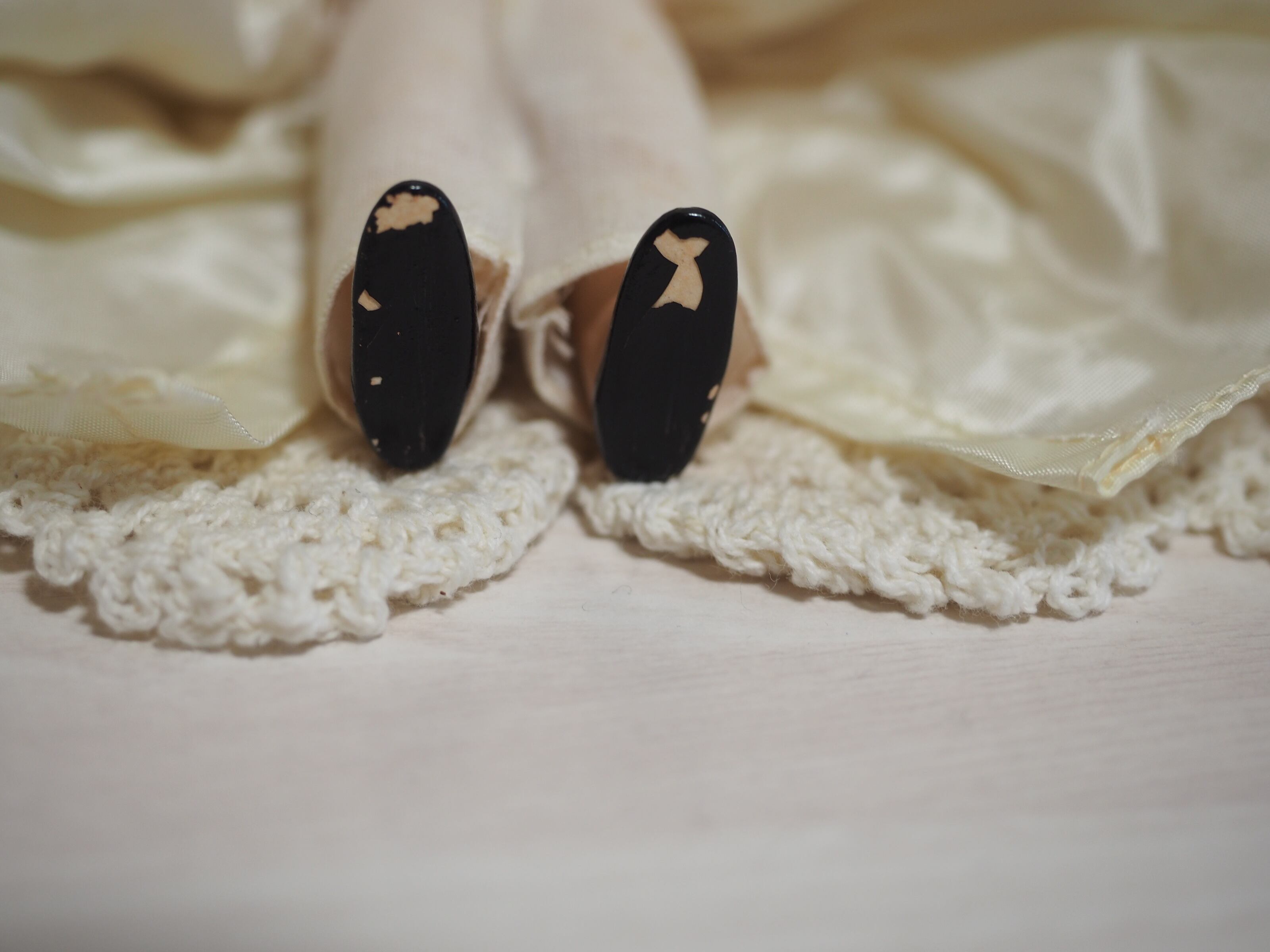 こちらのナンシーアンはドレスが安全ピンで留められており、スナップボタンの子よりも古いタイプです。