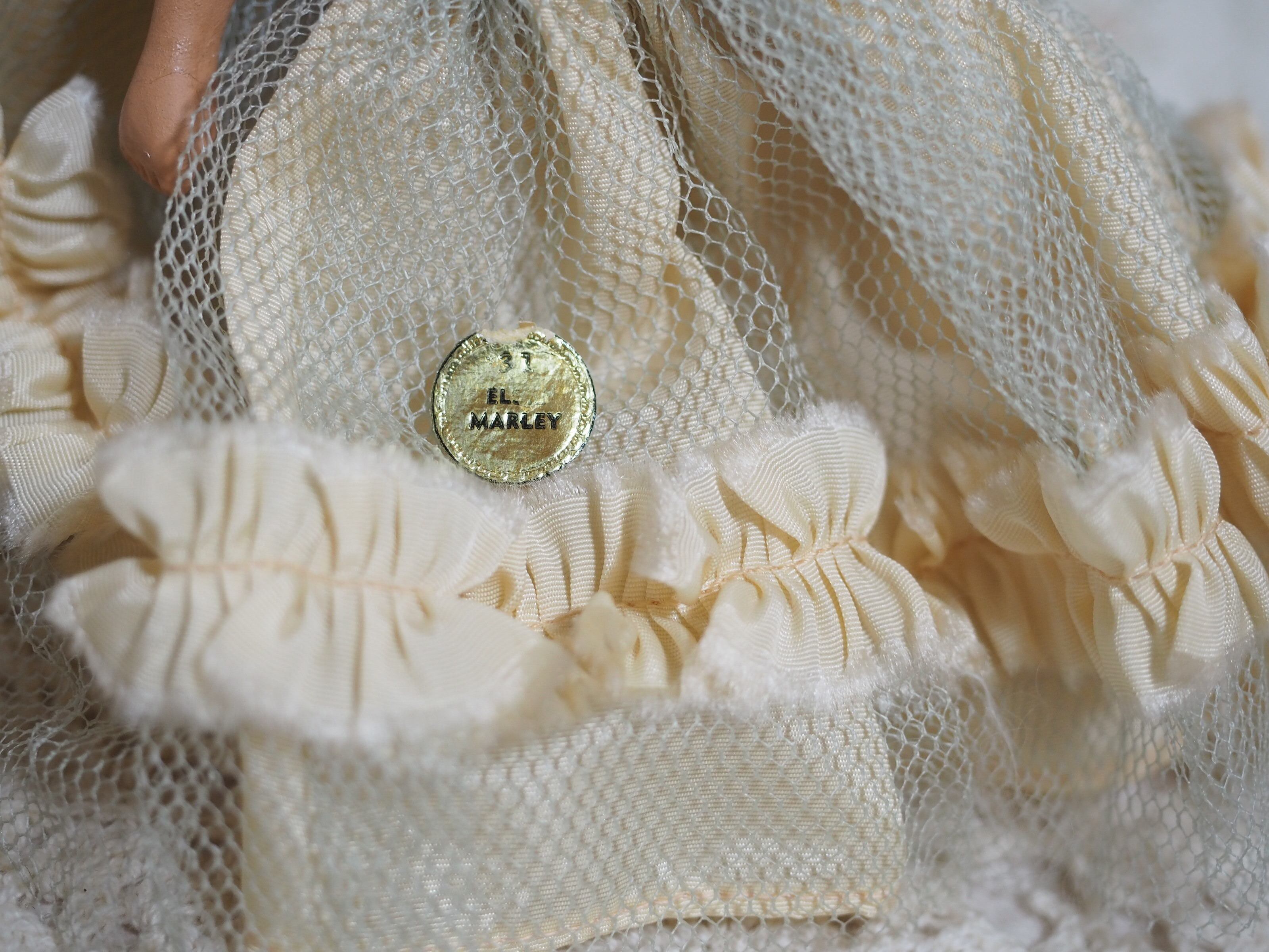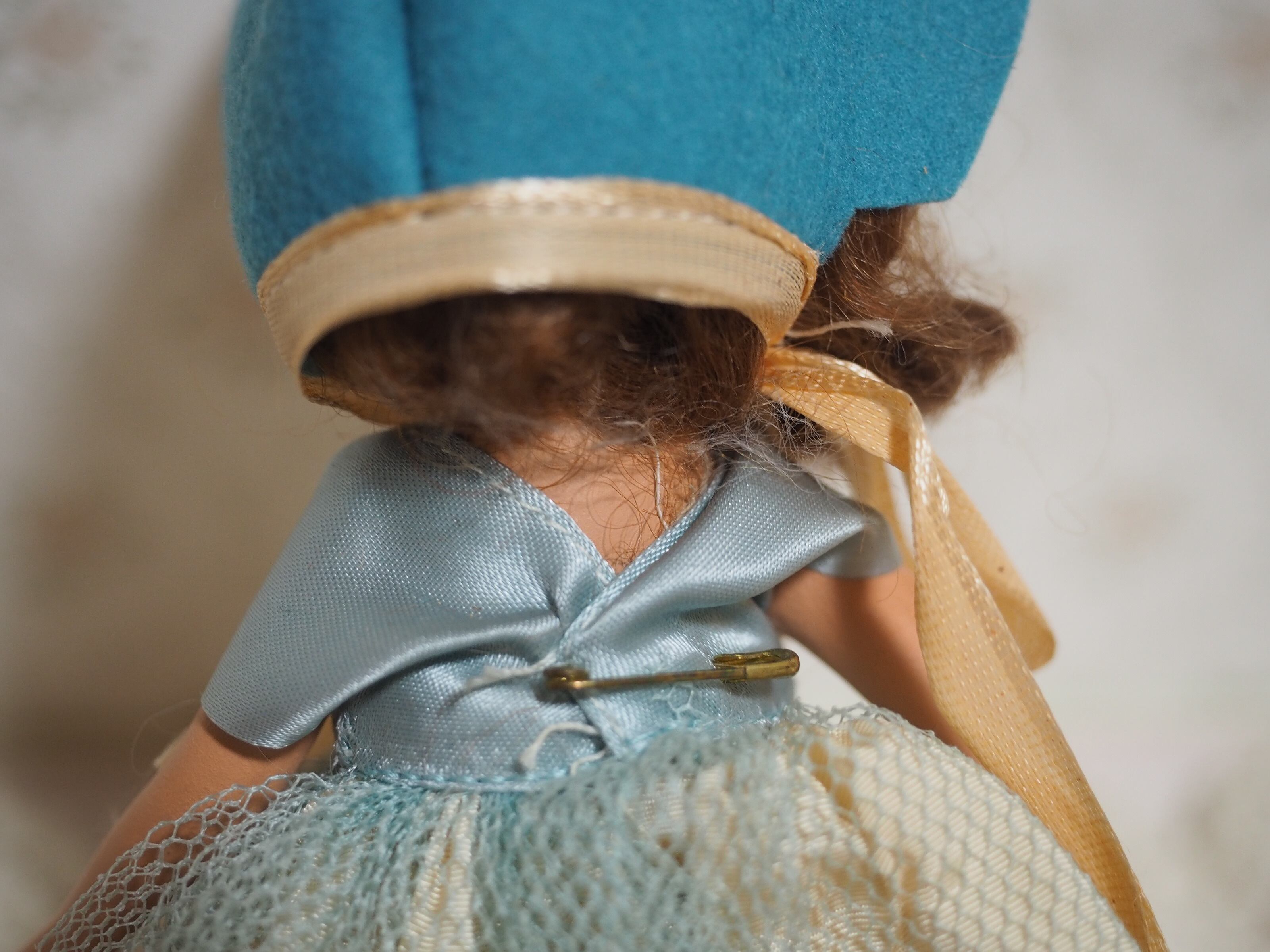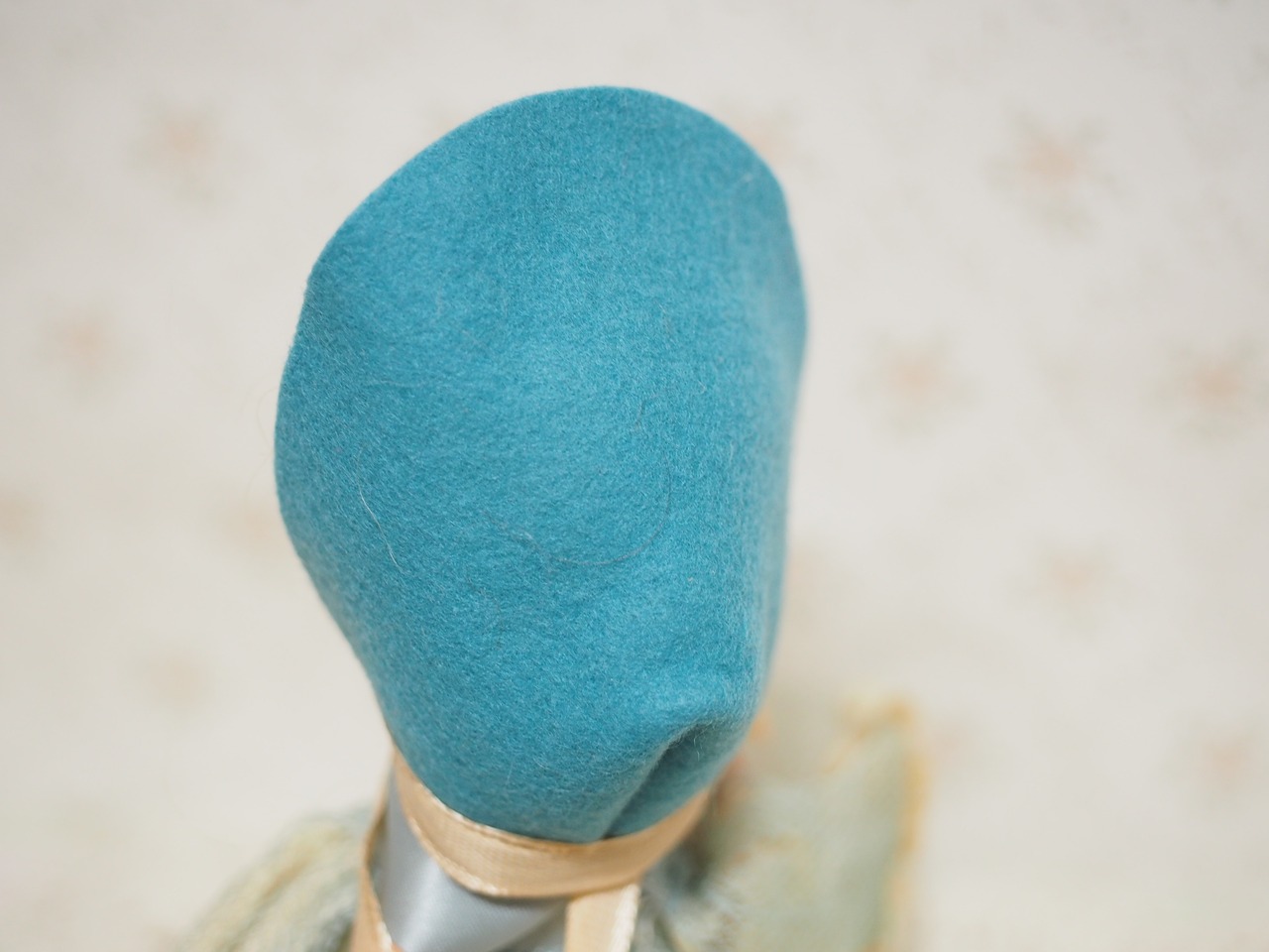ターコイズカラーのフェルトのボネにサーモンピンクのリボン、ベージュのスカートの上にターコイズのチュールが重ねられとてもおしゃれなドレスです。裾のフリルリボンは切りっぱなしです。チュールは前側の方が色が薄くなっていますが、ドレスともにシミ等見当たらず良好です。