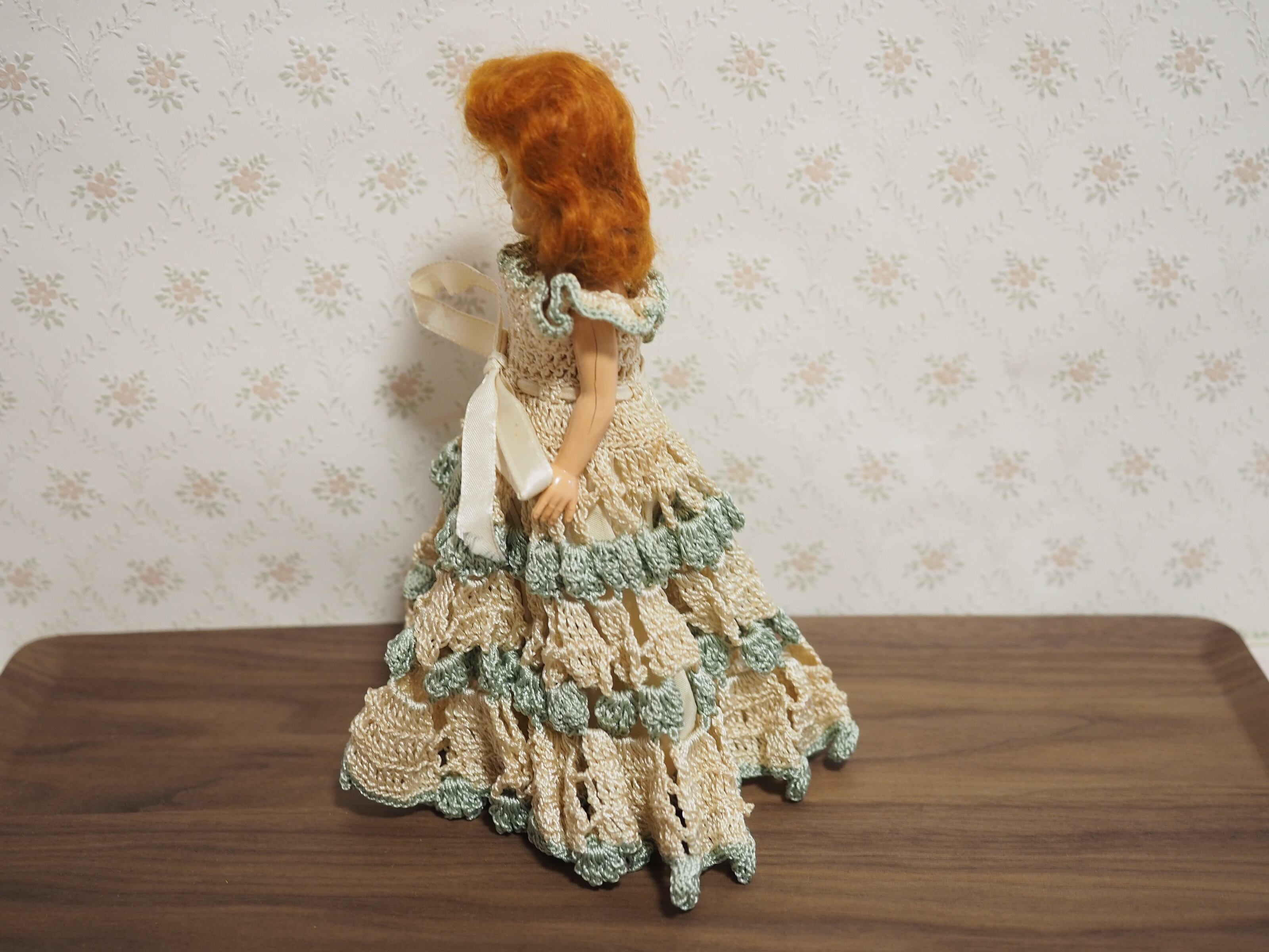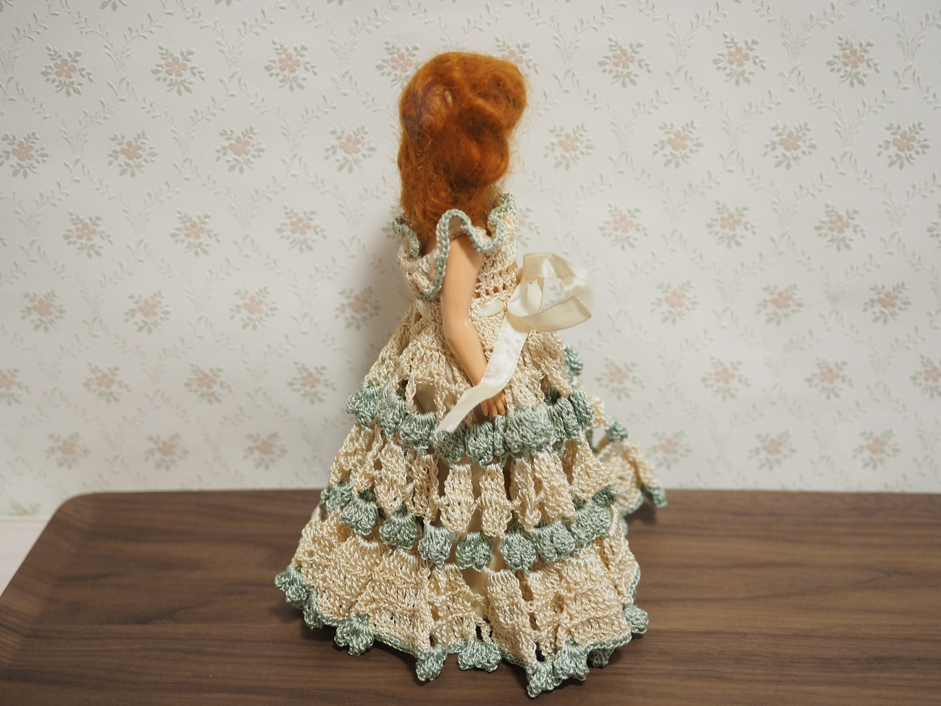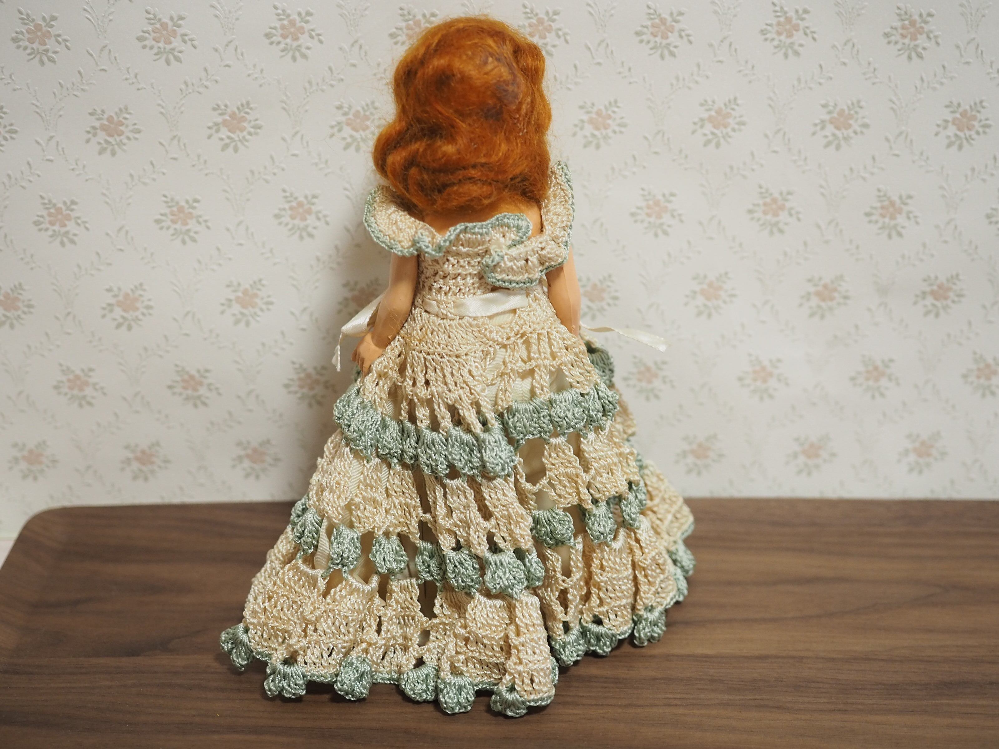 クリーム色とエメラルドの素敵なクロシェ編みのドレスと、お揃いの下着を付けています。裏地付き。