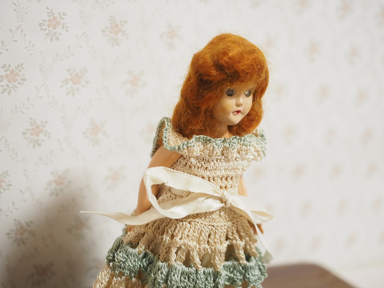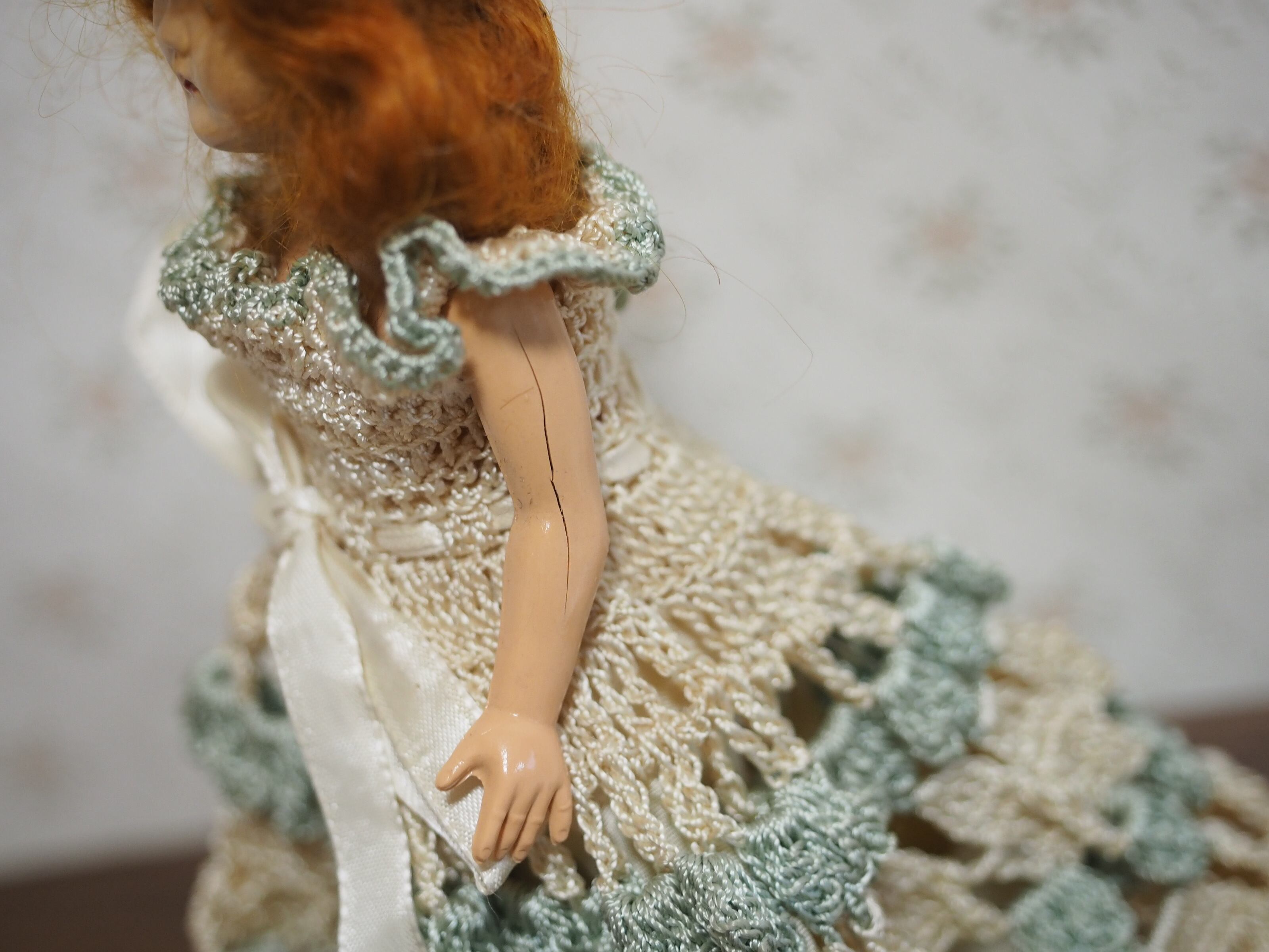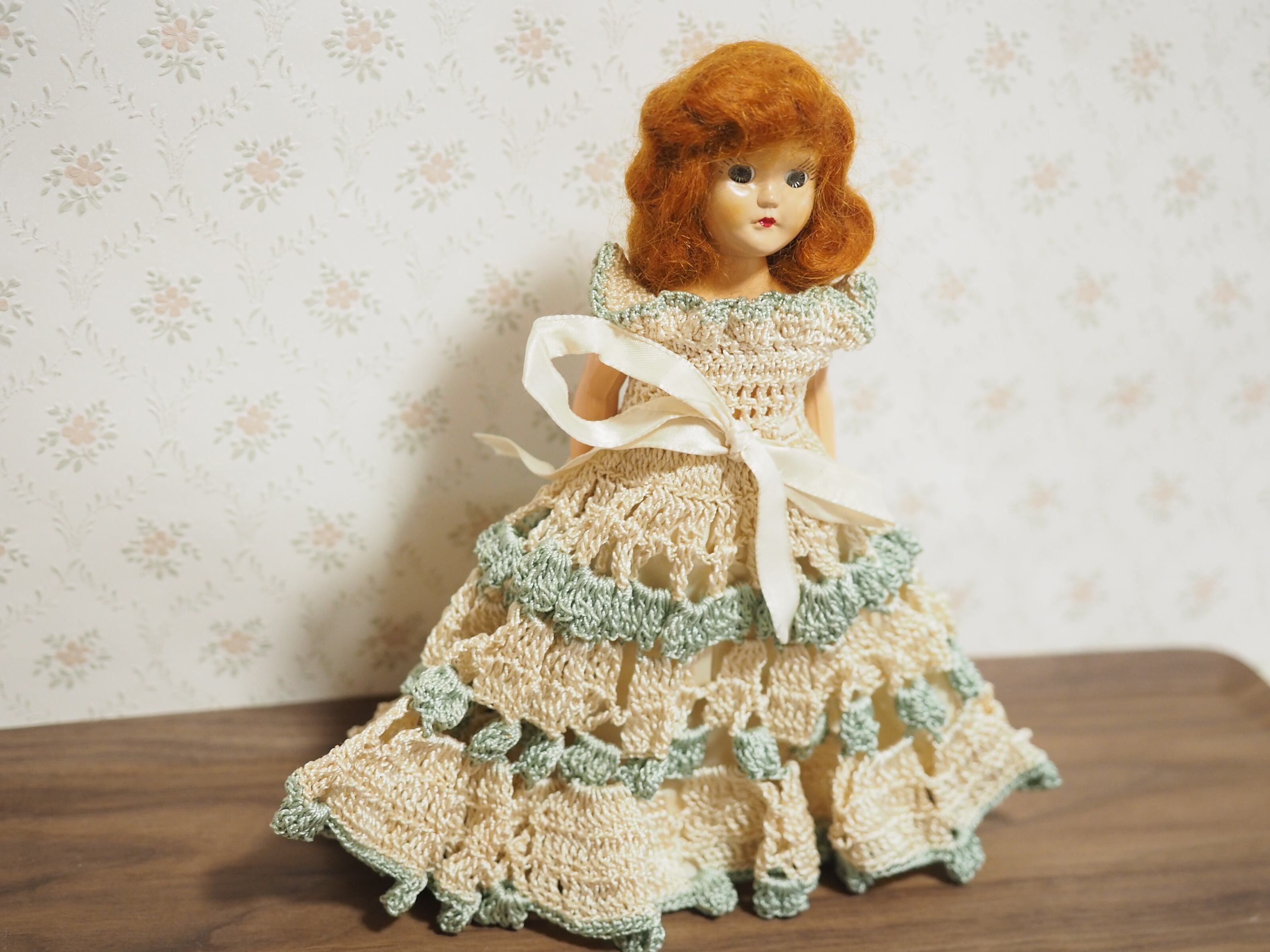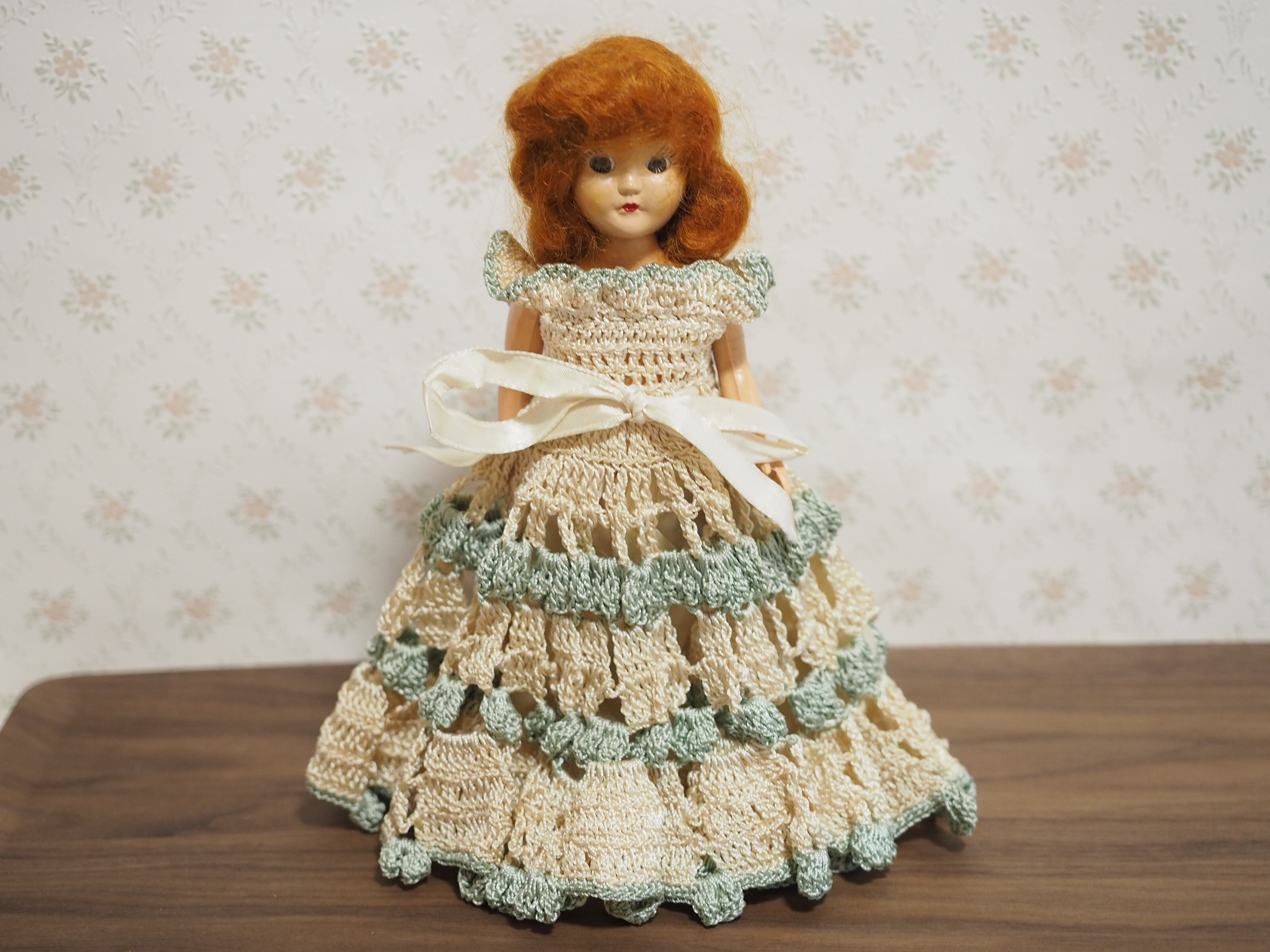 クリーム色とエメラルドの素敵なクロシェ編みのドレスと、お揃いの下着を付けています。裏地付き。