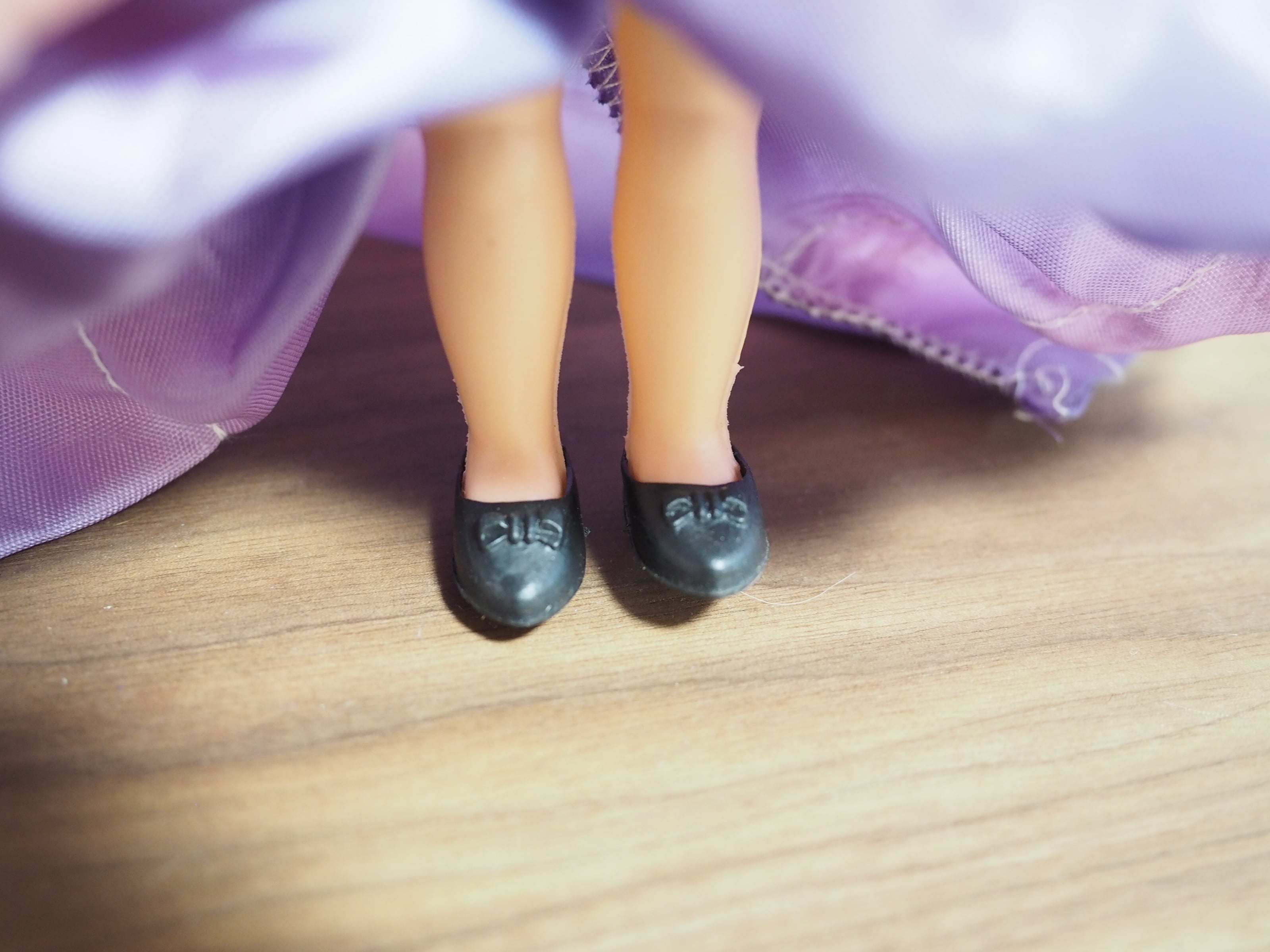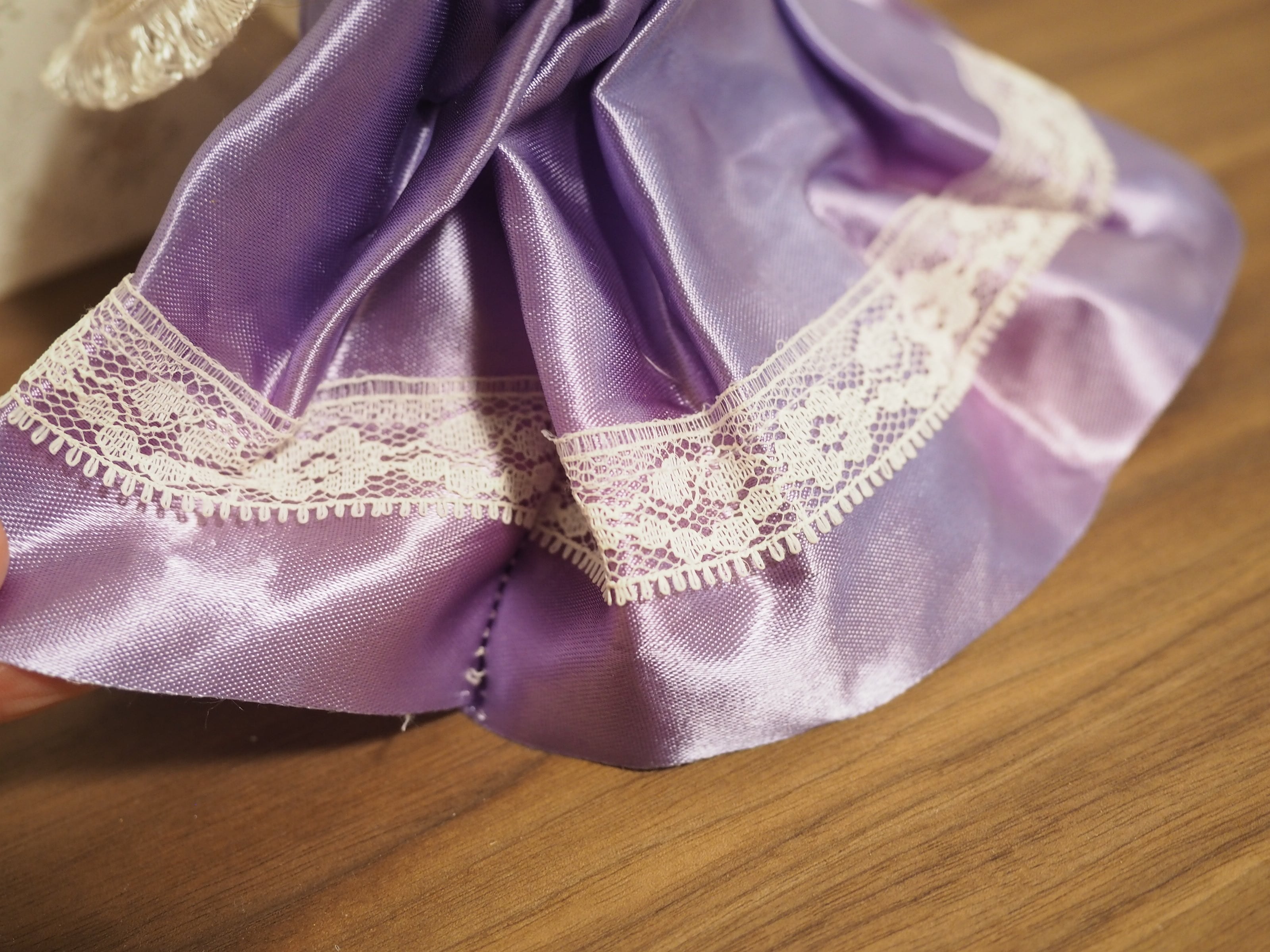 エプロンのレースに縁外れ、パープルのスカートに日焼けのようなムラがございます。