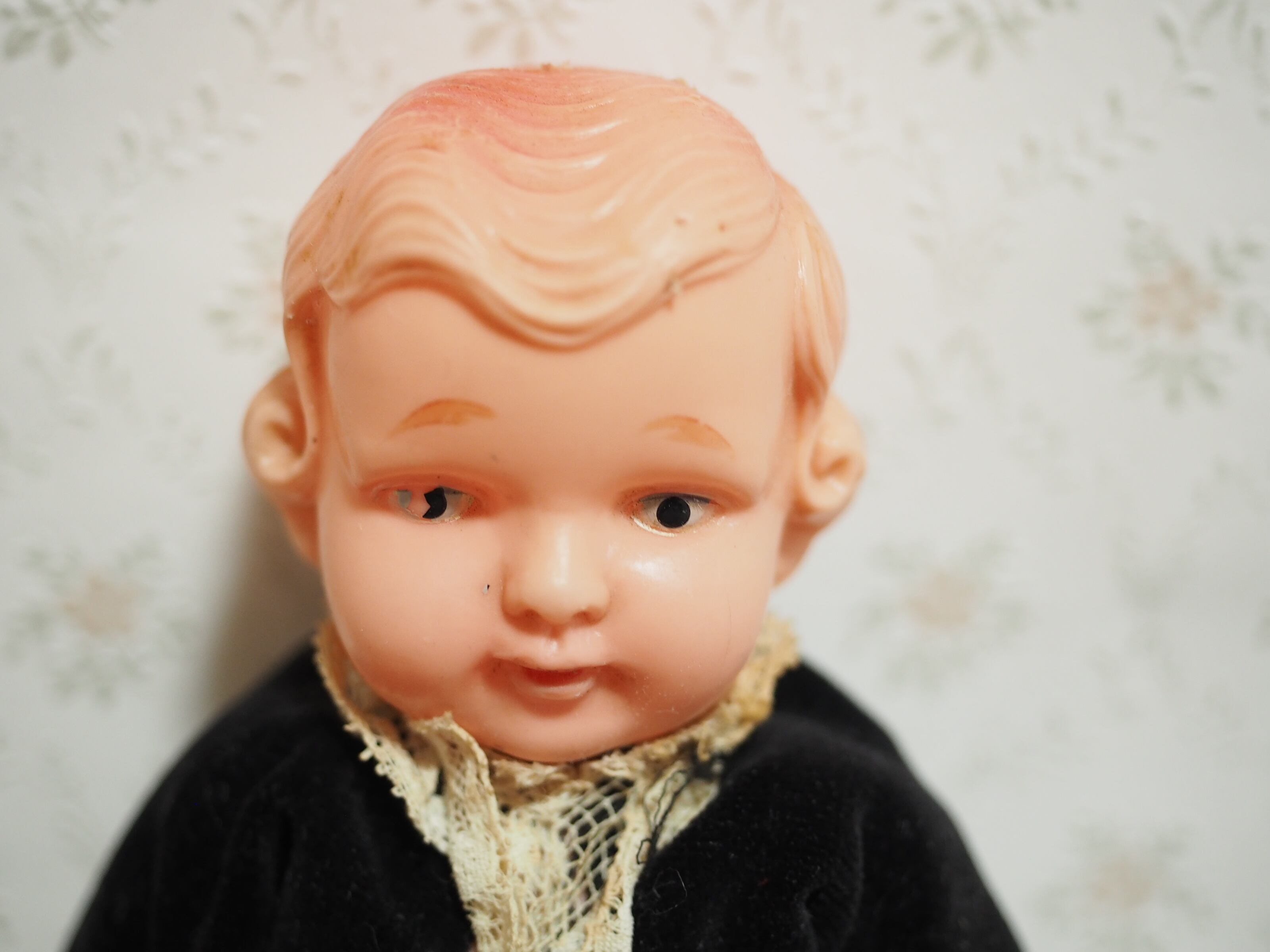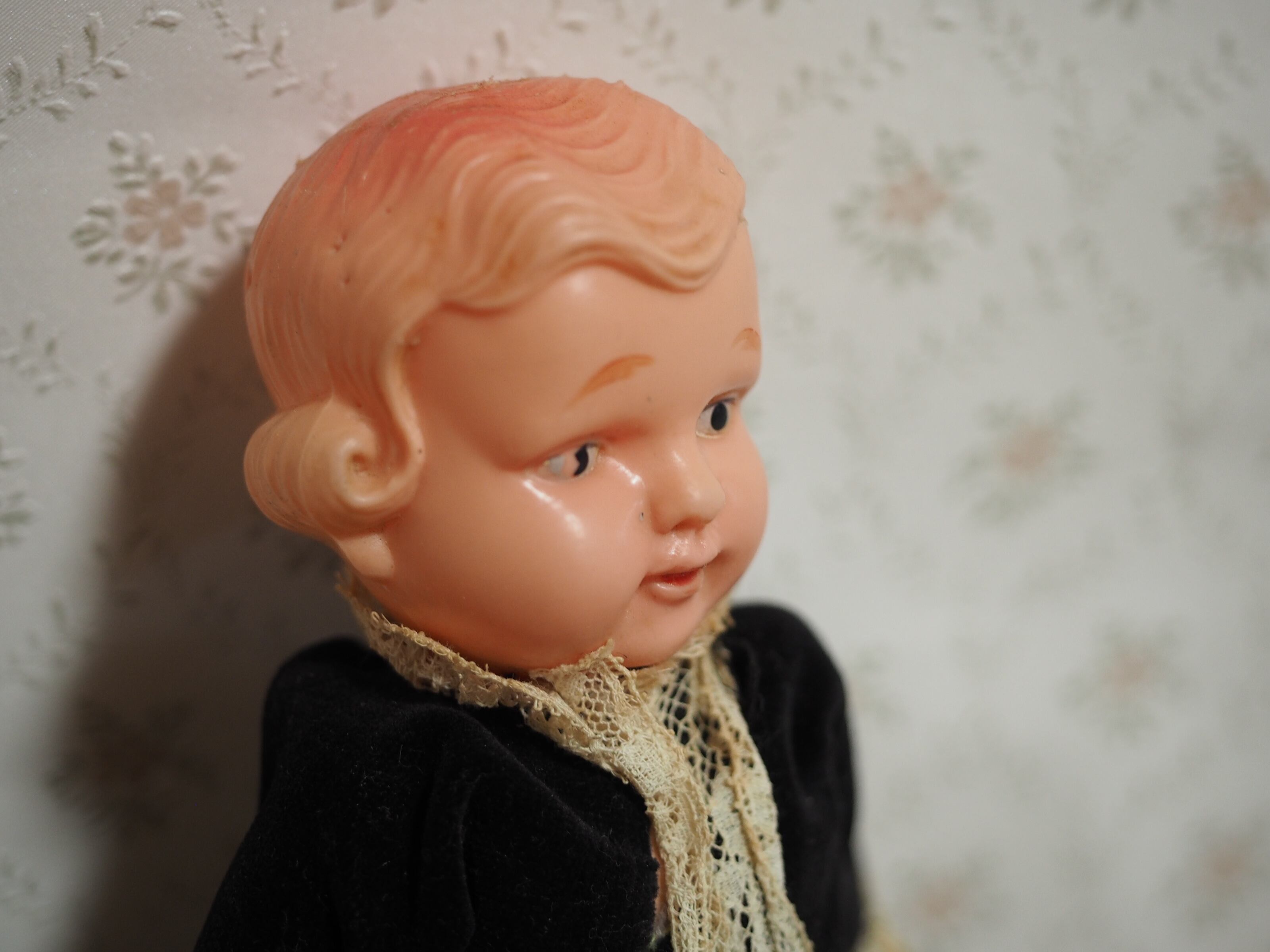 ぽってりしたお座り姿がかわいらしいお人形です。刻印等なし(ディスプレイ品は参考画像です)