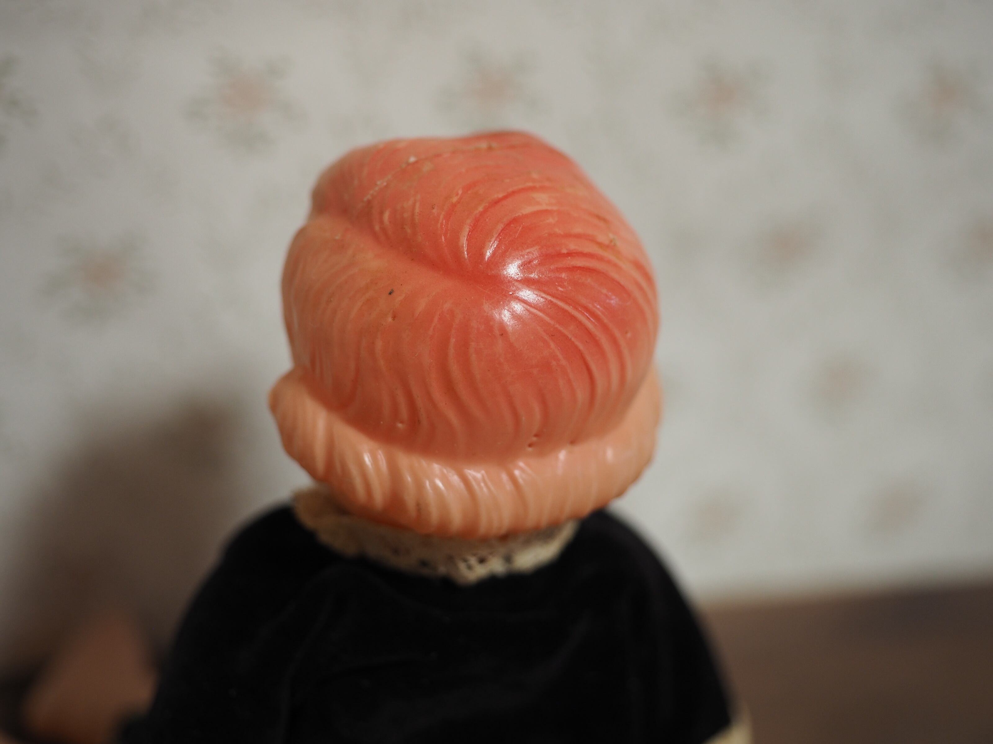 セルロイドのような見た目ですが、やや柔らかい薄いプラスチック空洞のボディです。ゴムが伸びていて足がぶらぶらなのですが、お座りすることが出来ます。後ろ姿もかわいいです。