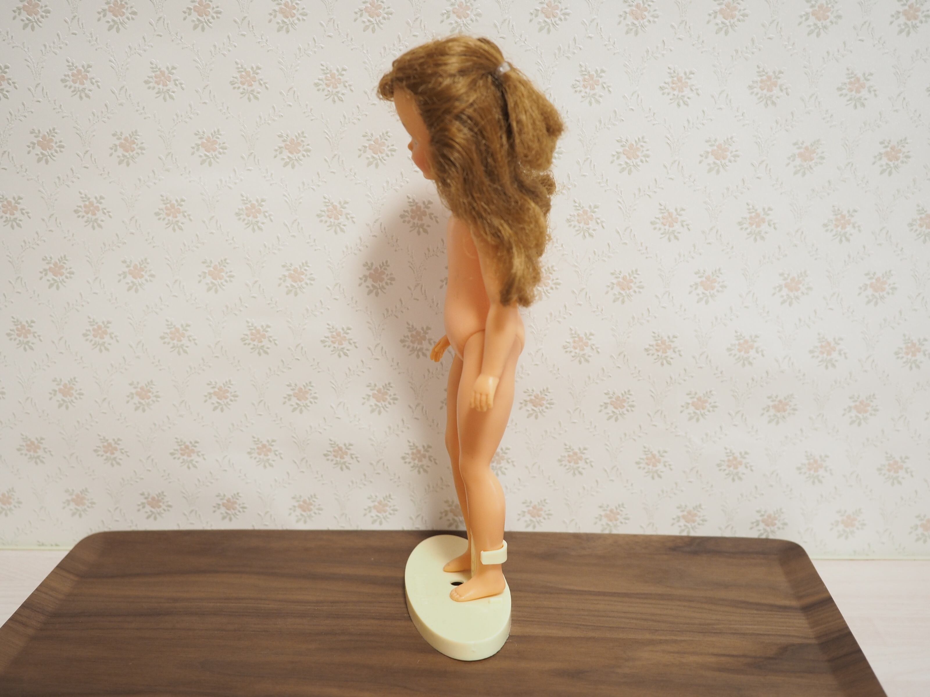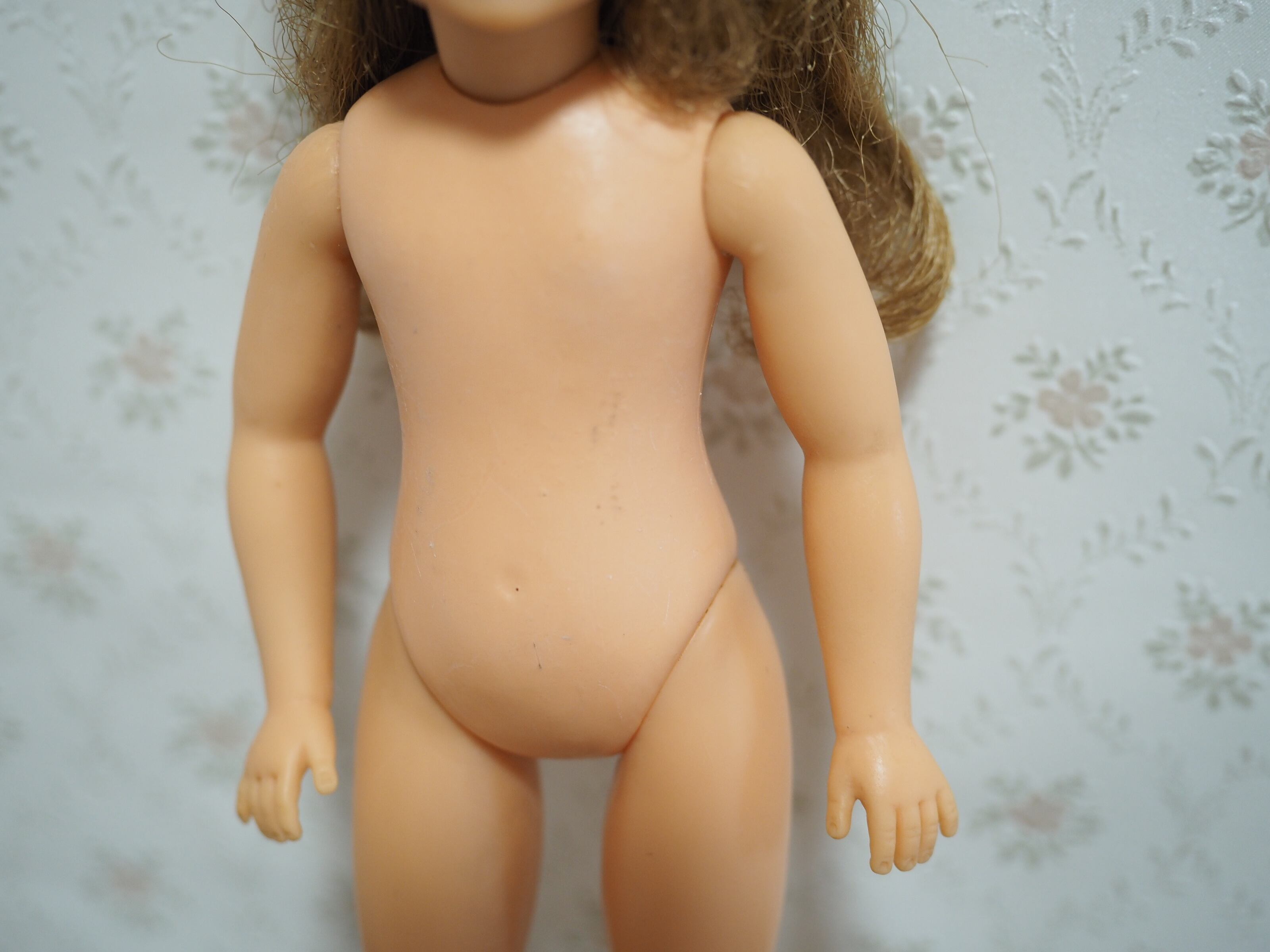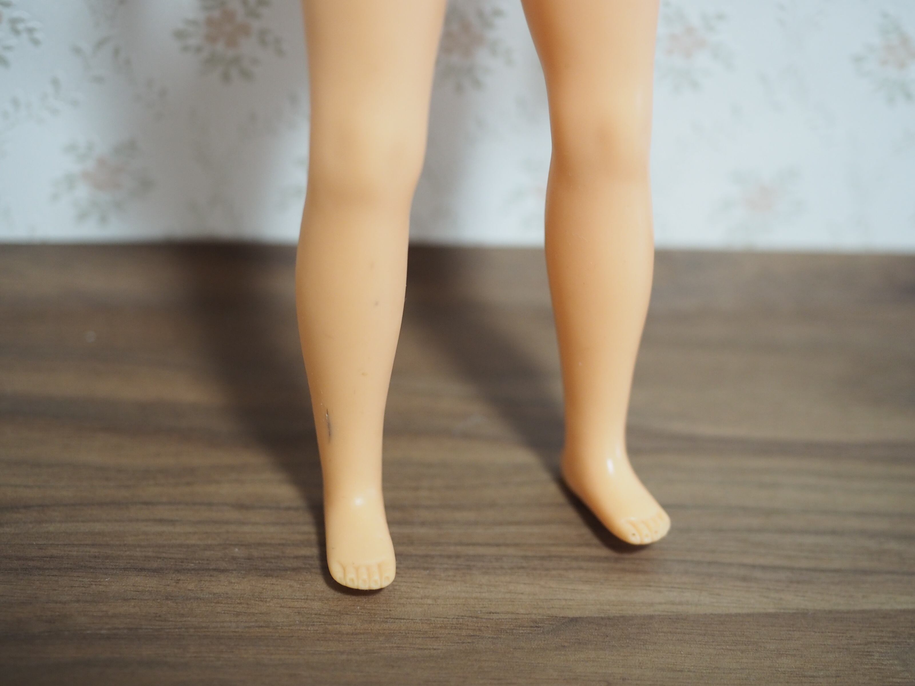 50年以上前に遊ばれたお人形ですので擦り傷等があります。胴体にくすみ、おへそ下に3ミリほどのキズ、背中にも擦り傷やピンのような穴があります。右足首付近に7ミリほどの黒い線傷がございます。