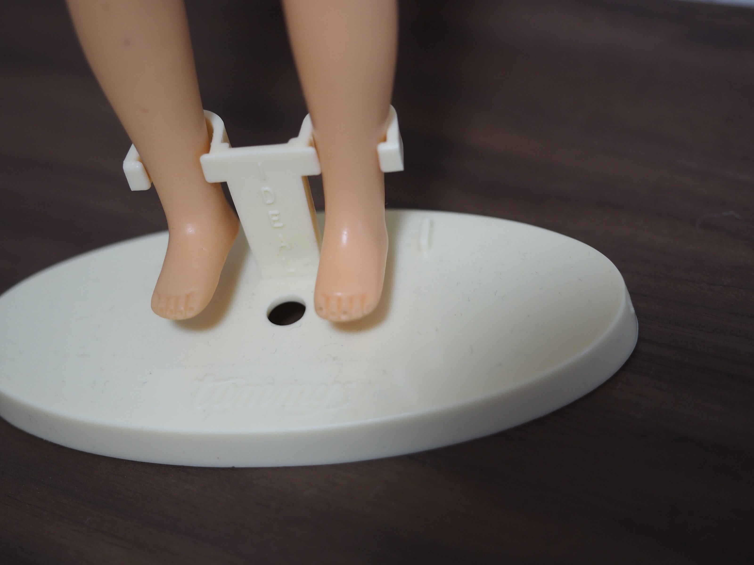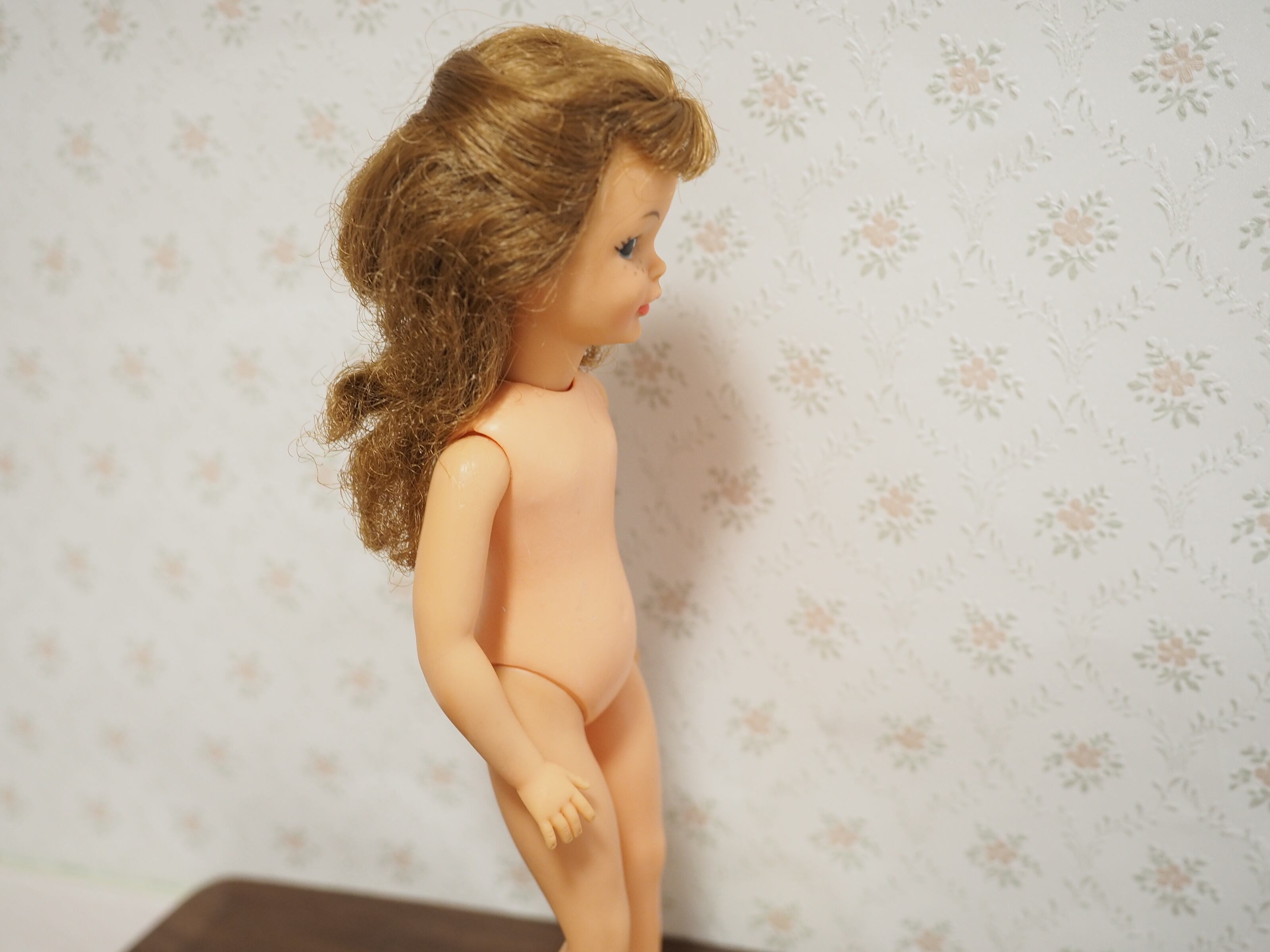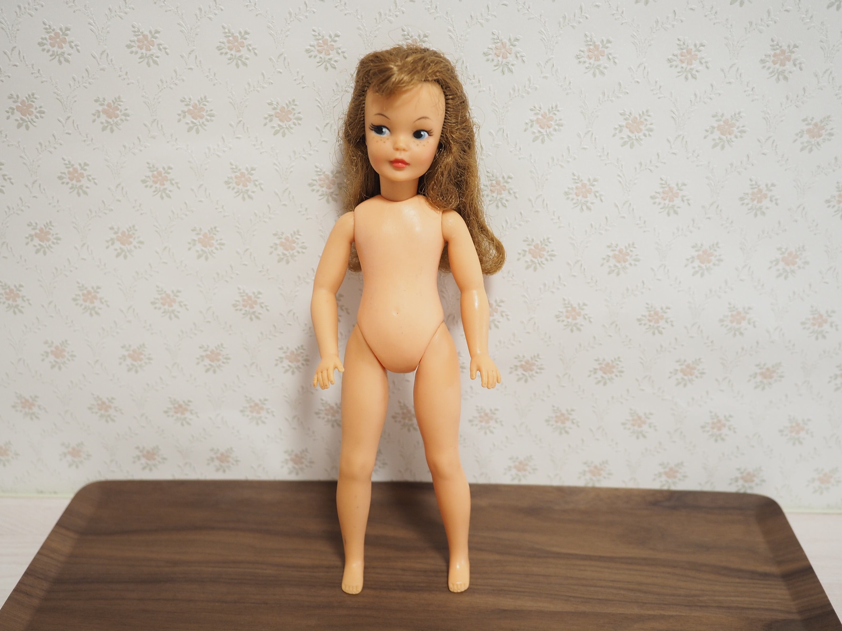 50年以上前に遊ばれたお人形ですので擦り傷等があります。胴体にくすみ、おへそ下に3ミリほどのキズ、背中にも擦り傷やピンのような穴があります。右足首付近に7ミリほどの黒い線傷がございます。