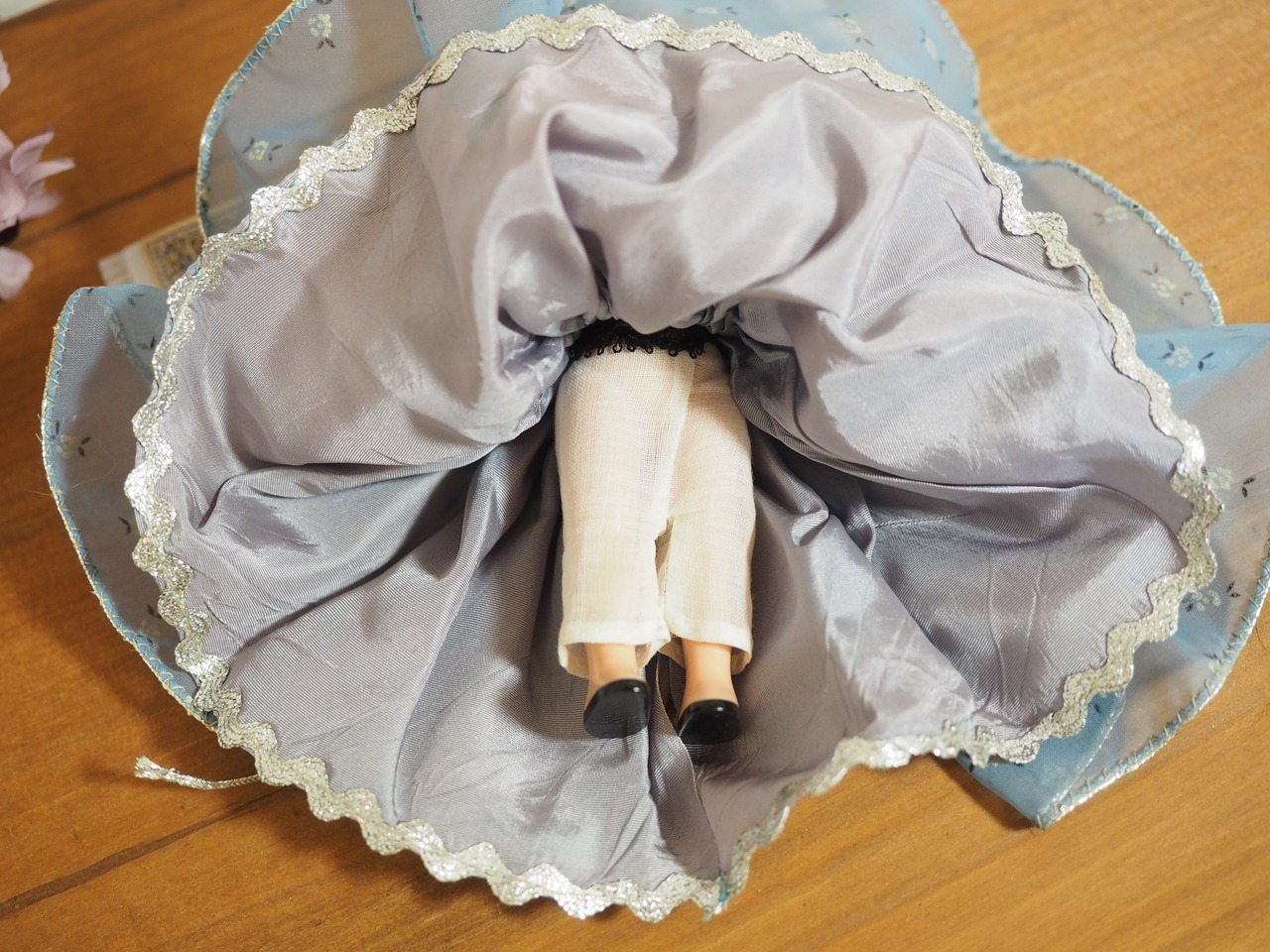 ドレスはオーガンジーのくすんだブルー地に花柄、裏地はブルーグレーで銀の縁取りが素敵です。分かりにくいですが所々ぼんやりしたしみと後ろ側に大き目の茶色しみがあります。