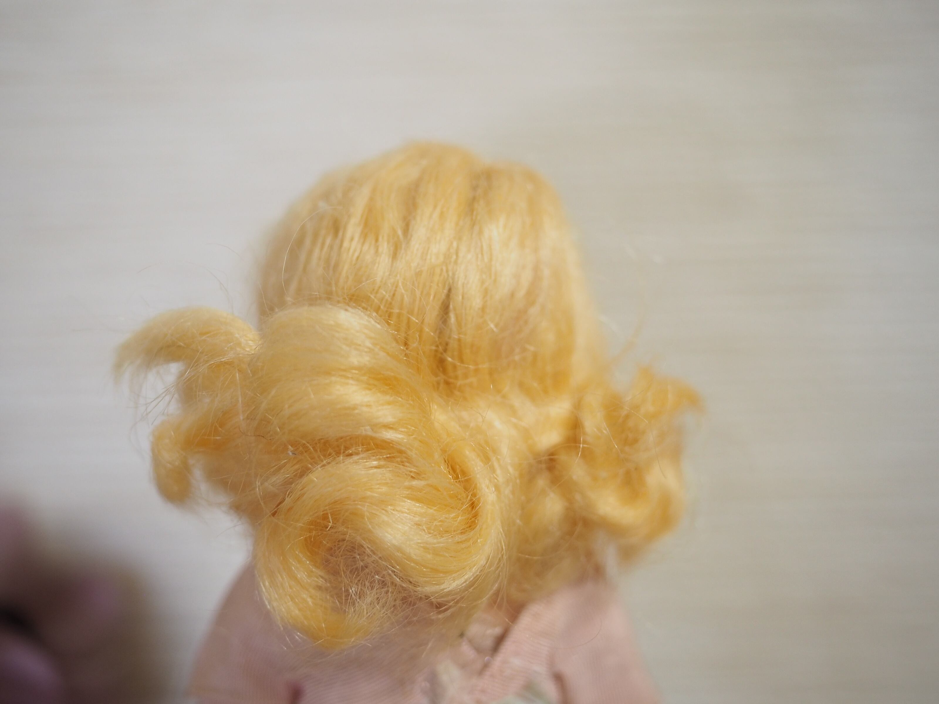 髪はモヘアウィッグで接着されており、ふわふわと少し乱れがありますが、お馴染みの額からウェーブのついたヘアがくるんとかわいいです。後ろ手にはね癖あり。