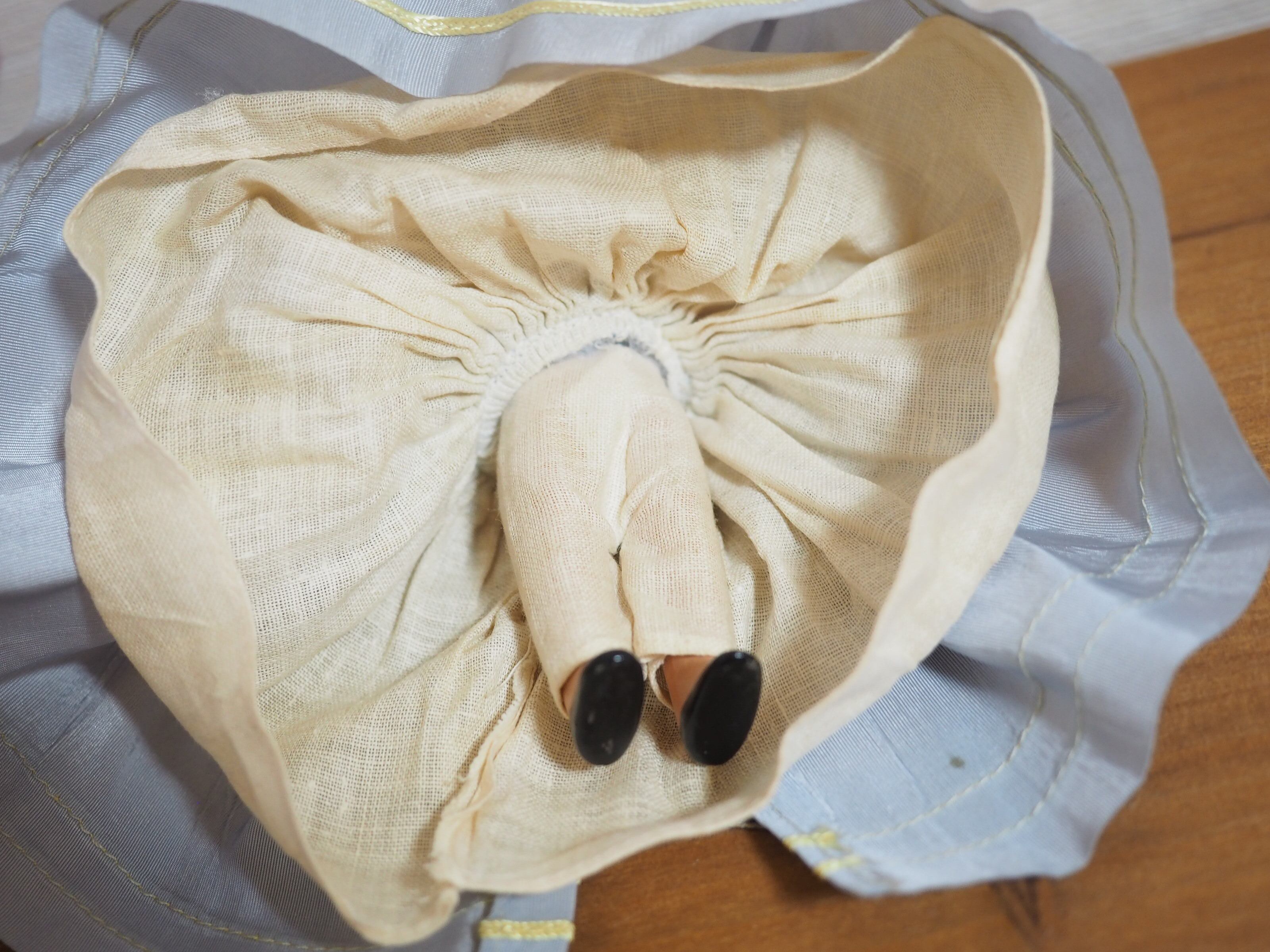 こちらのナンシーアンはドレスが安全ピンで留められており、スナップボタンの子よりも古いタイプです。
