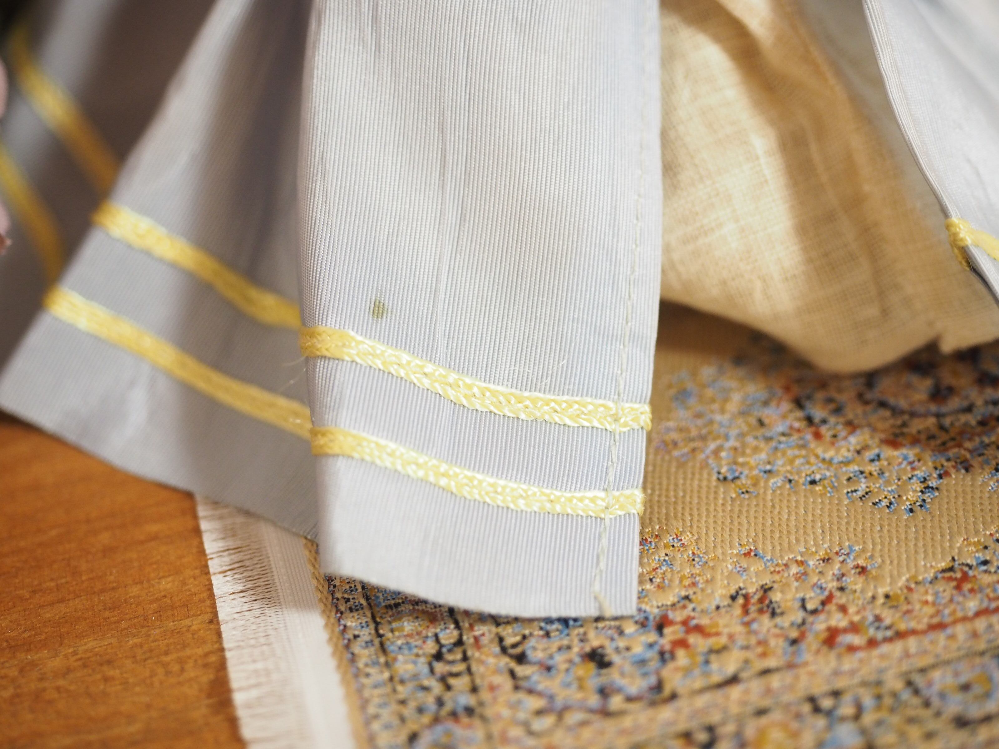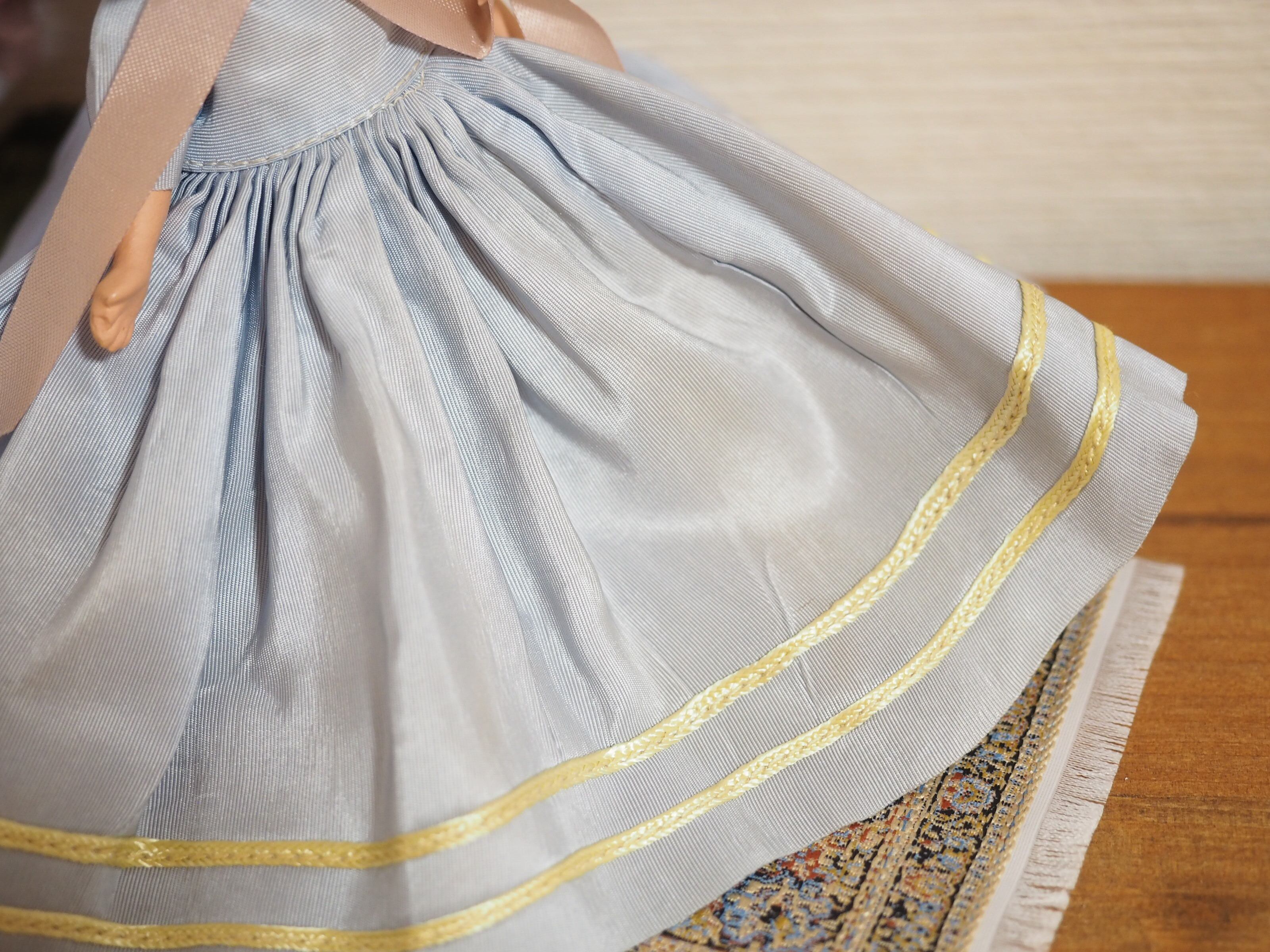 淡い水色のワンピースは全体的に焼けのような変色、後ろに点しみがございます。黄色の2本のリボンがおしゃれです。絵画に出てきそうな雰囲気のあるナンシーアンです。
