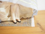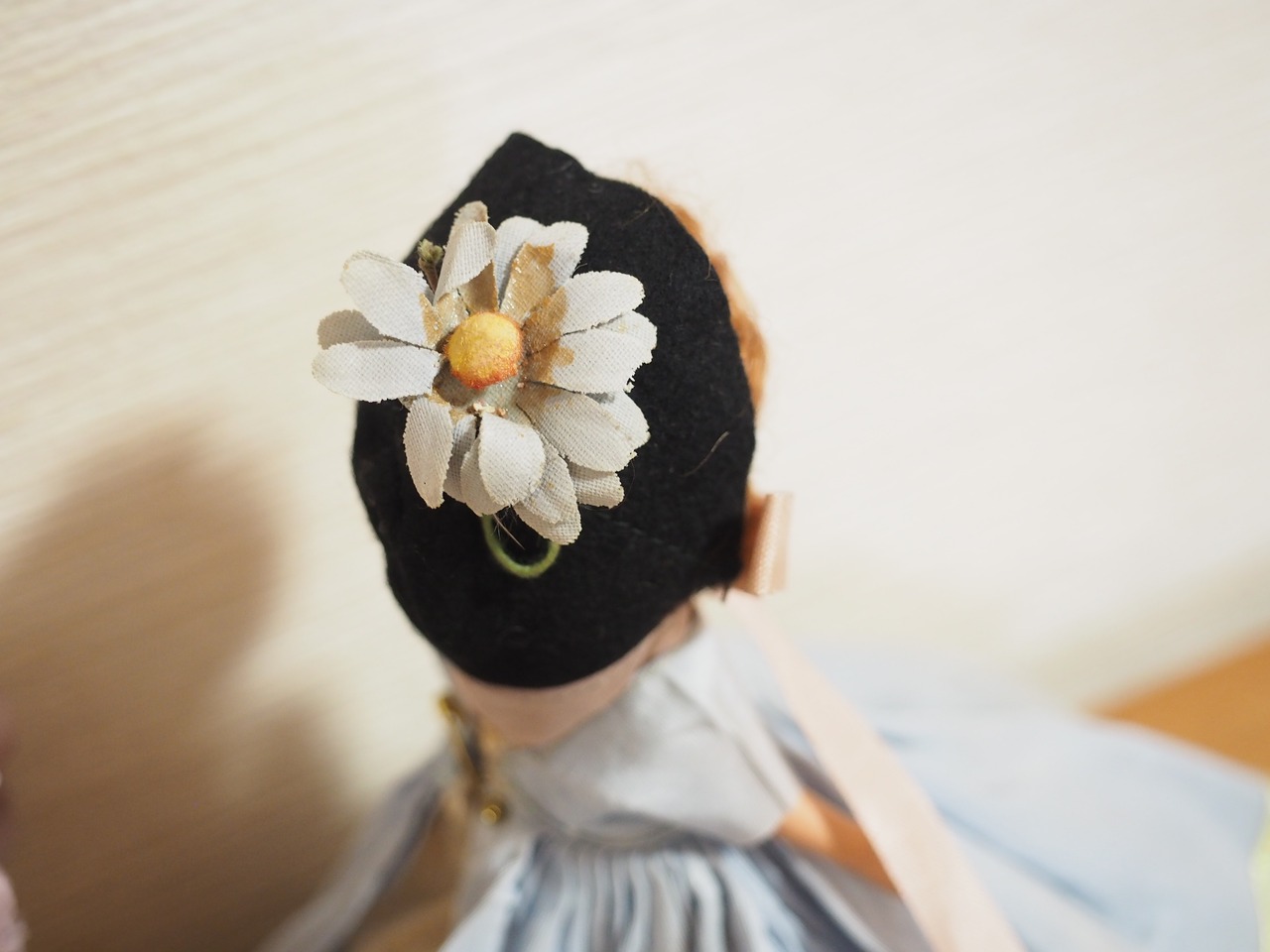 黒いフェルトのボネにアンティークなブルーの花飾り付き、お花に接着剤の付着があります。