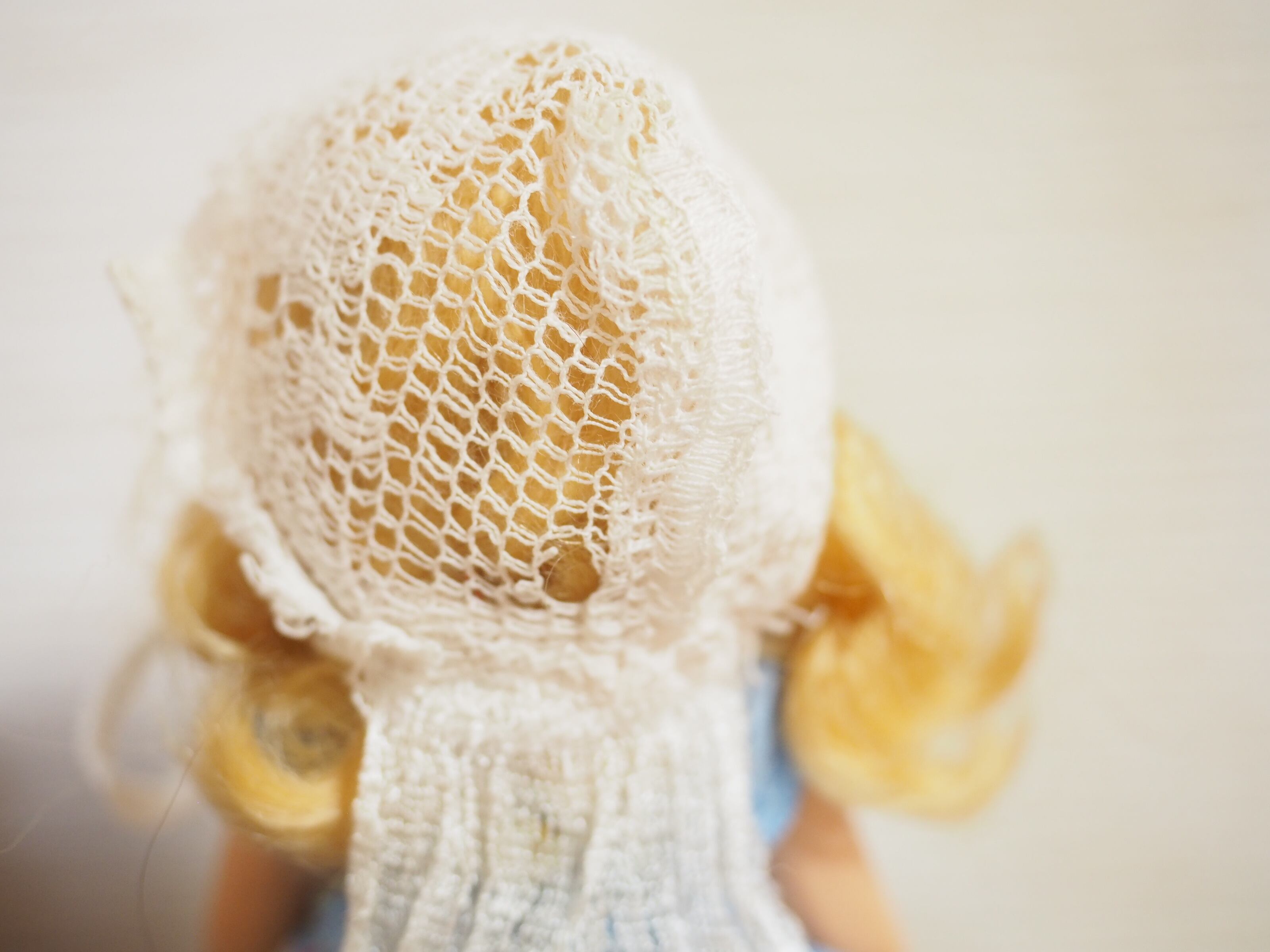 ドレスはブルー地に細かいドット、白いハートとつぼみの組み合わせがかわいいです。白いレースとレース編みの頭巾と後ろに伸びたベールがポイント。とてもやわらかい素材で頭巾とベールに穴がございます。