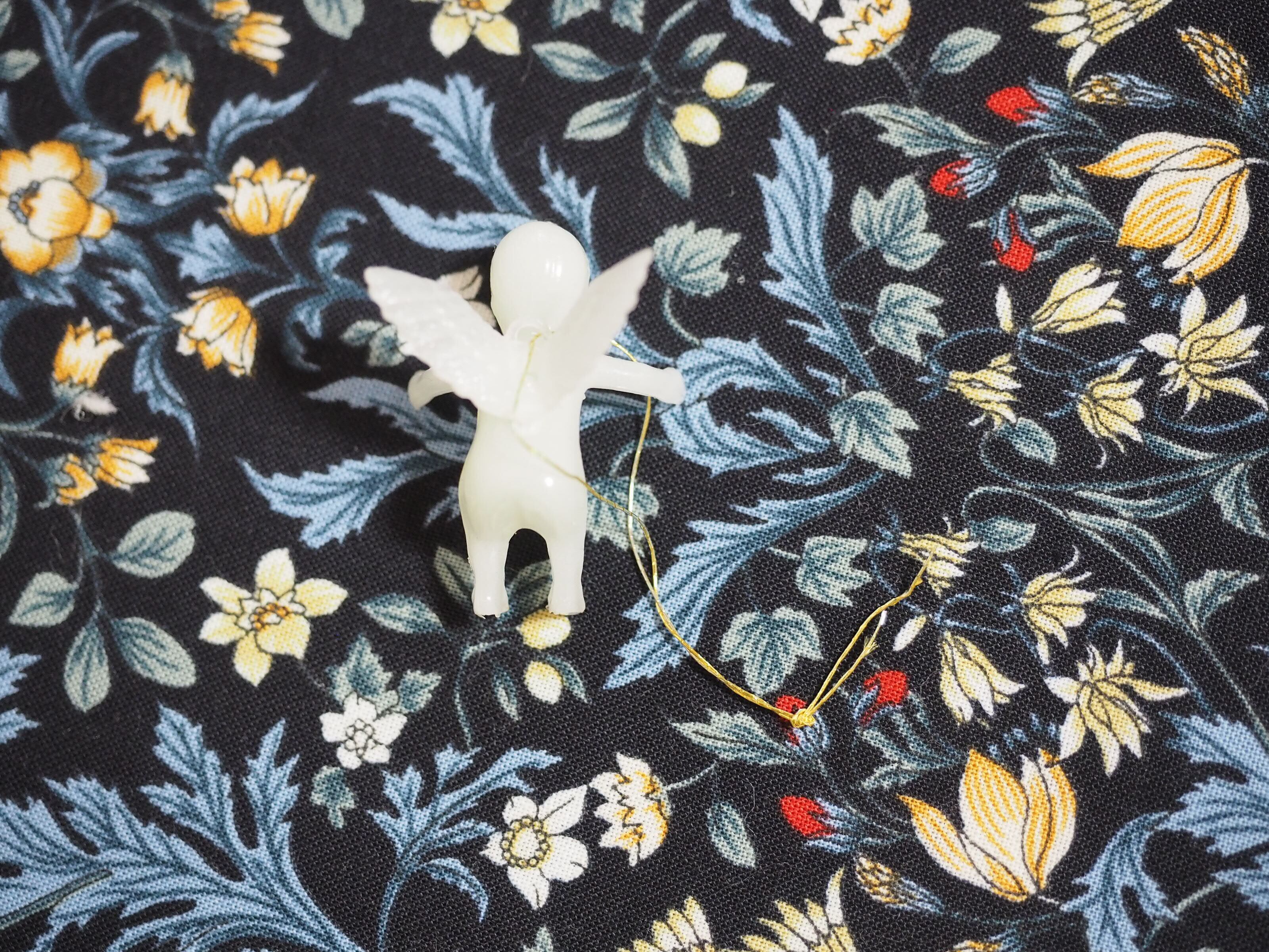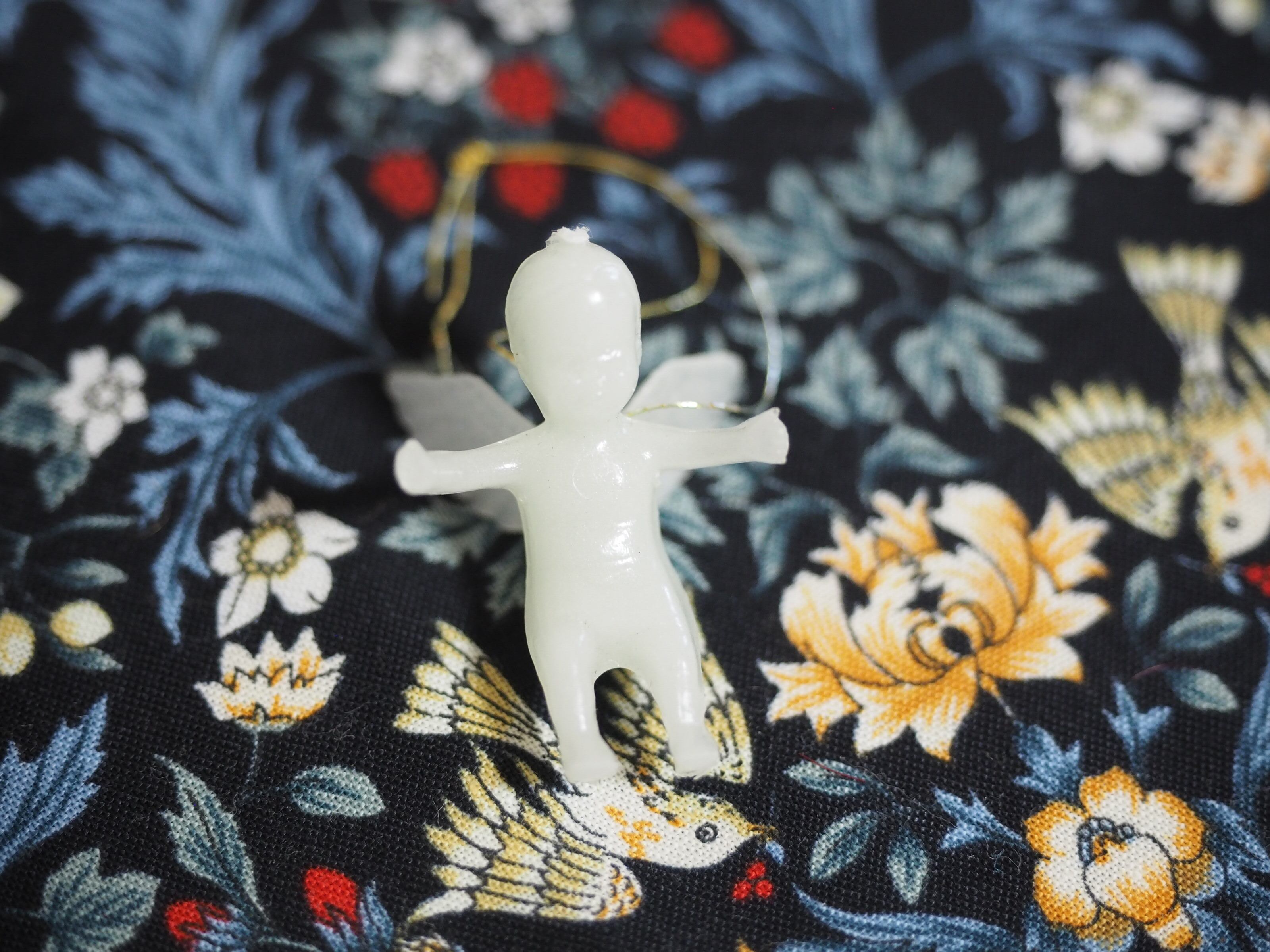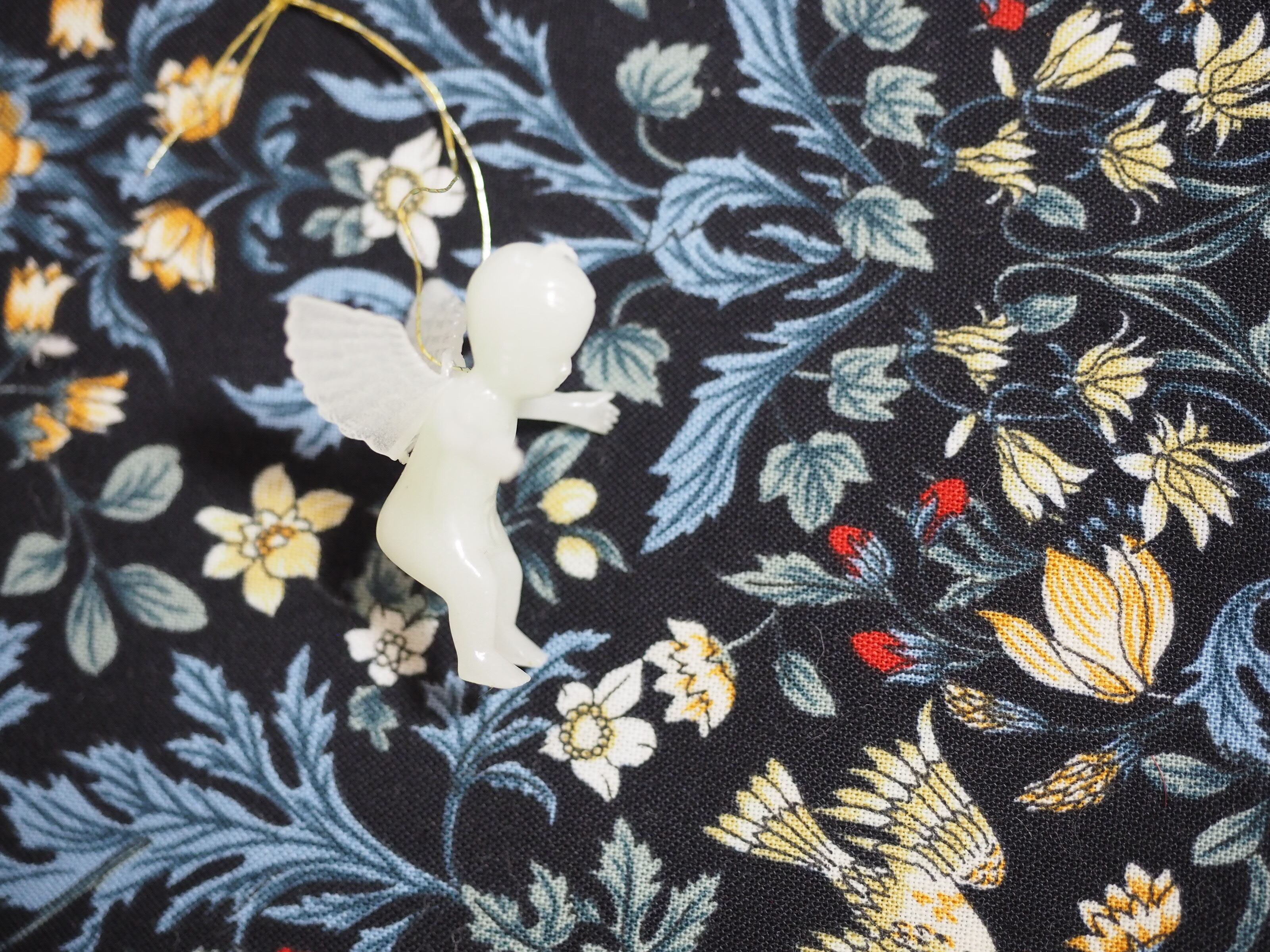 薄くグリーンがかった天使の人形は細い飾り用紐付き、蓄光で暗い所で光ります。プラスチック製