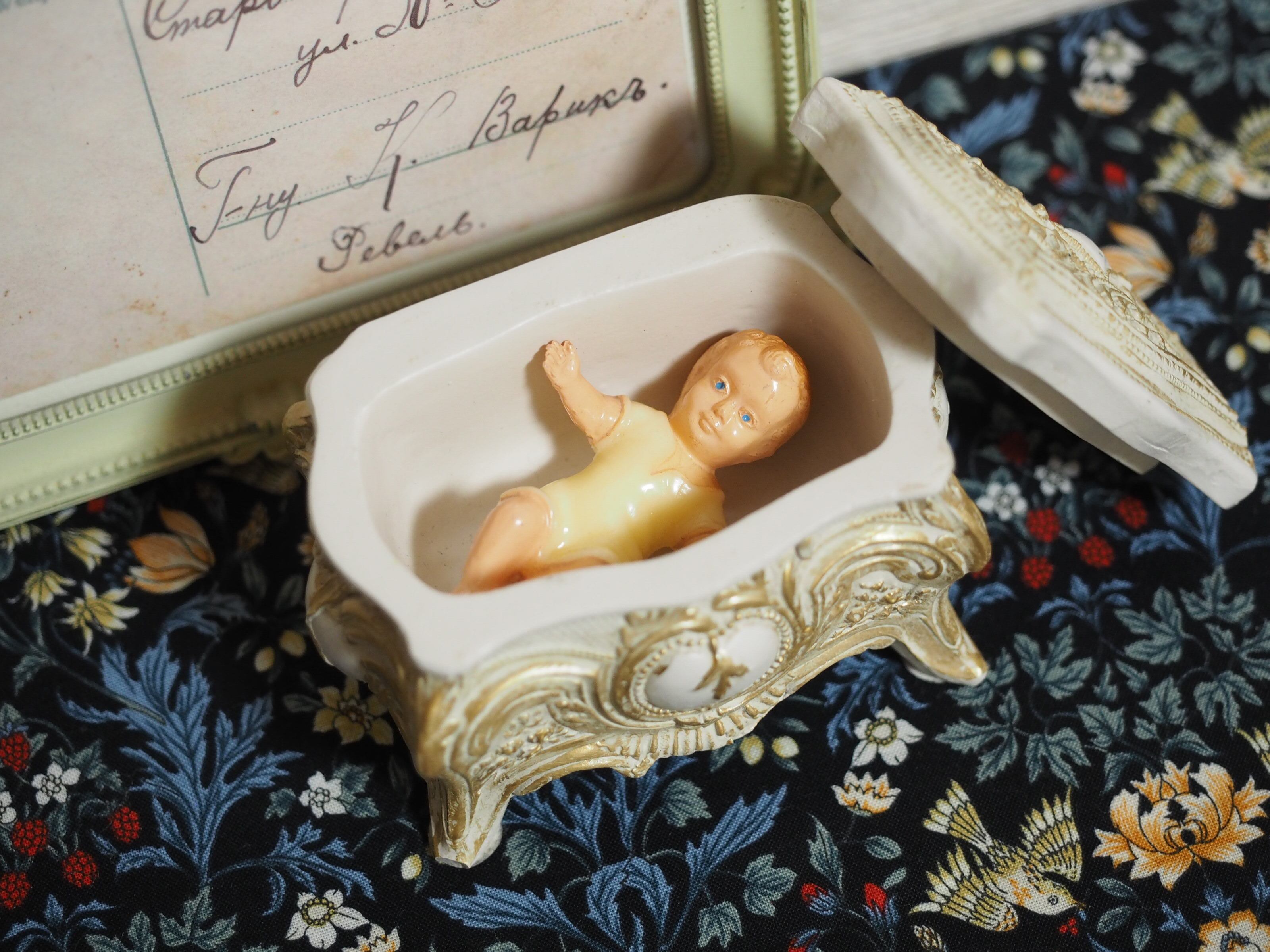 2体の寝ころんだスタイルから、もしかして飼い葉桶のキリストなのかな?と思い見守る天使と配置してみました。