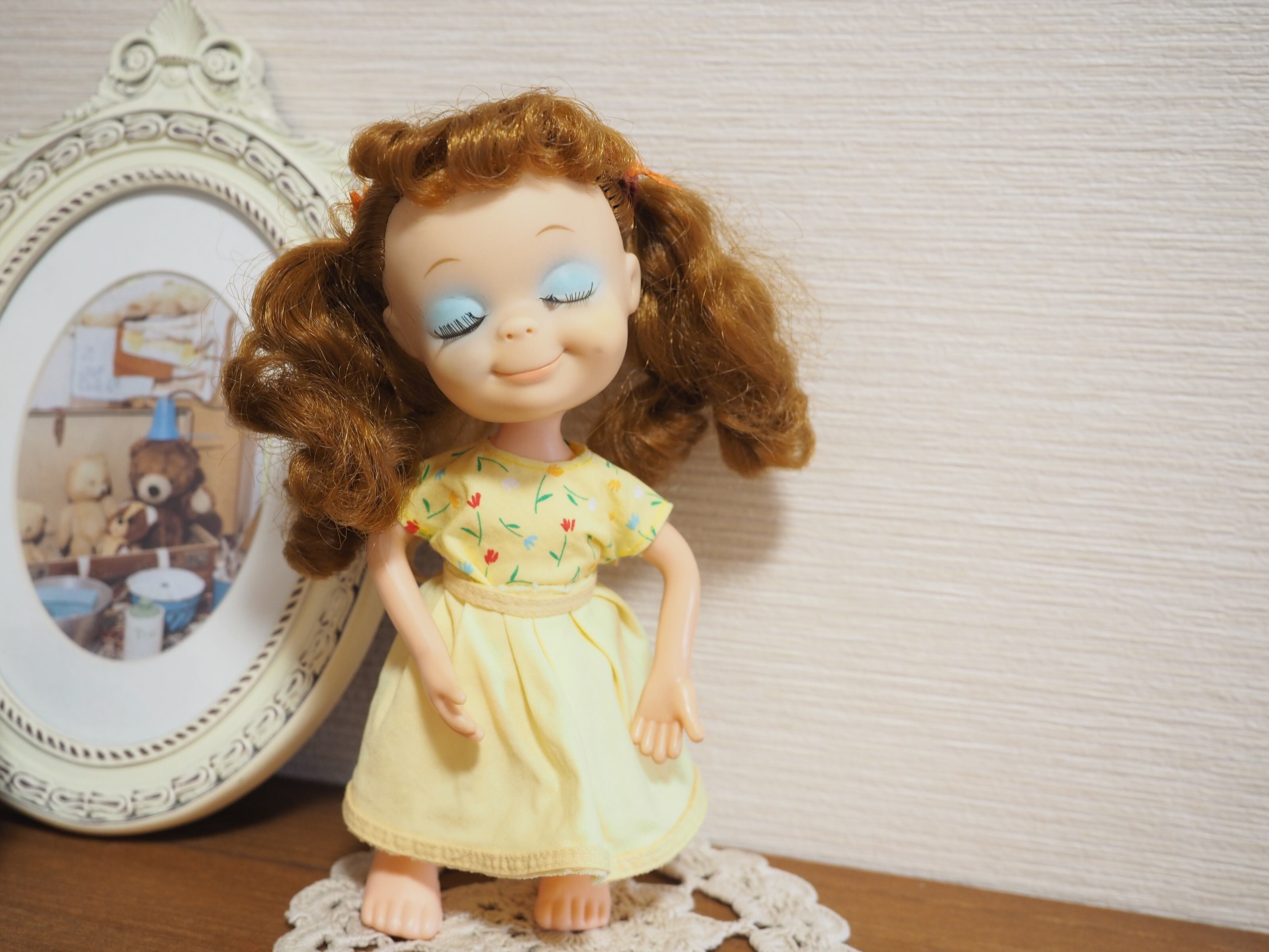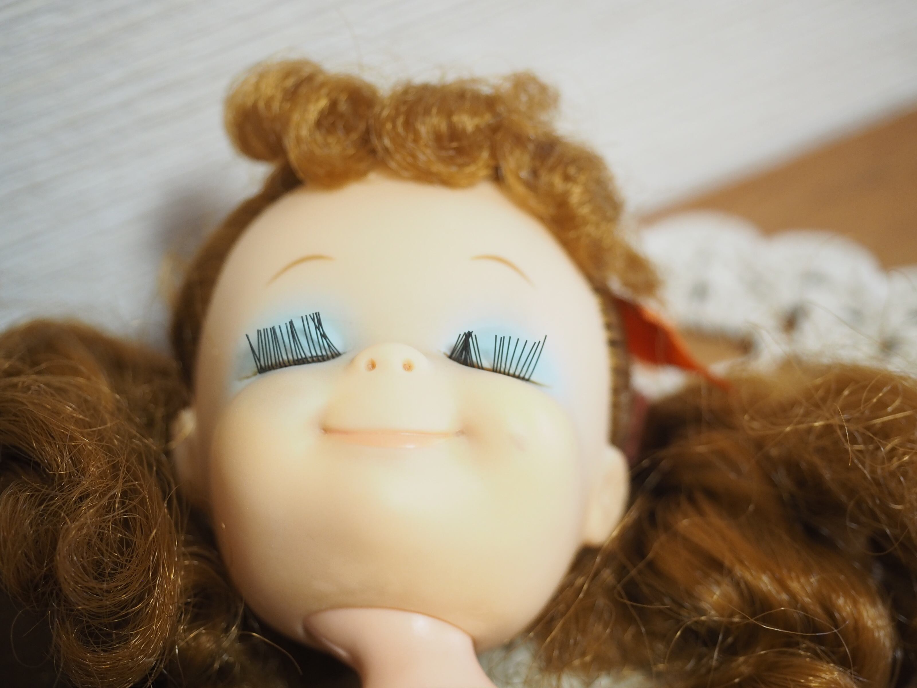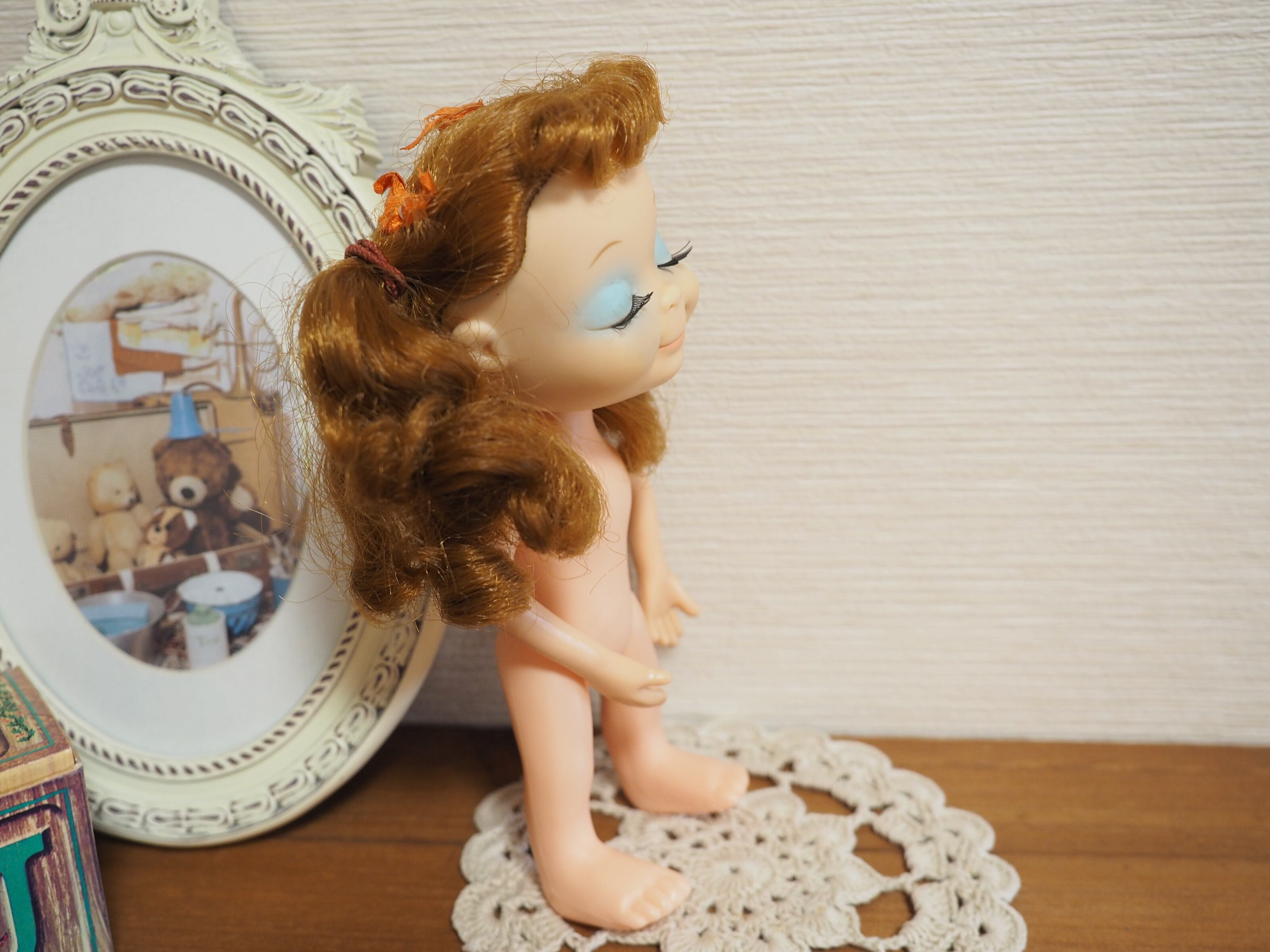 目を閉じたうっとりしたような表情と美しい睫毛が特徴のお人形です。約21㎝