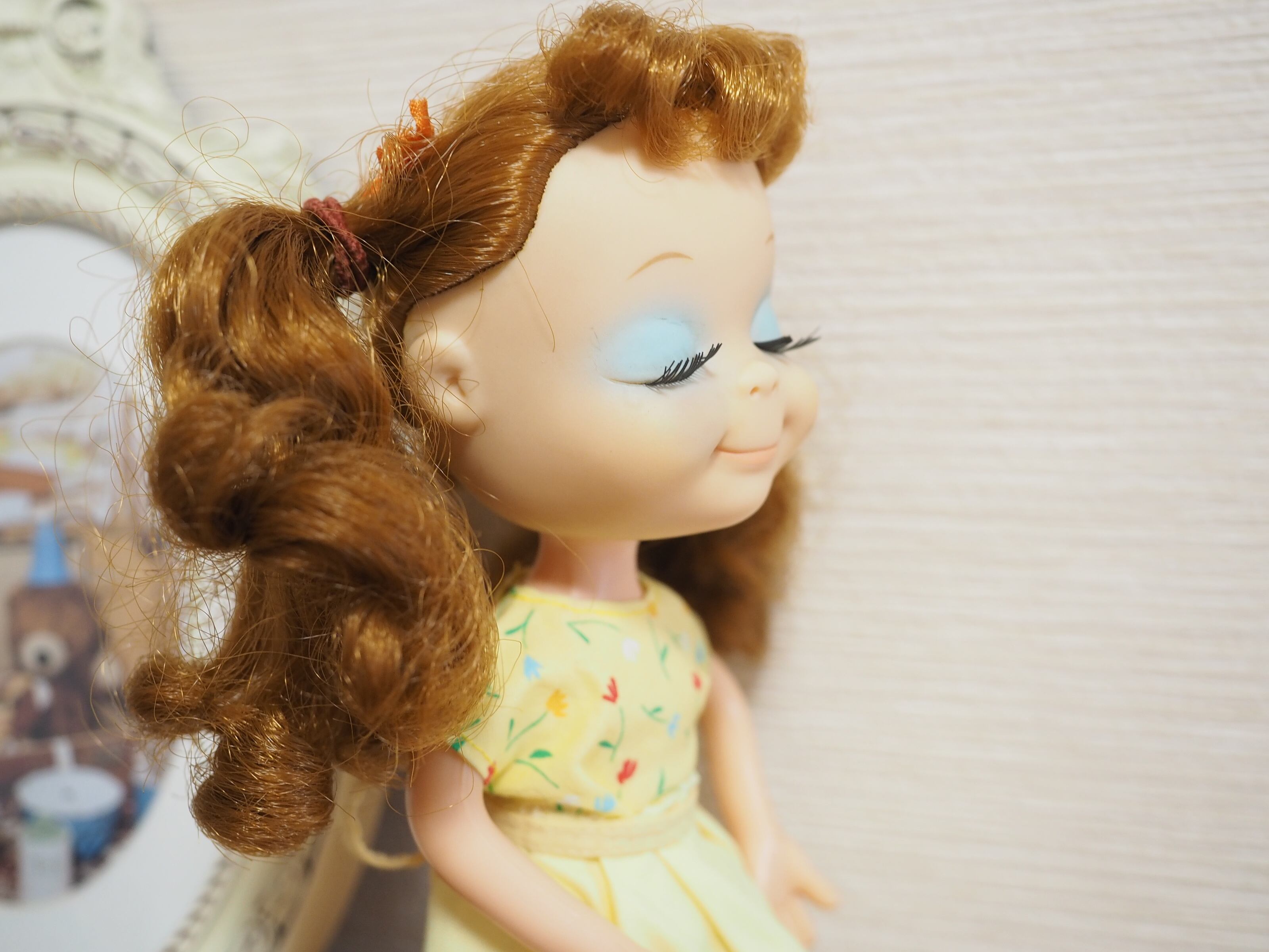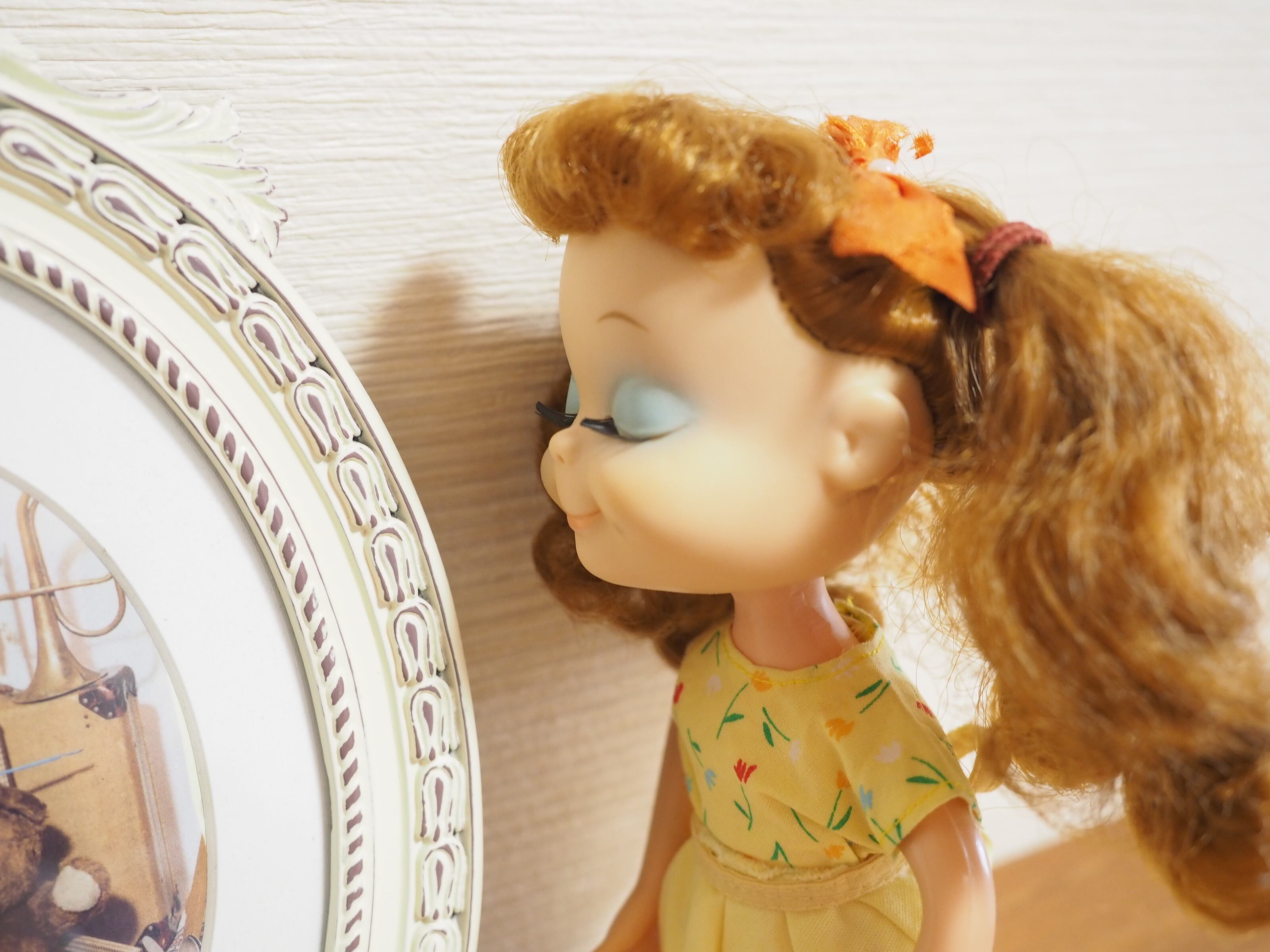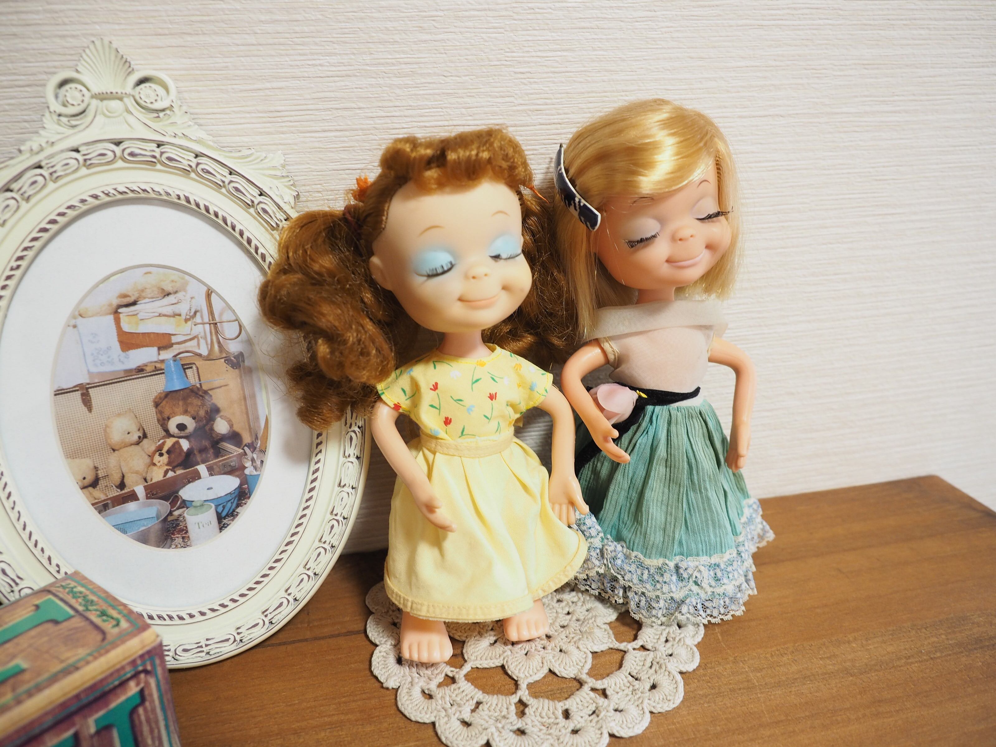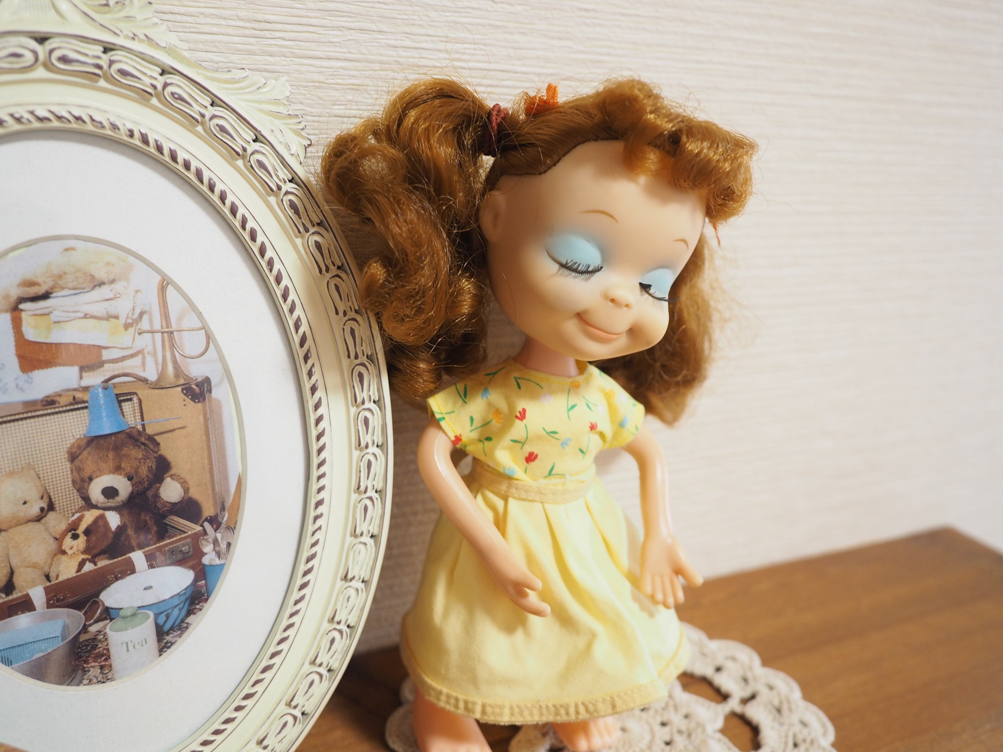 目を閉じたうっとりしたような表情と美しい睫毛が特徴のお人形です。約21㎝