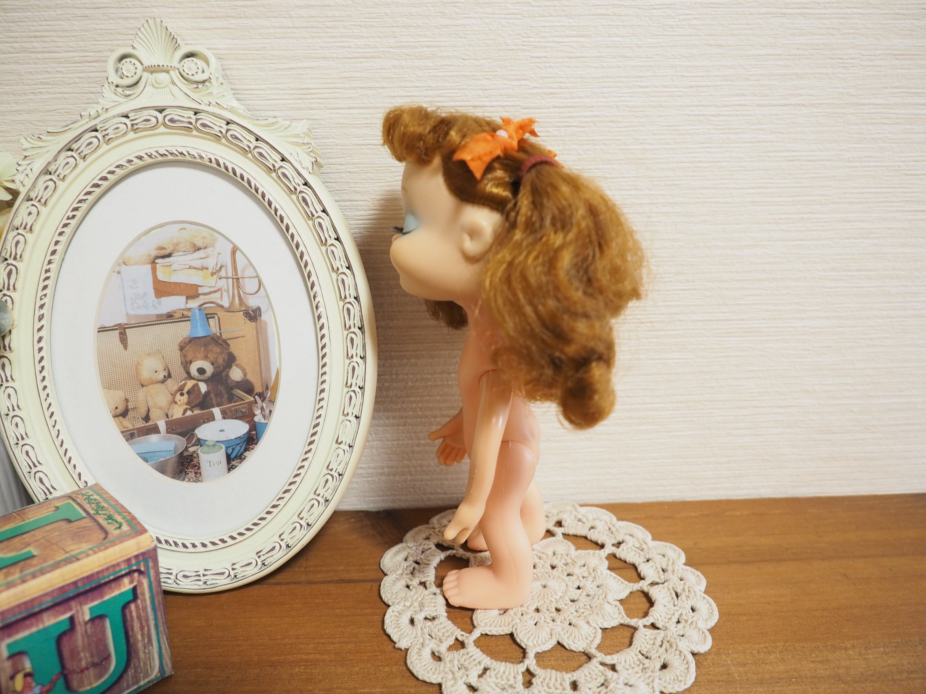 頭にまち針で留めつけられたリボンはオリジナルですがかなり劣化がございます。ゴムはありませんでしたのでこちらで緩めに結びました。