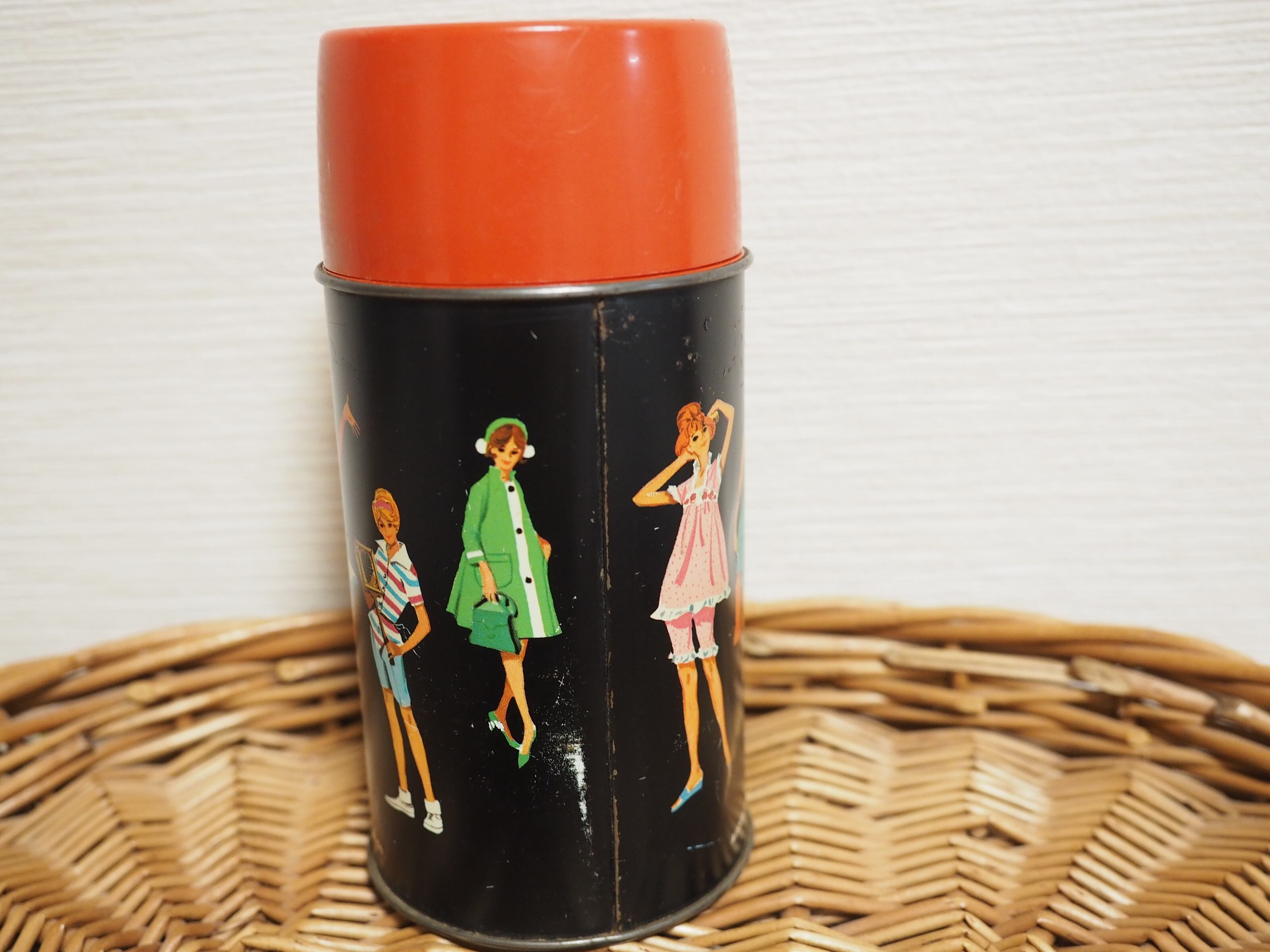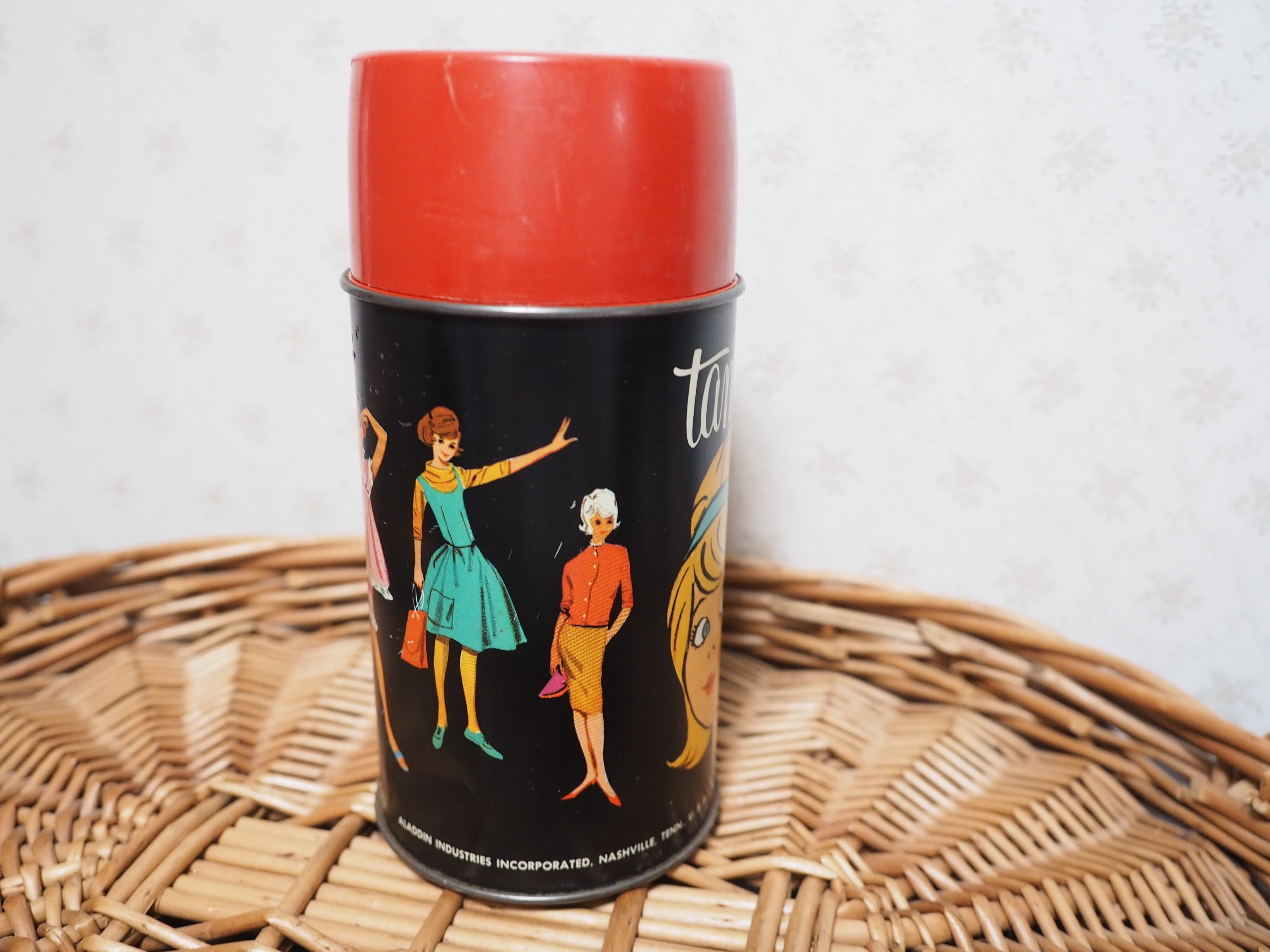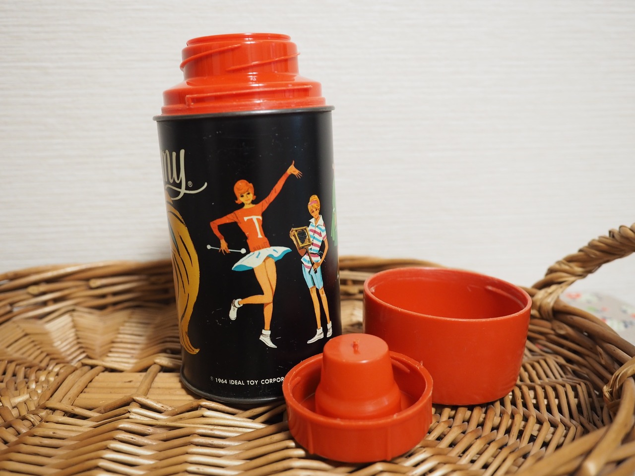 1964年タミーちゃんのアラジンビンテージ水筒です。ブラック地にタミーちゃんのイラスト、コップが赤でとってもおしゃれです。
