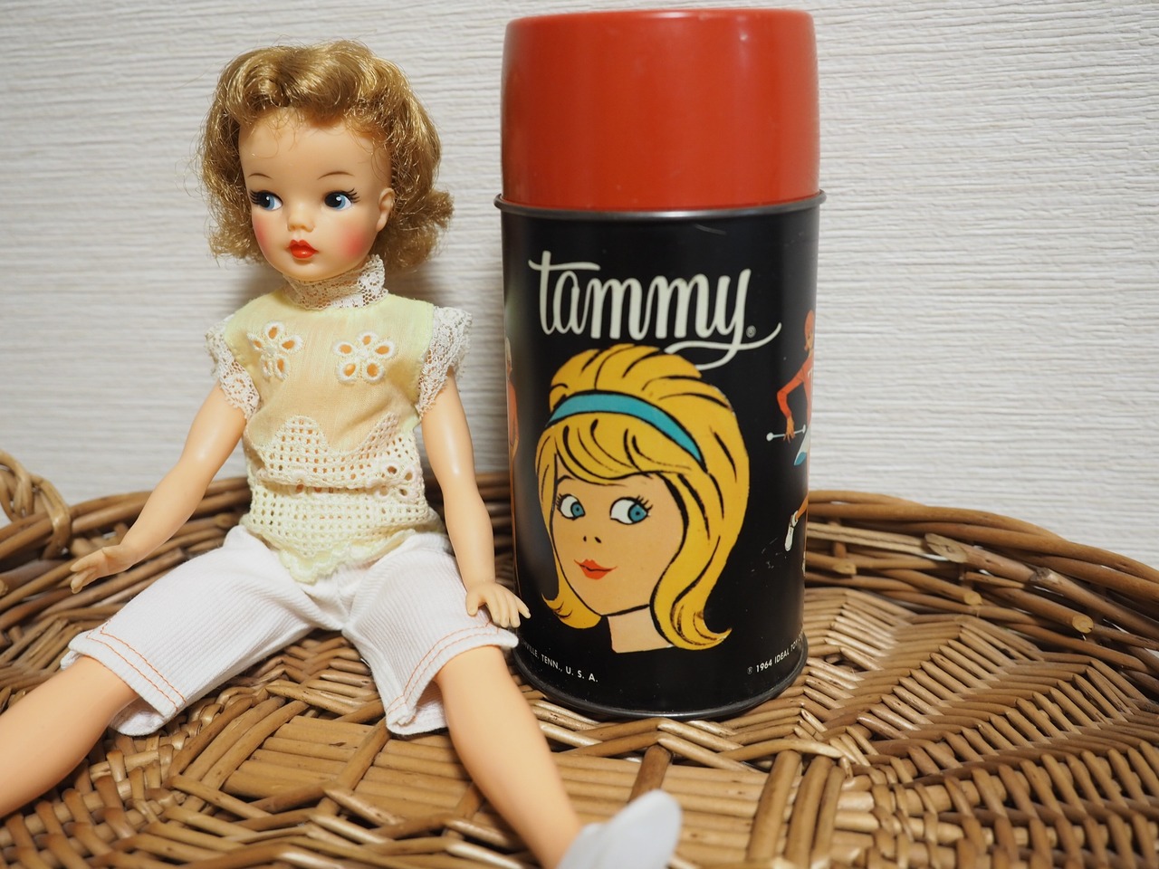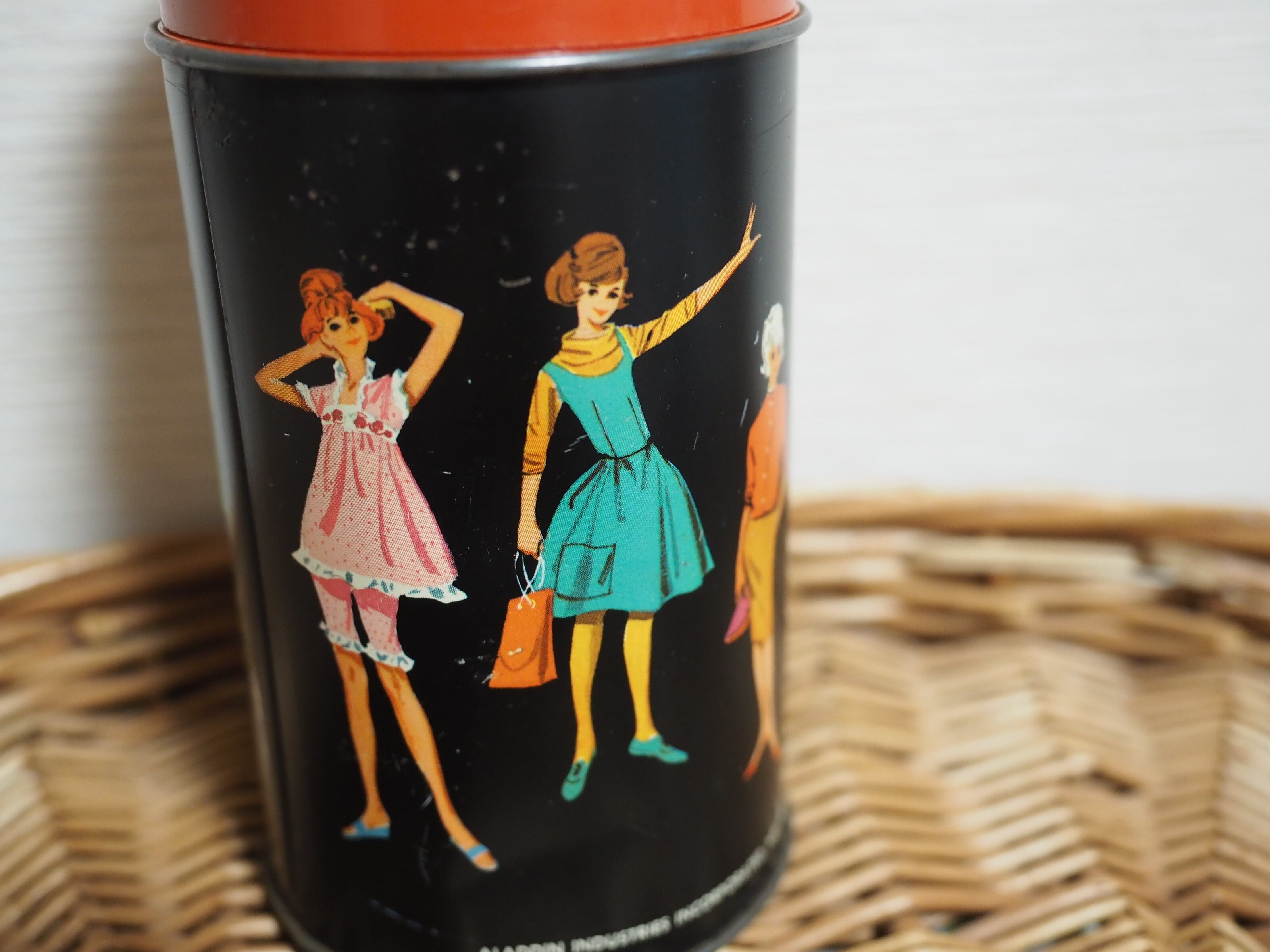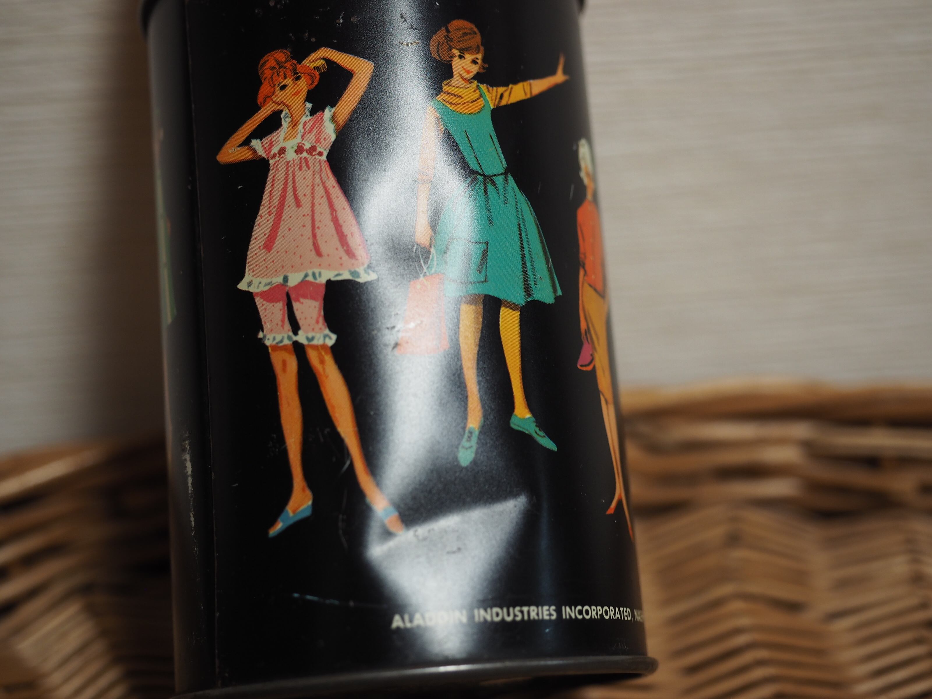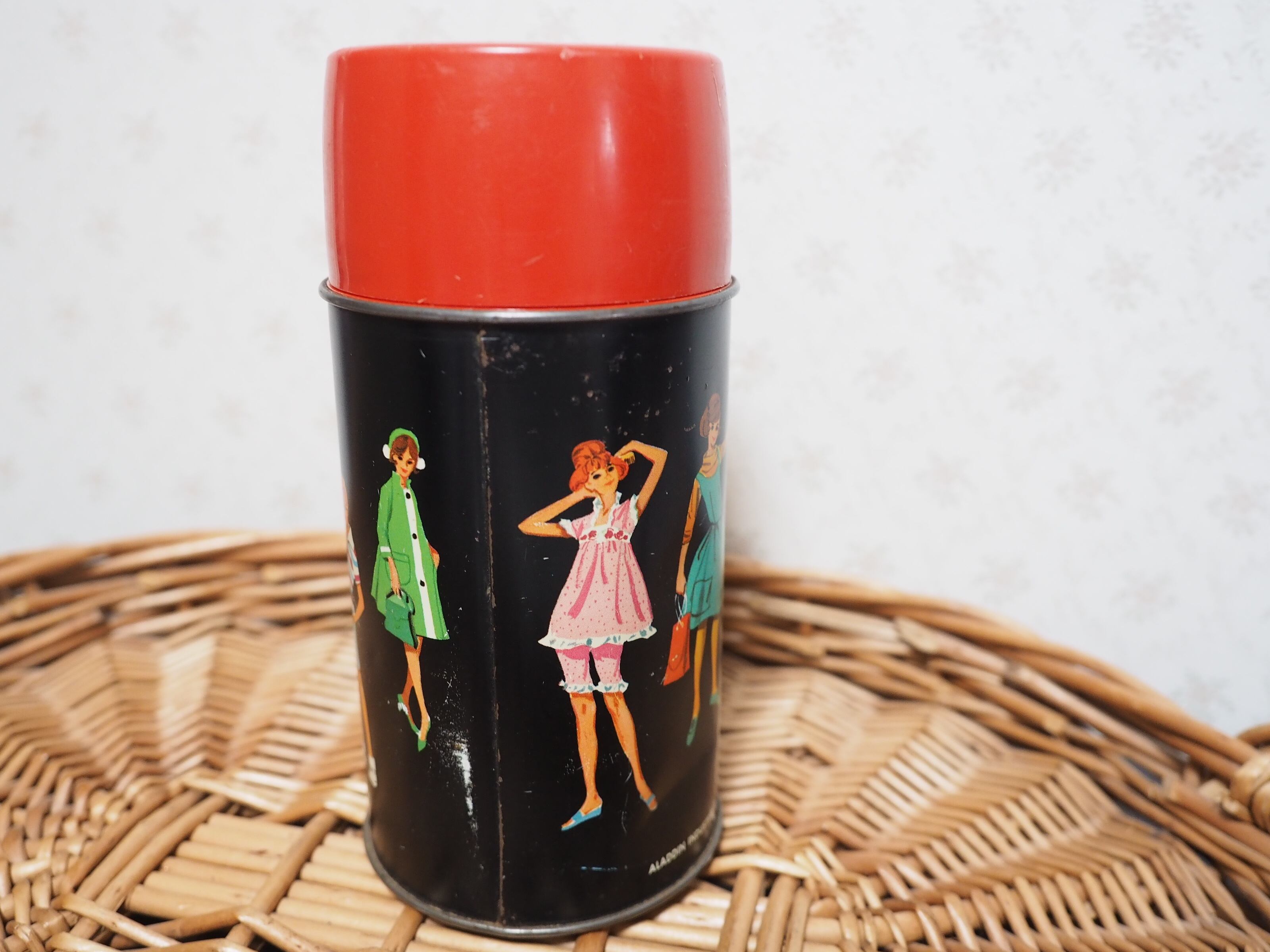 1964年タミーちゃんのアラジンビンテージ水筒です。ブラック地にタミーちゃんのイラスト、コップが赤でとってもおしゃれです。
