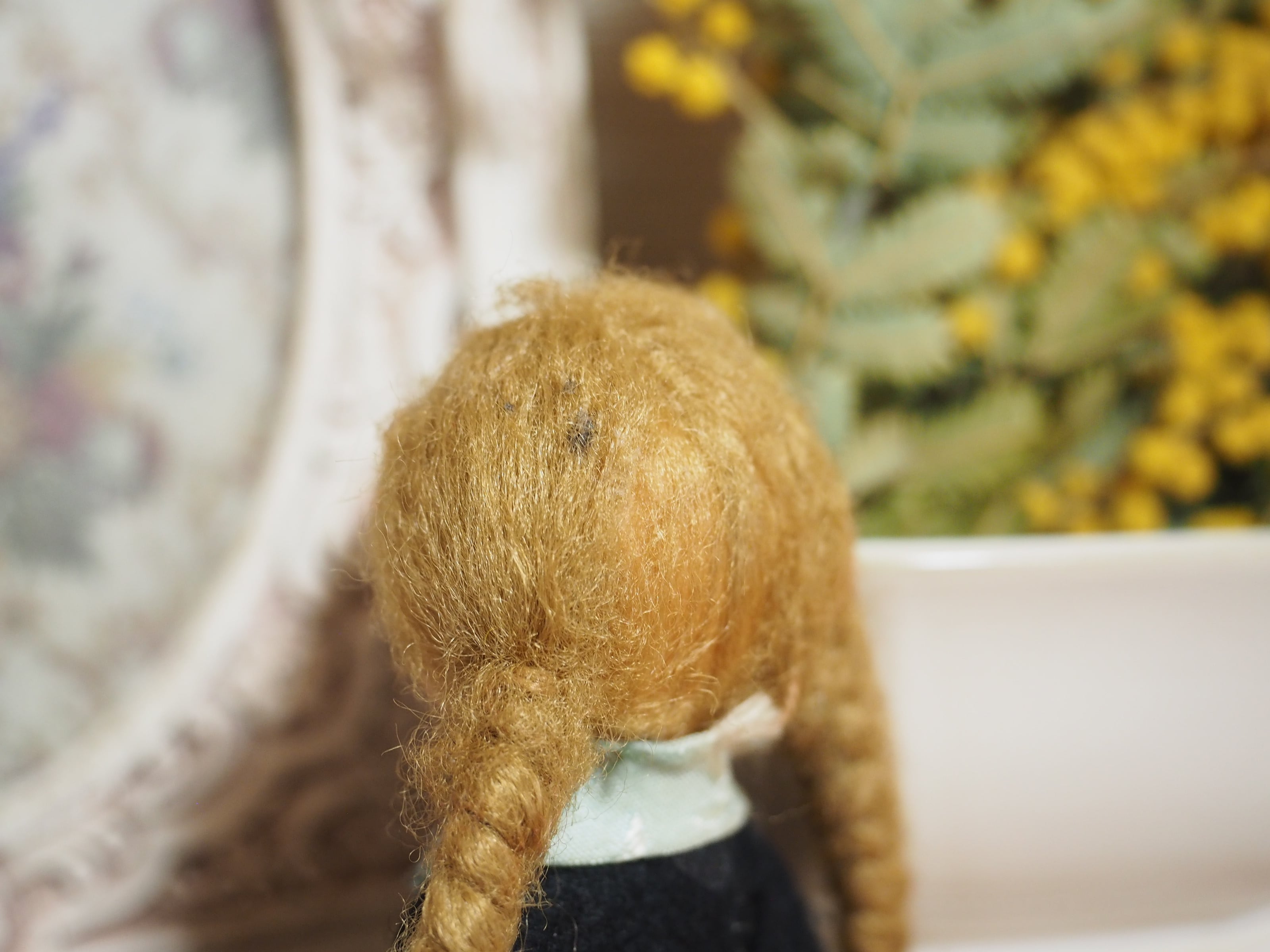 ふわふわの髪は崩れがあり、後ろが薄くなっています。左手にフェルトが付着したような黒い糸絡みがあり、接着剤が付いたのか硬いです。