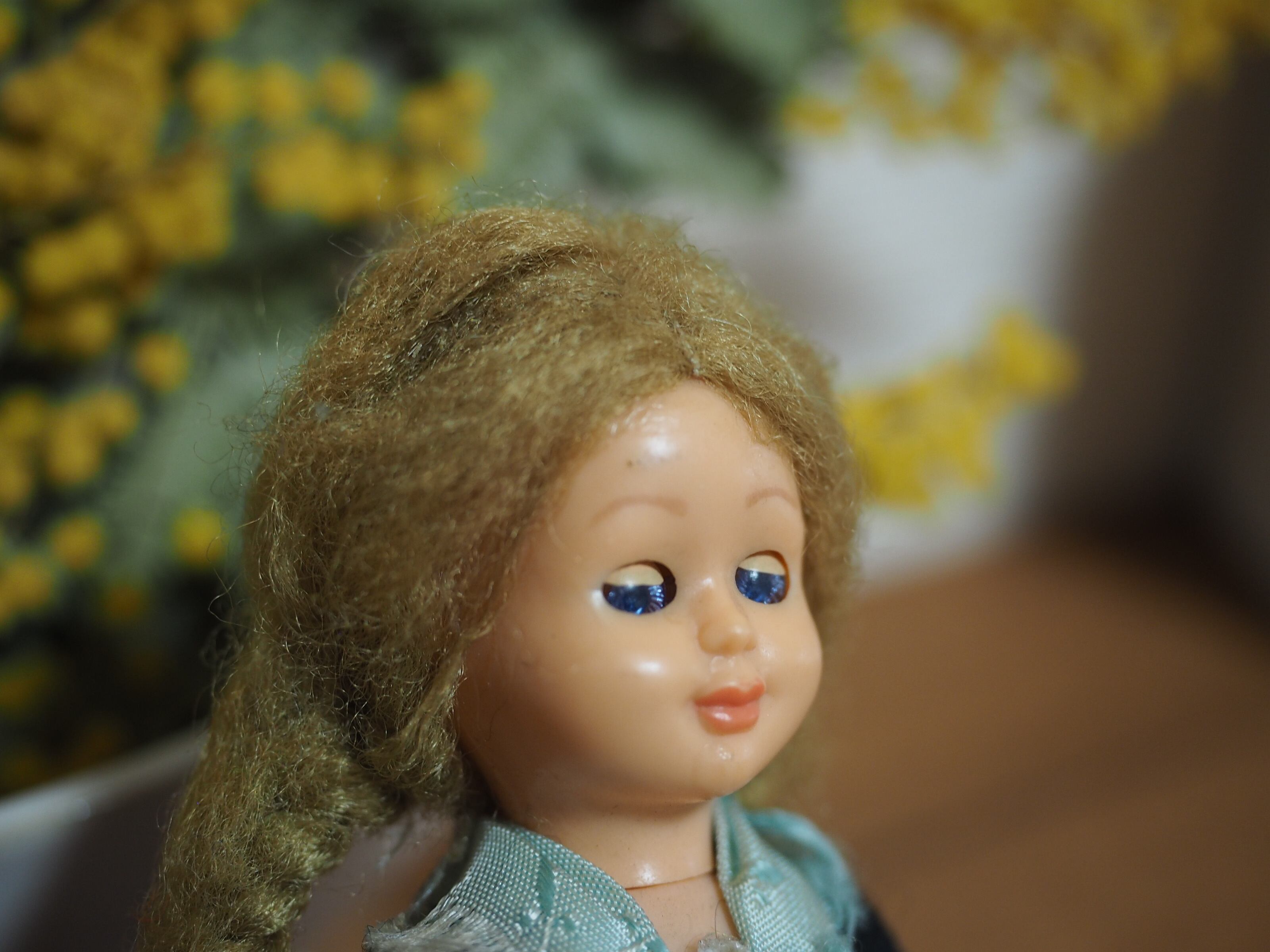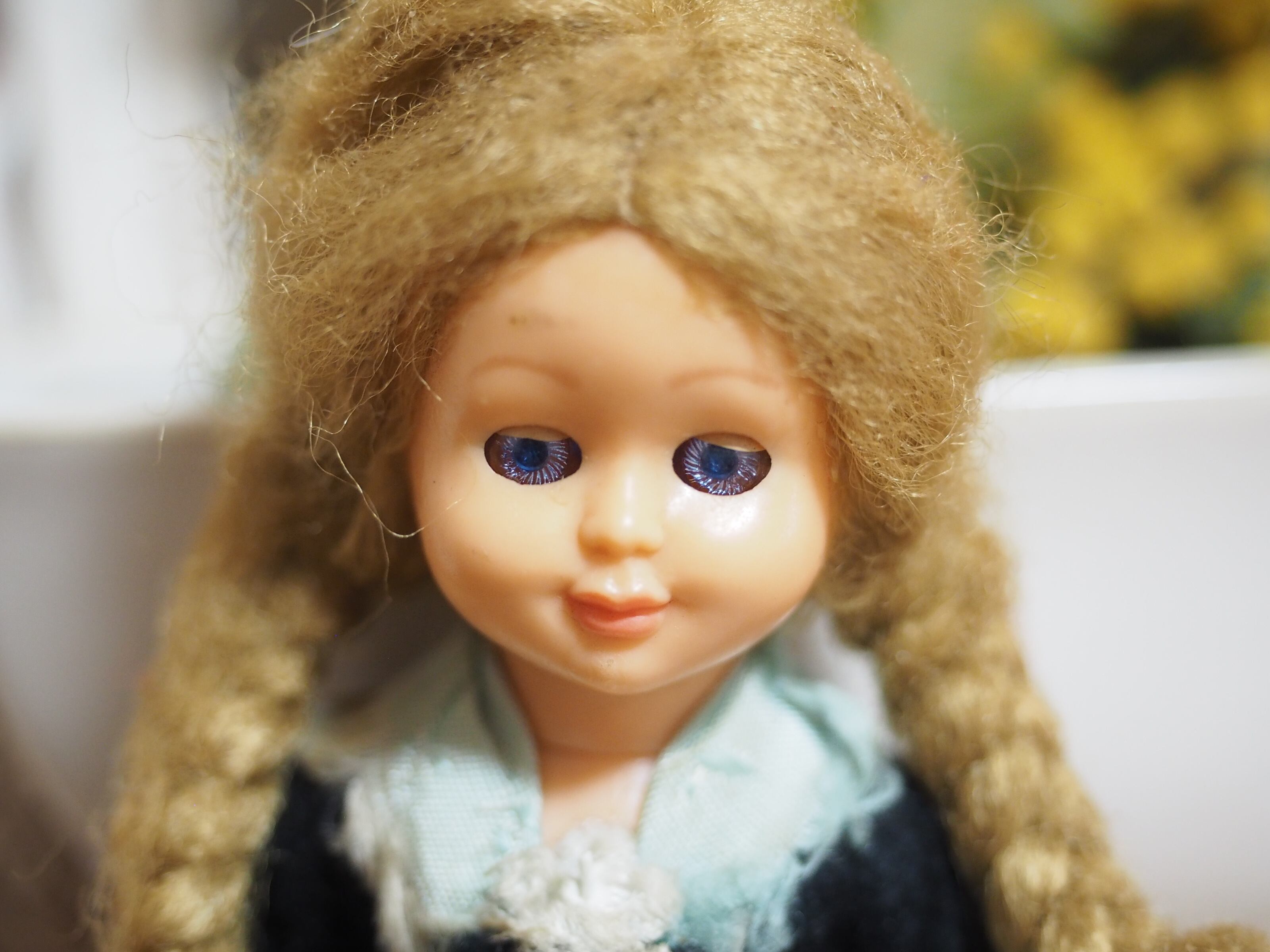 ふっくらした頬に美しい澄んだ薄いブルーのスリープアイのお人形です。パチッと目を開いた状態でも少し瞼が見え、少し眠たげな優しい表情です。
