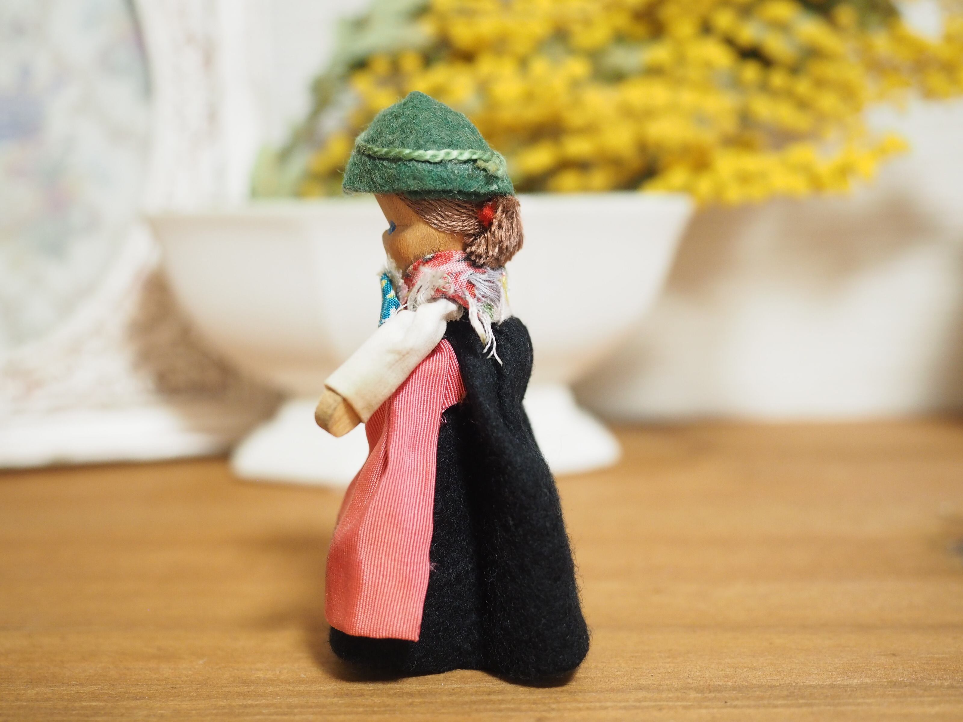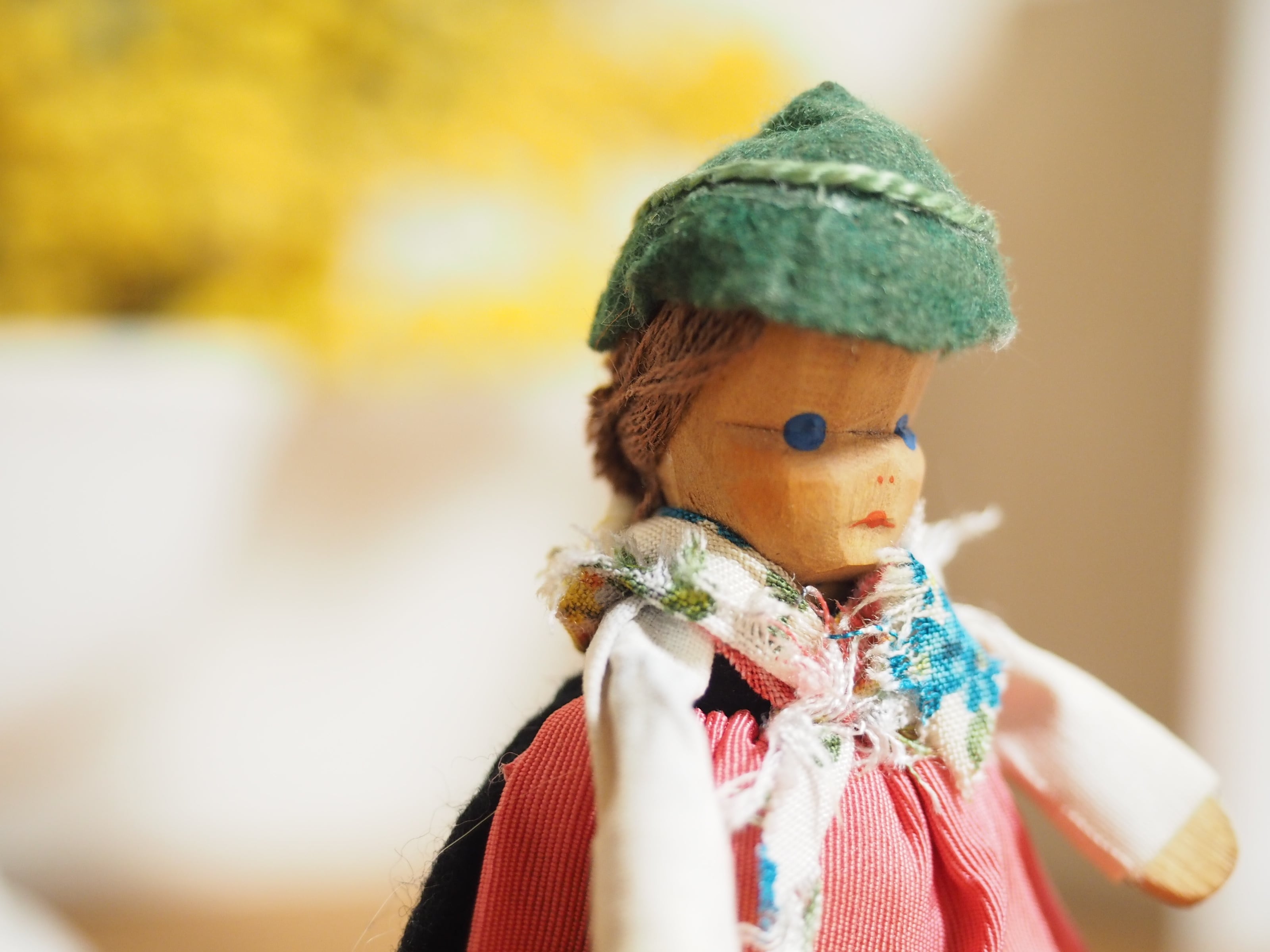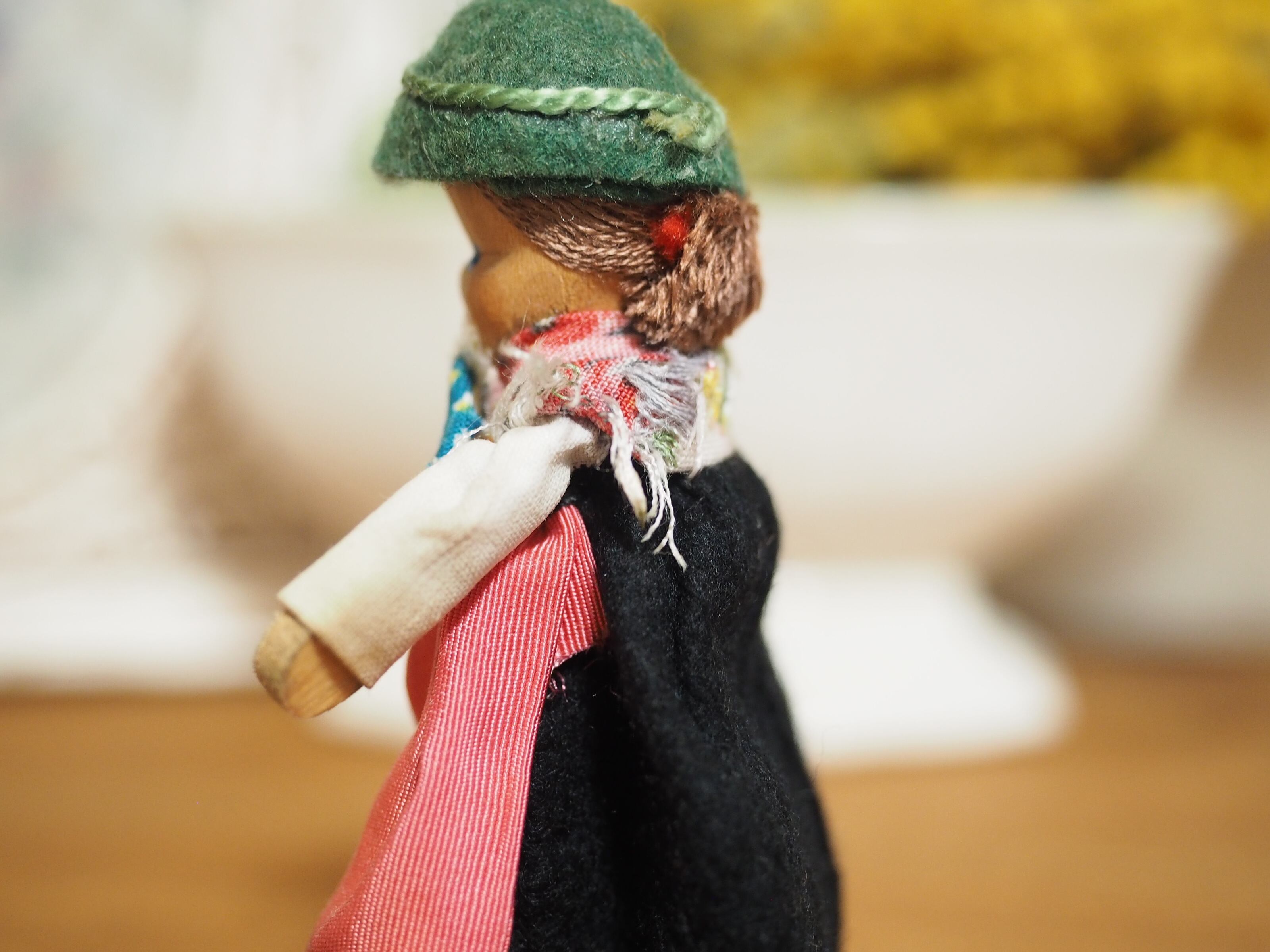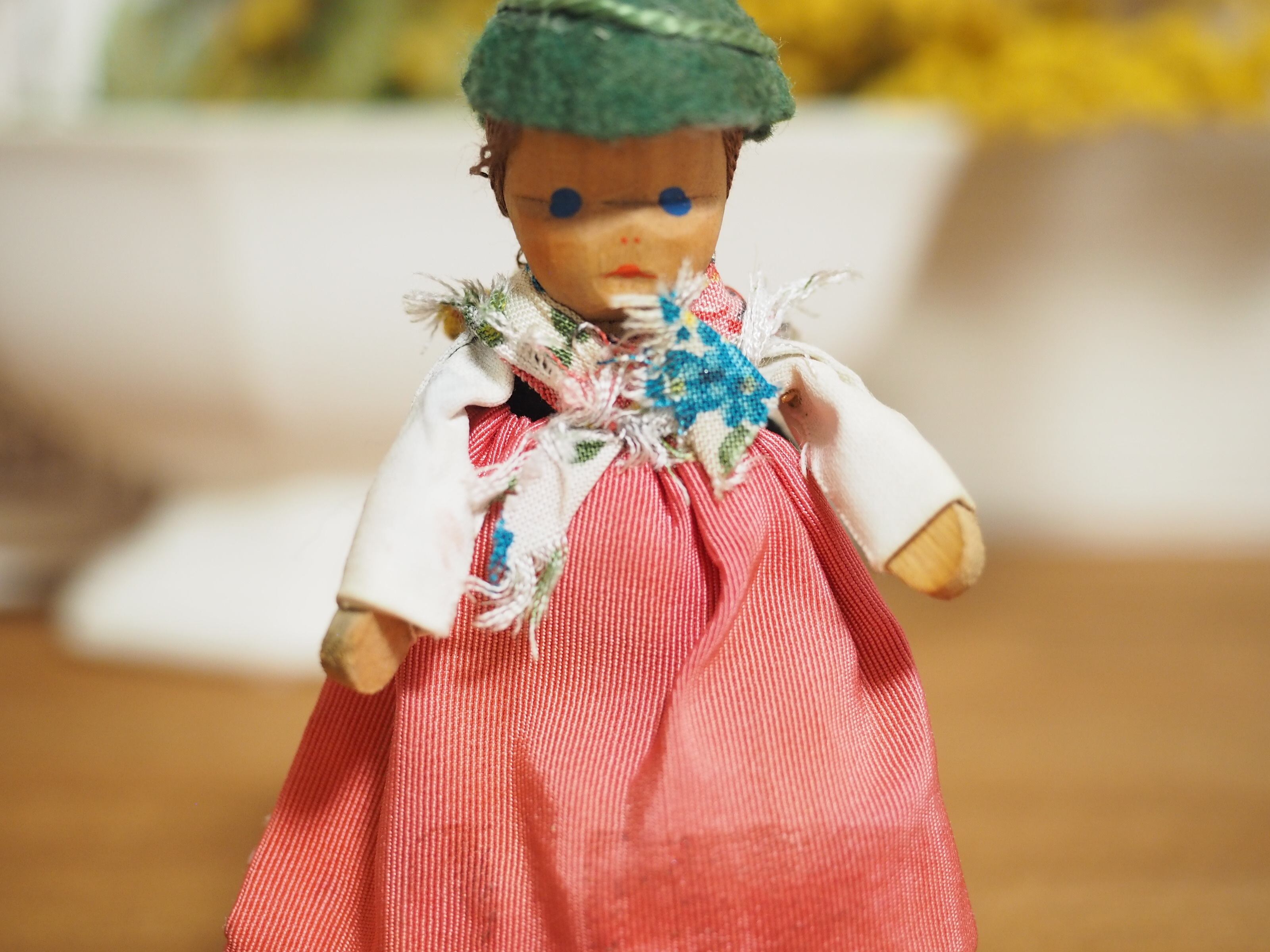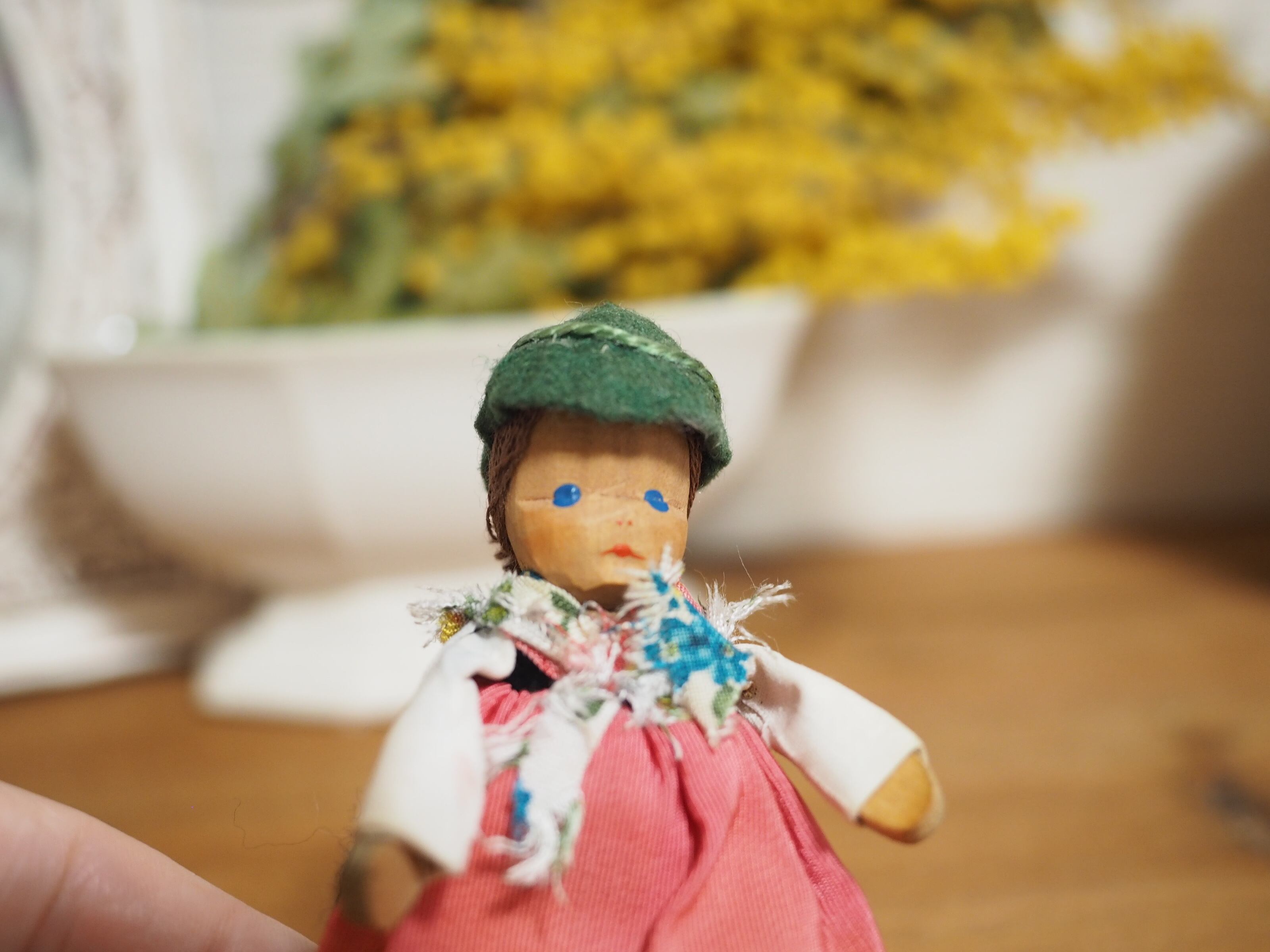 お顔のペイントや髪の材質から、ハーン社(LOTTE SIEVERS HAHN )の木製人形と思われます。木片から手作業で掘り出されるそうです。