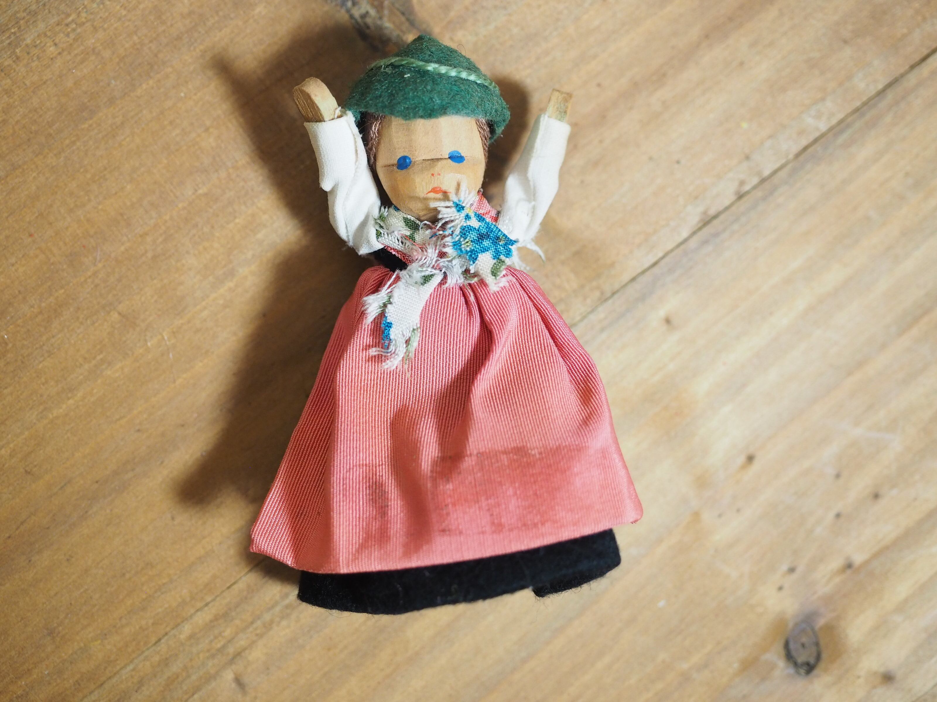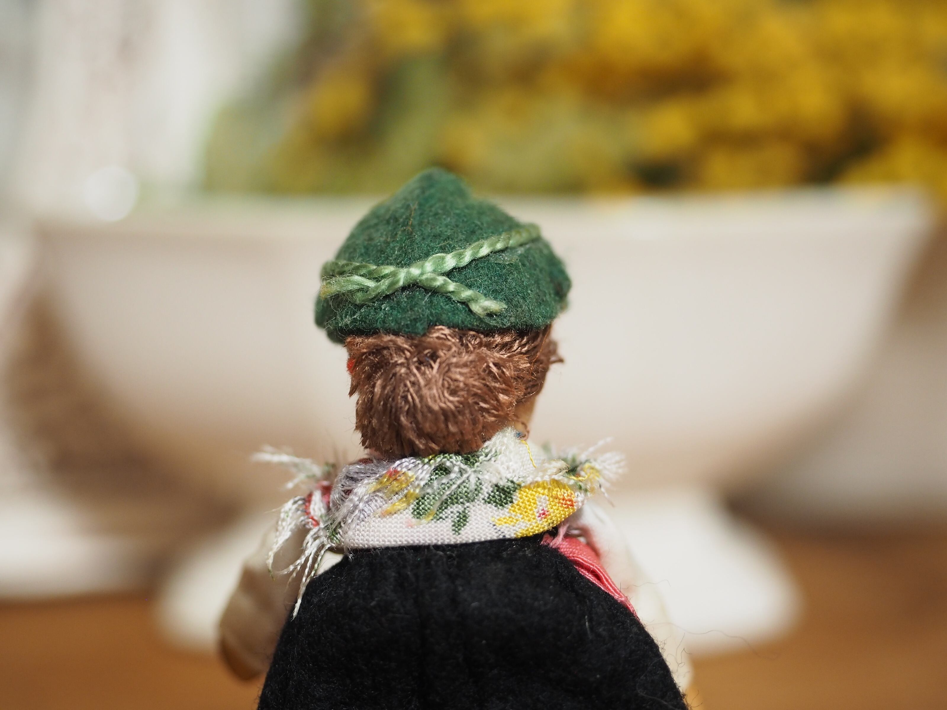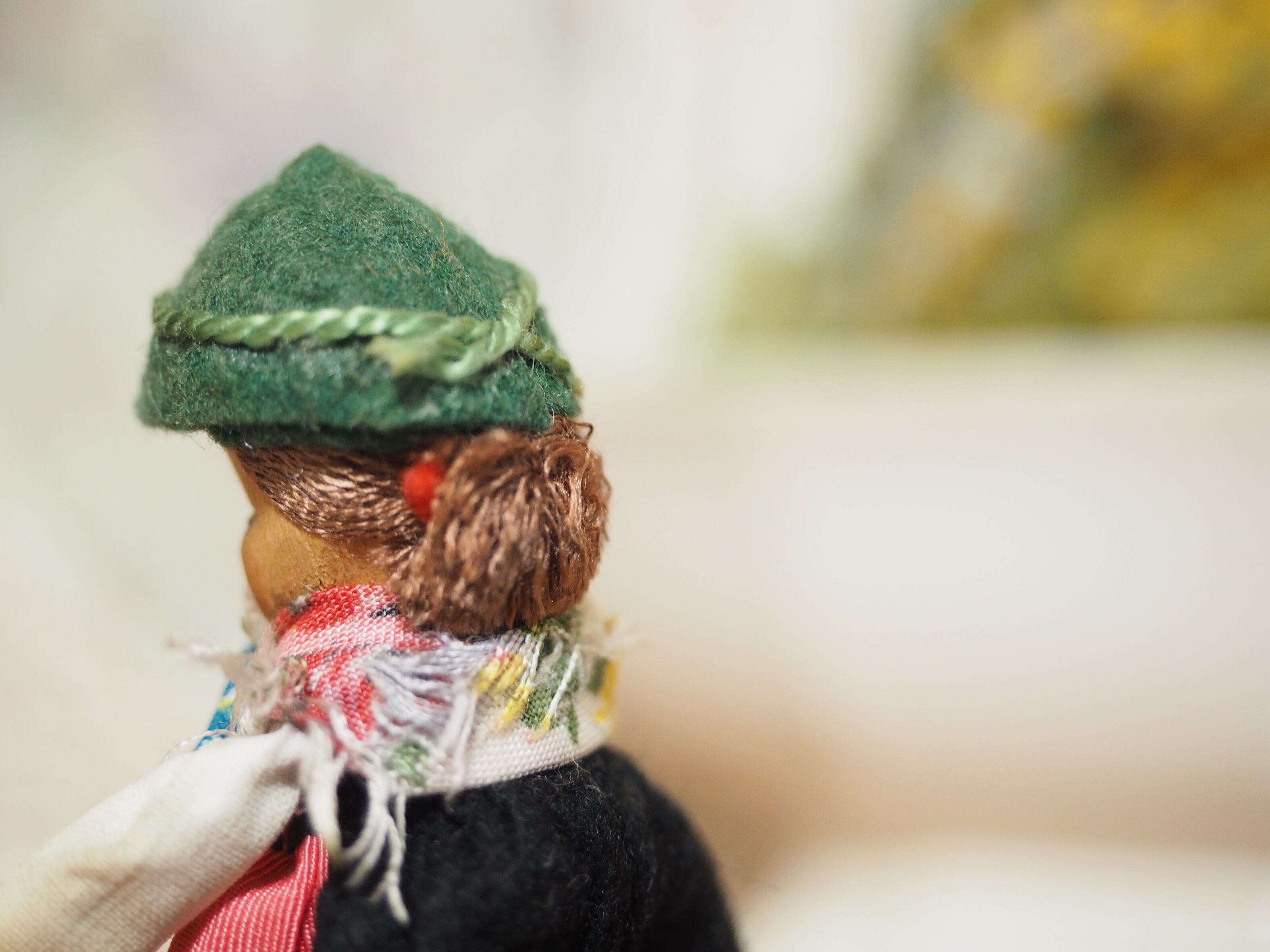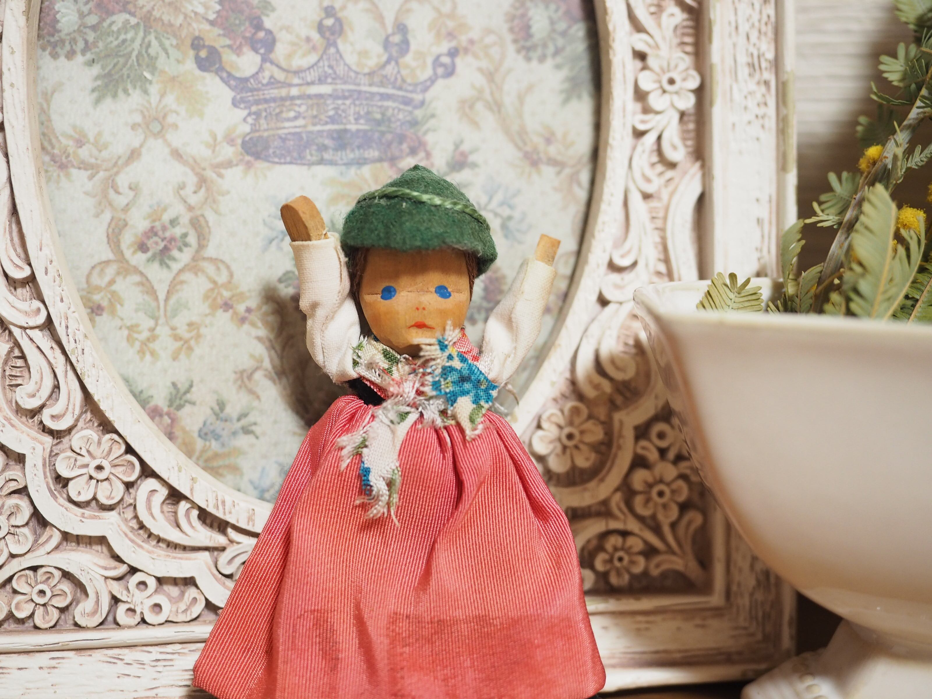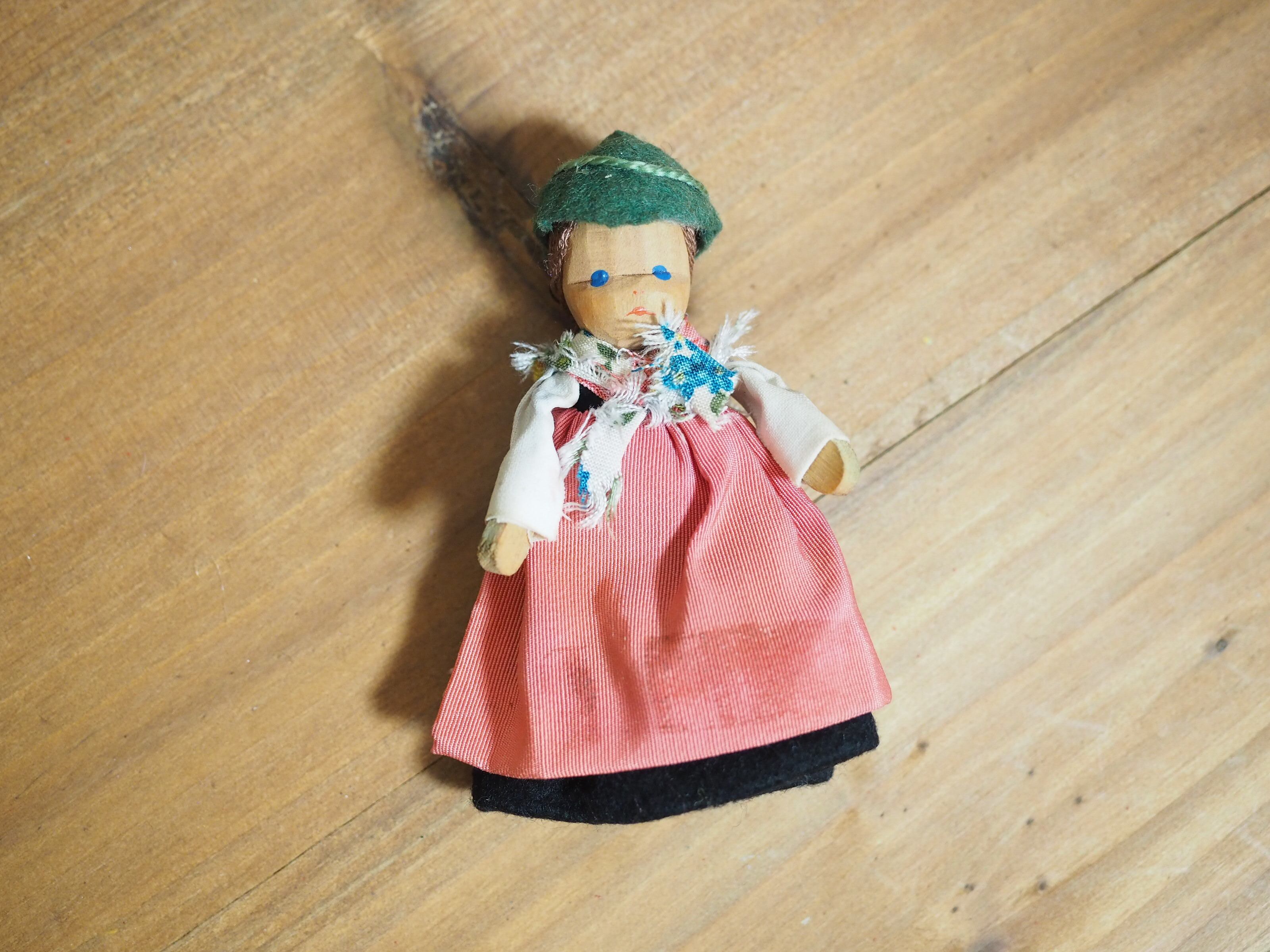 お顔のペイントや髪の材質から、ハーン社(LOTTE SIEVERS HAHN )の木製人形と思われます。木片から手作業で掘り出されるそうです。
