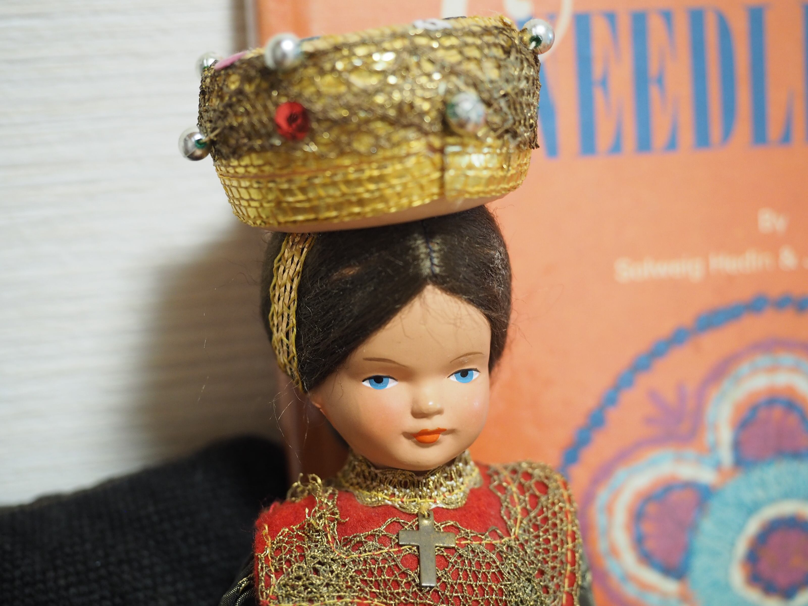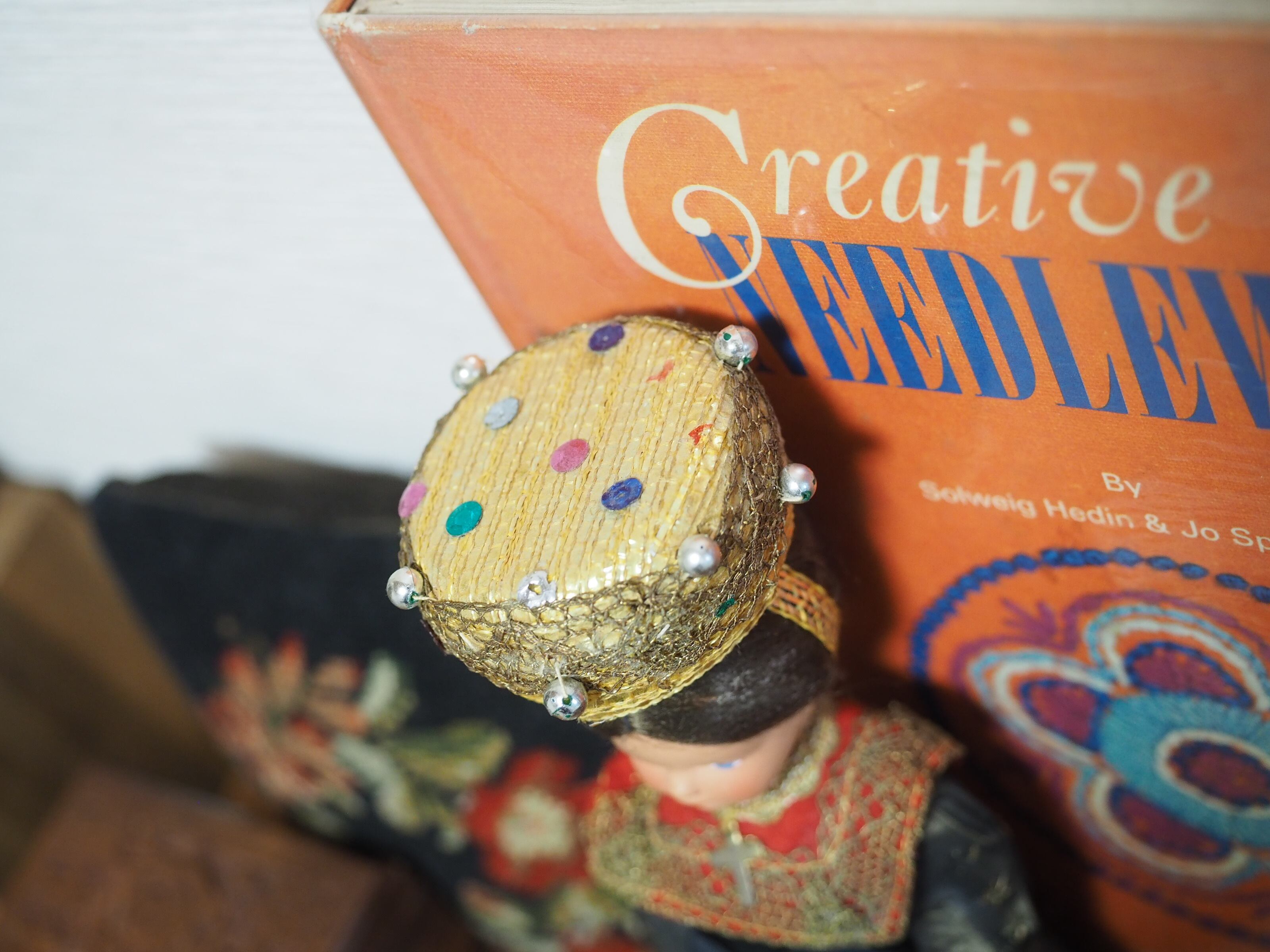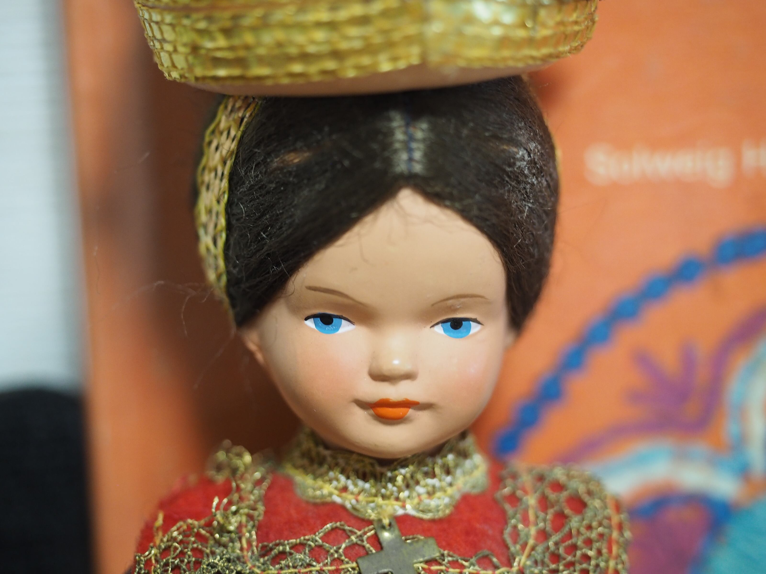 美しい顔立ちの民族衣装人形で、色々なコスチュームで販売されたようです。大きな頭飾りが特徴的。