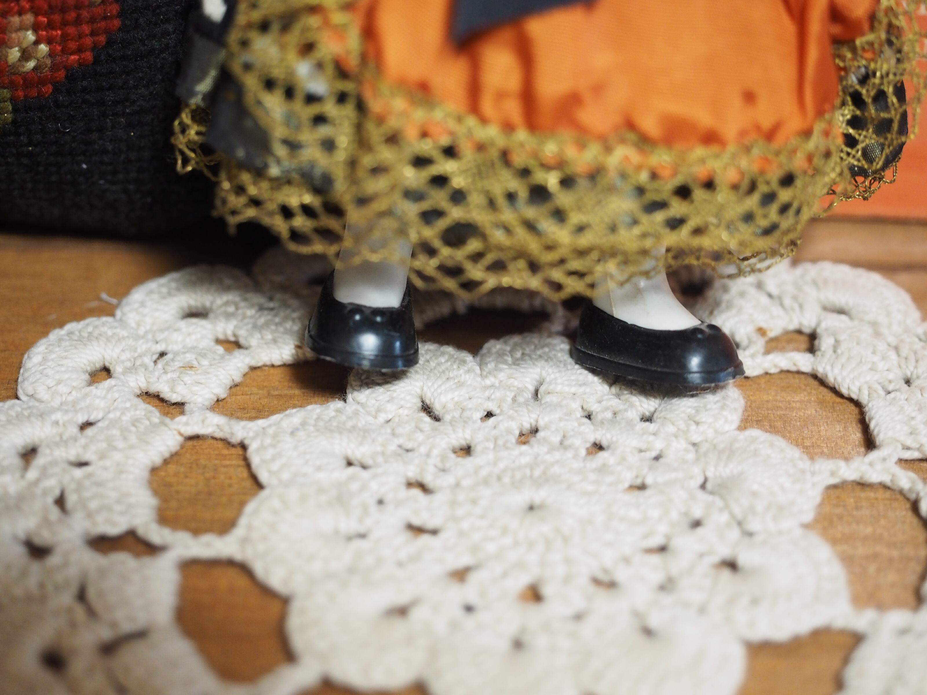 細かく作られた衣装で、襟と首元は金糸のレース編みです。右肩辺りに破れがございます。