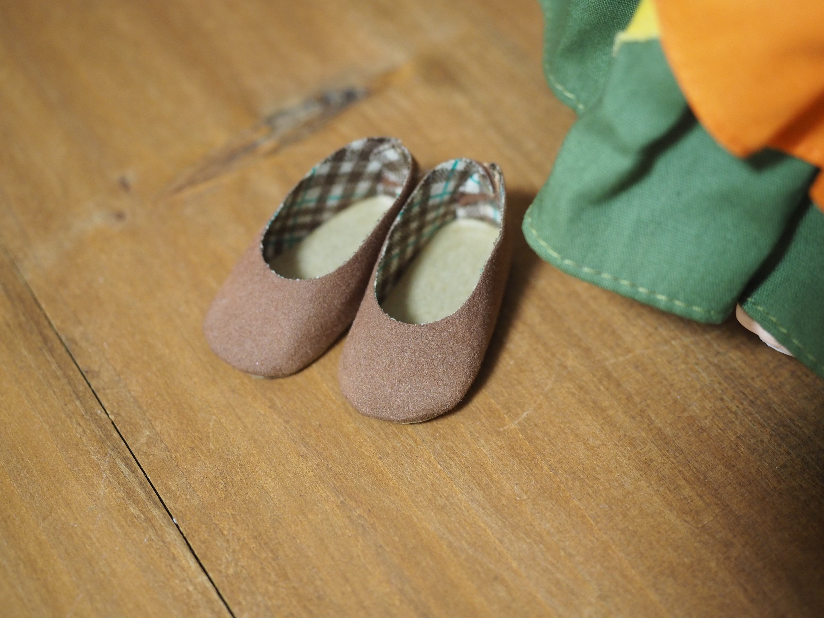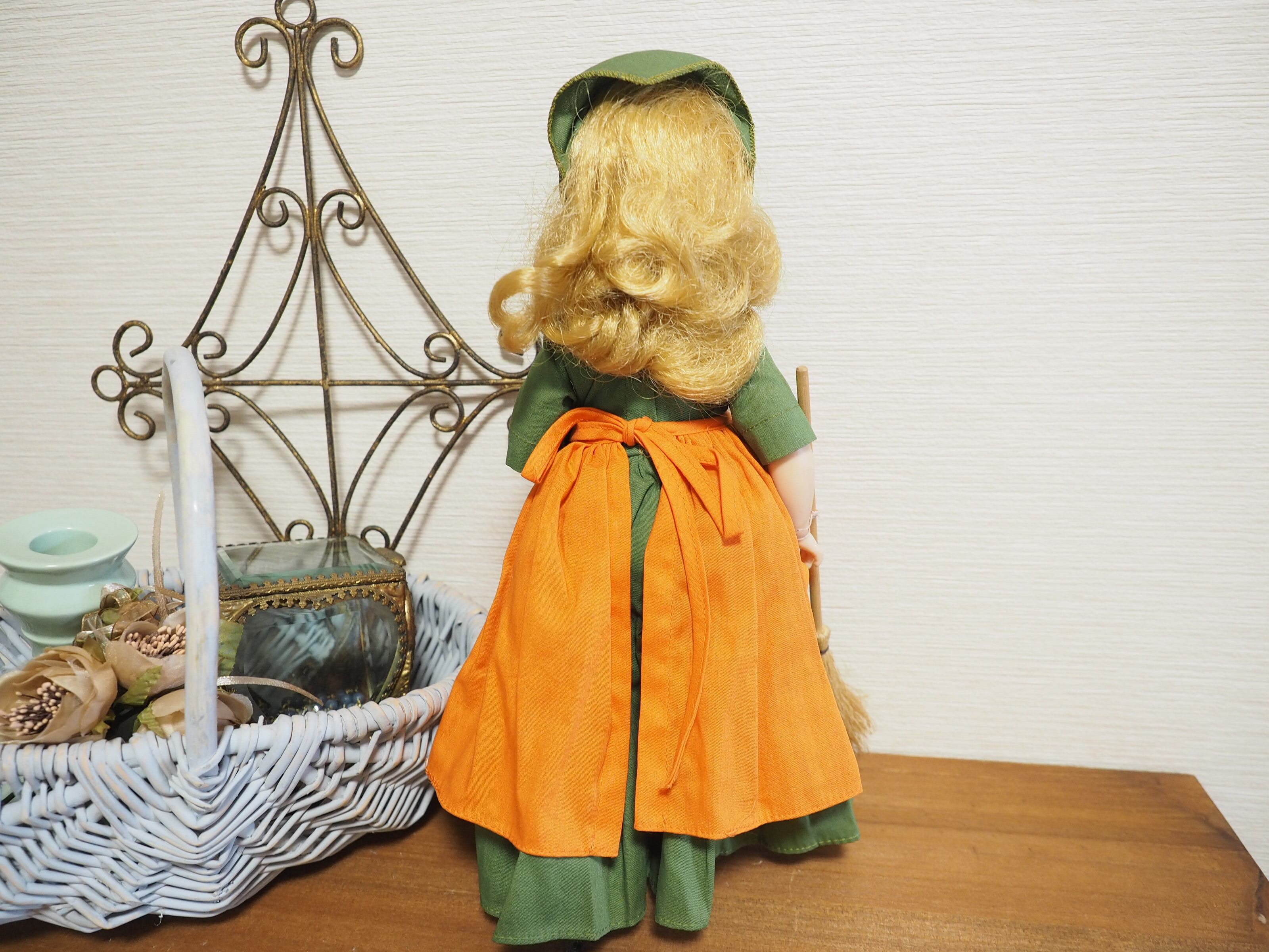 魔法をかけられる前のシンデレラのいでたちで、三角巾にアップリケのついたスカートとエプロンがキュート。
