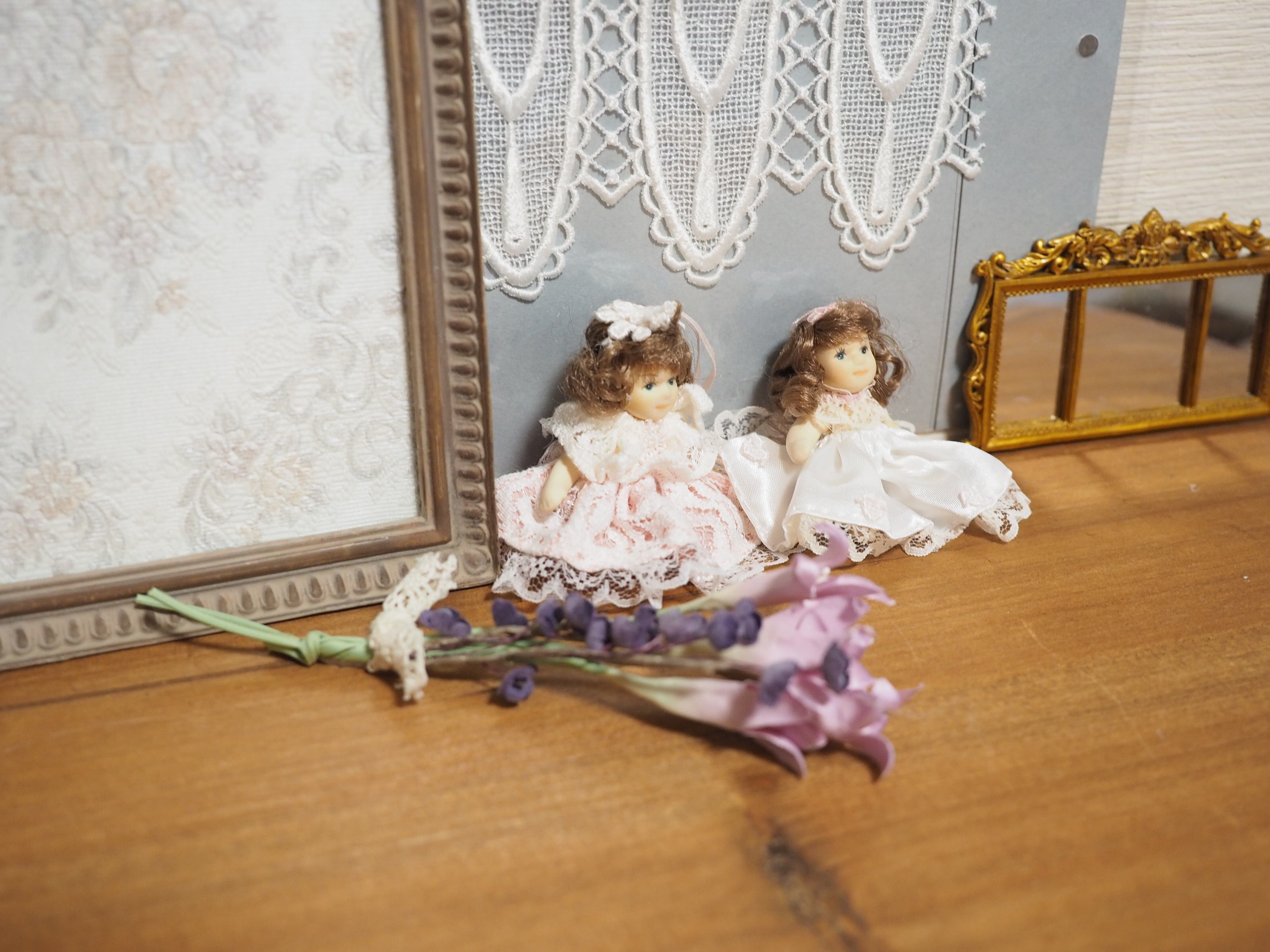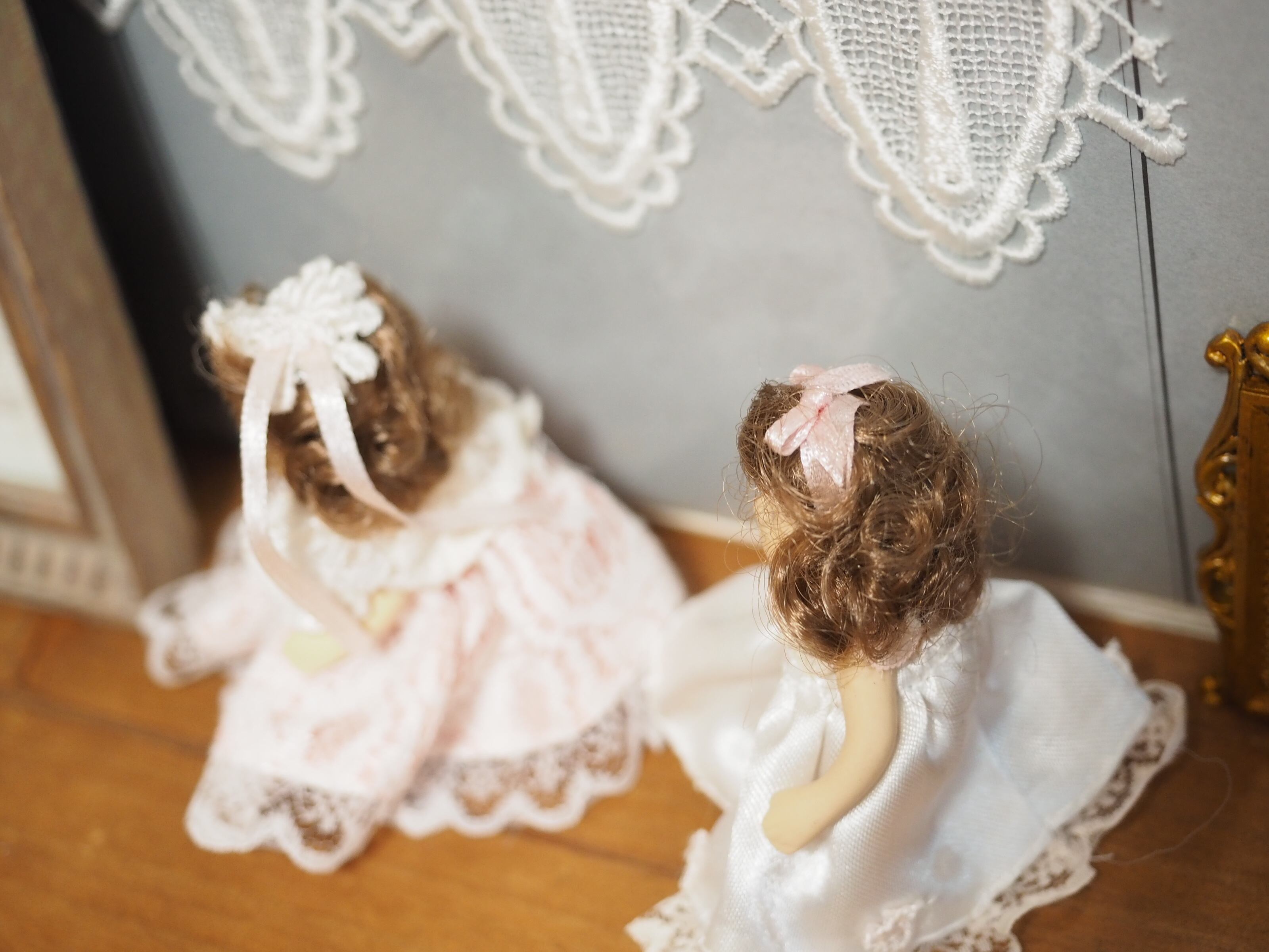 ドレスと頭飾りもそれぞれ異なり、レース地にお花レースにリボンの頭飾りと、サテン地にハートのレースのワンピースの子はカチューシャのようなリボンです。