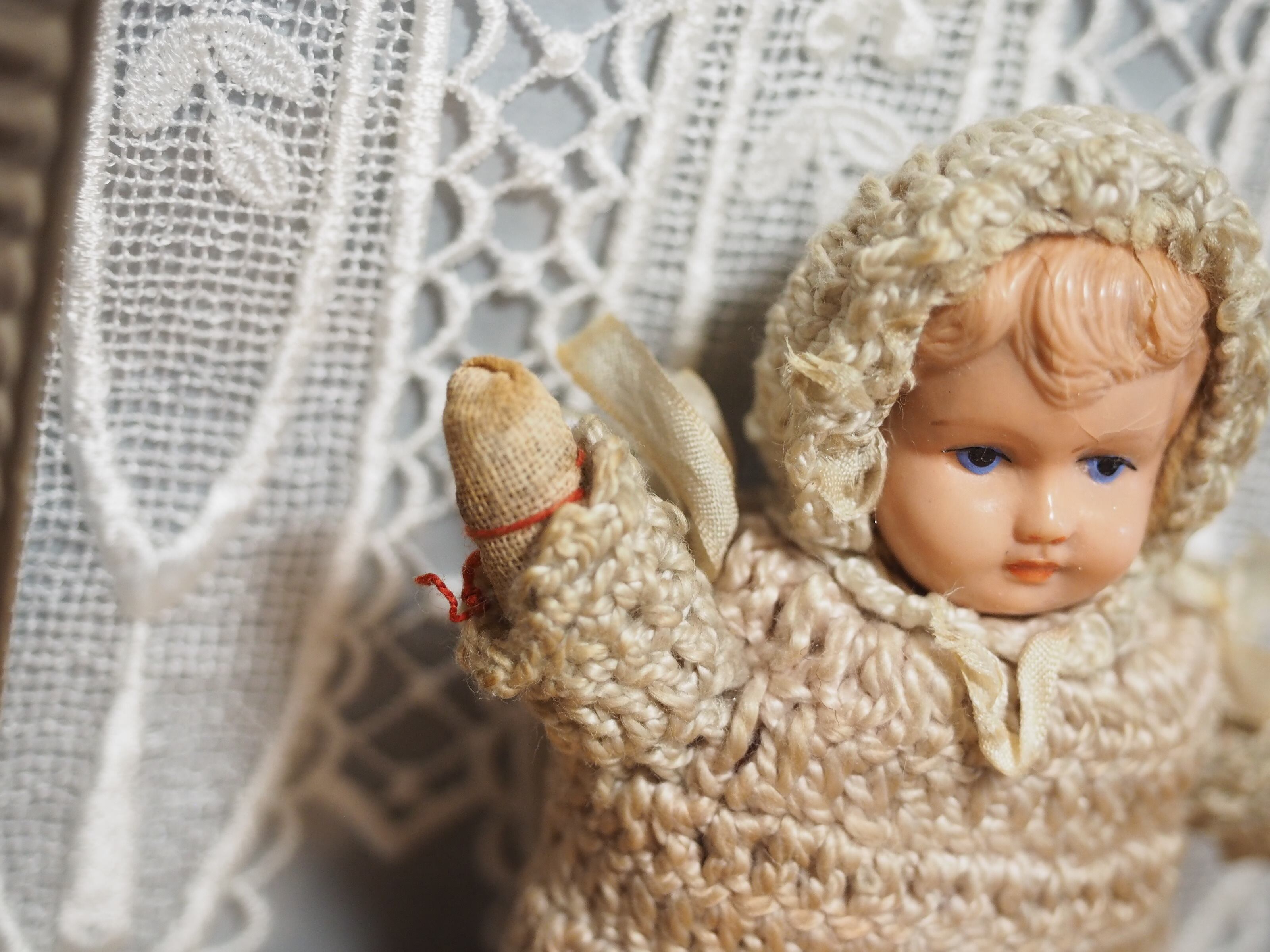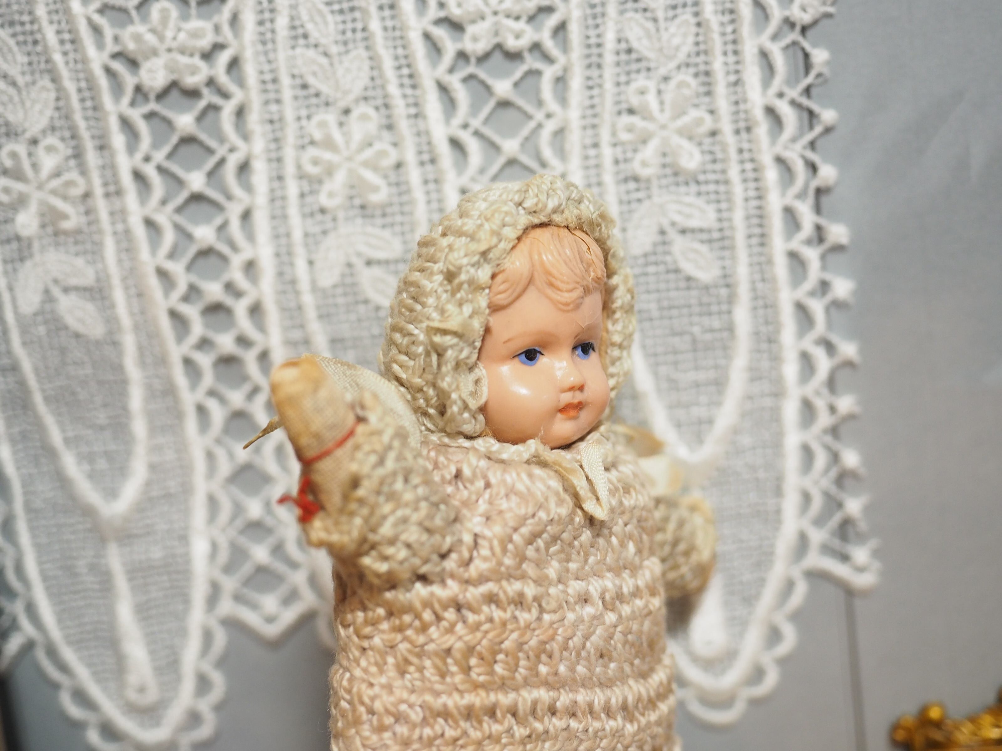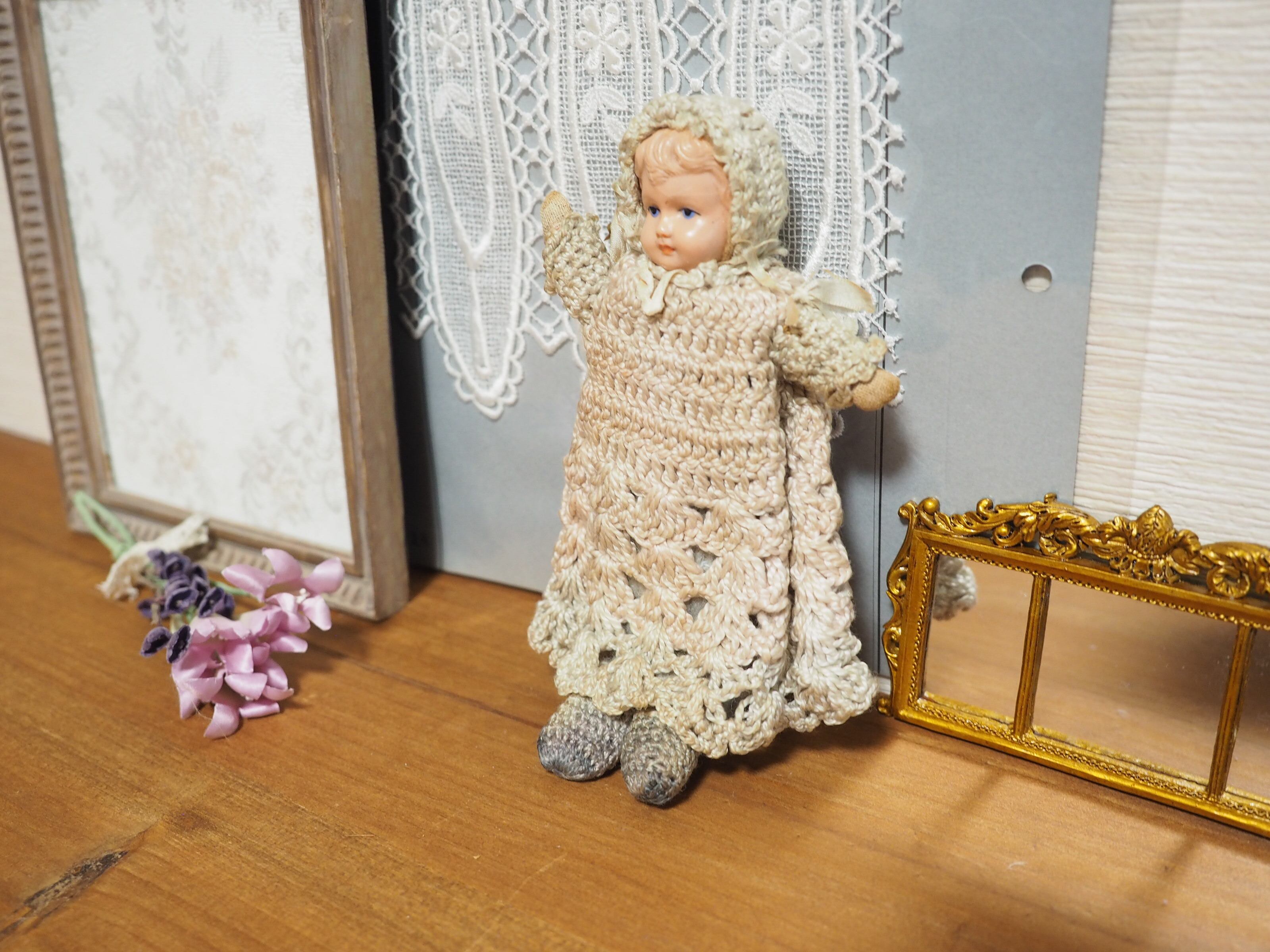 手編みニットのビンテージドール セルロイド・抱きぐるみ