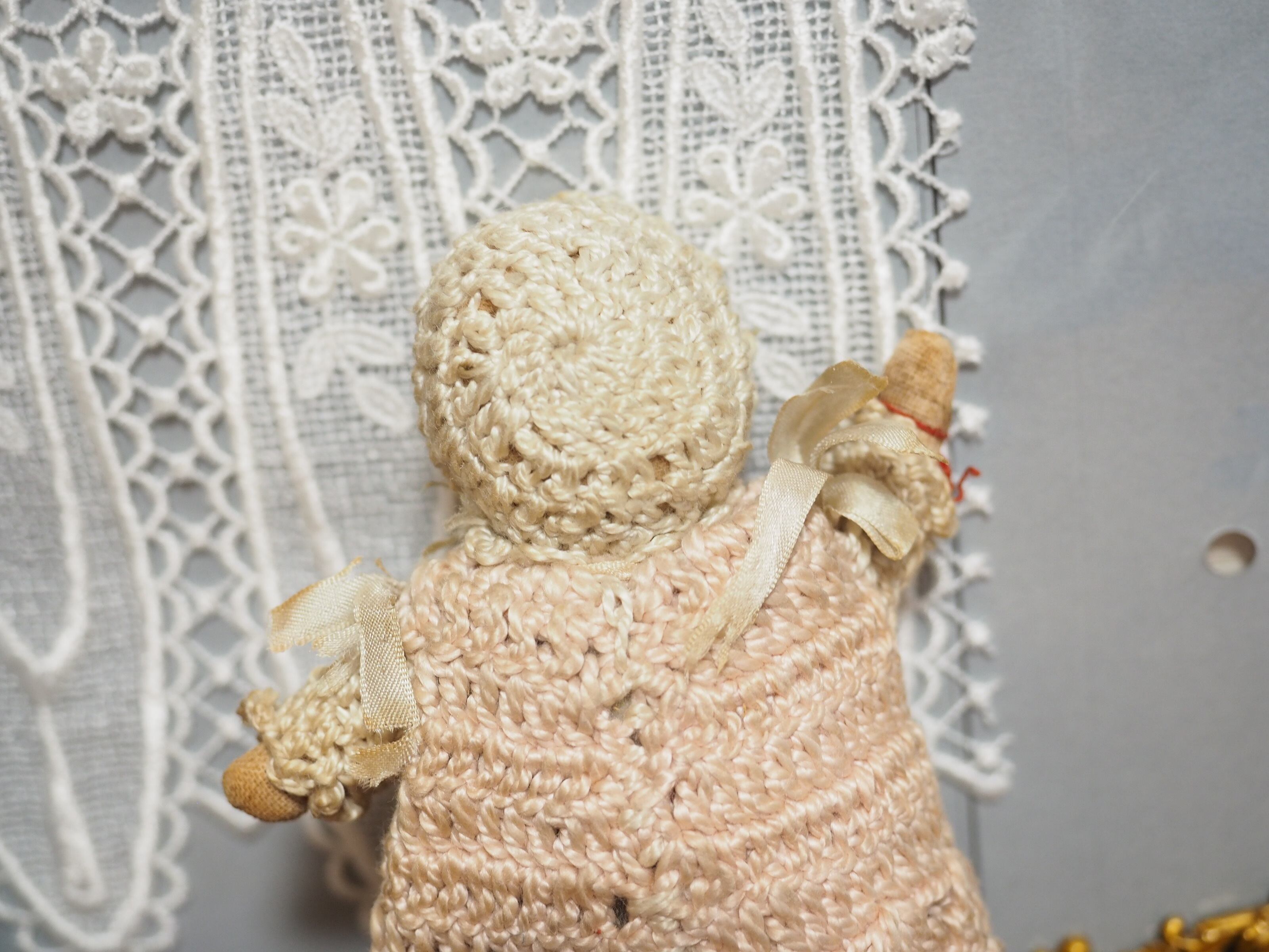 手編みのニットに布のボディ、お顔はセルロイドの古いお人形です。1900年代初頭?