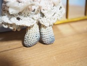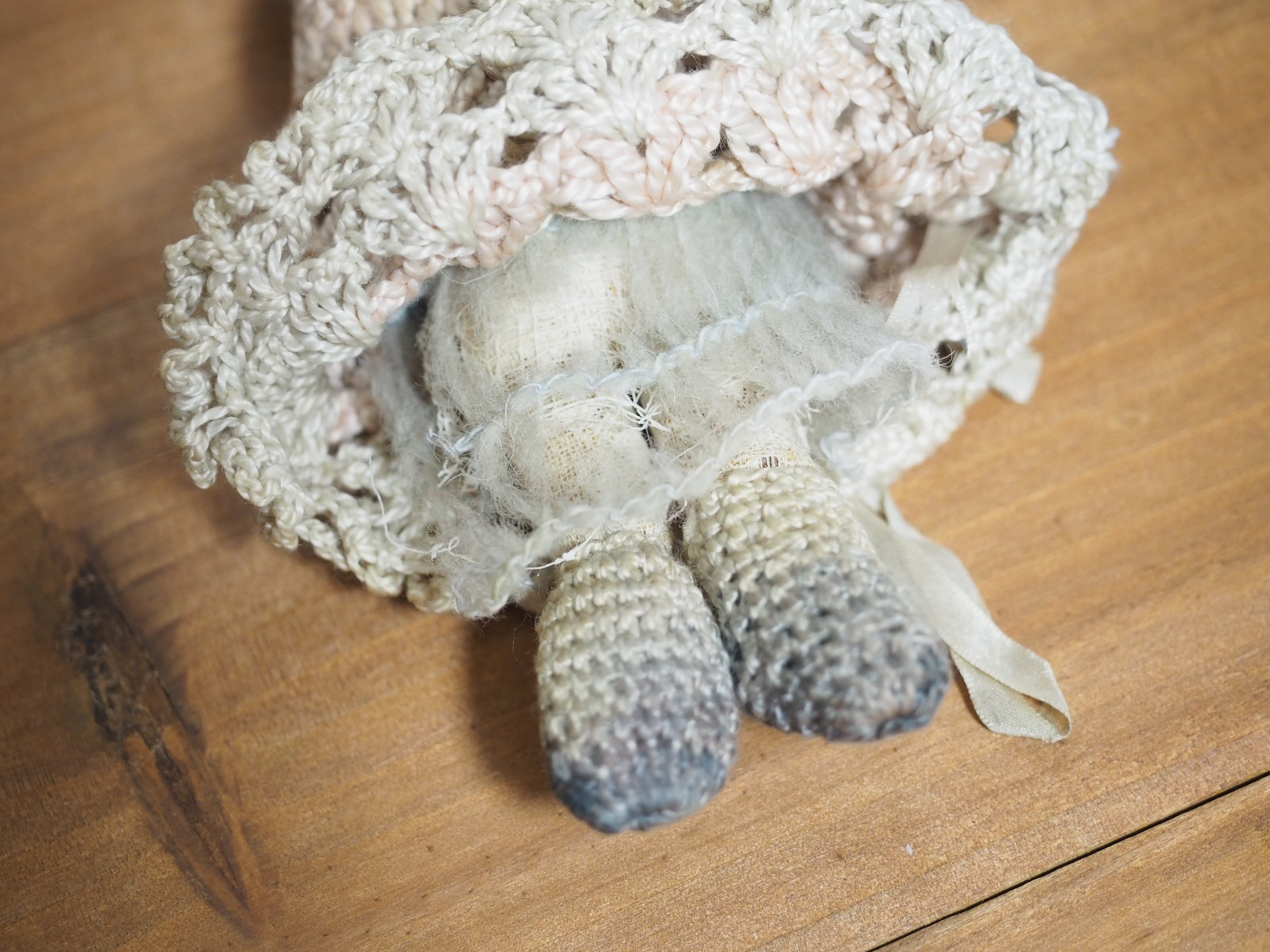 元はピンクだったのか、薄くピンクの残ったクロシェニットは色があせた部分と、茶色くなった部分、足先は内部からの色移りなのか黒っぽくなっています。