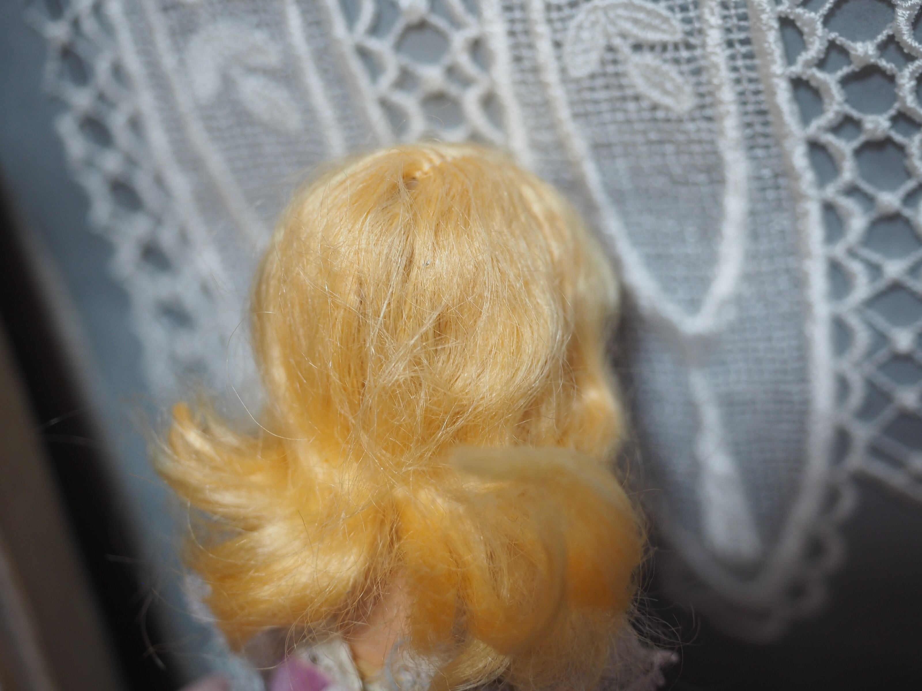 髪はモヘアウィッグで接着されており、ふわふわと少し乱れがあります。また後ろのカールが取れ毛先が伸びている部分がございます。