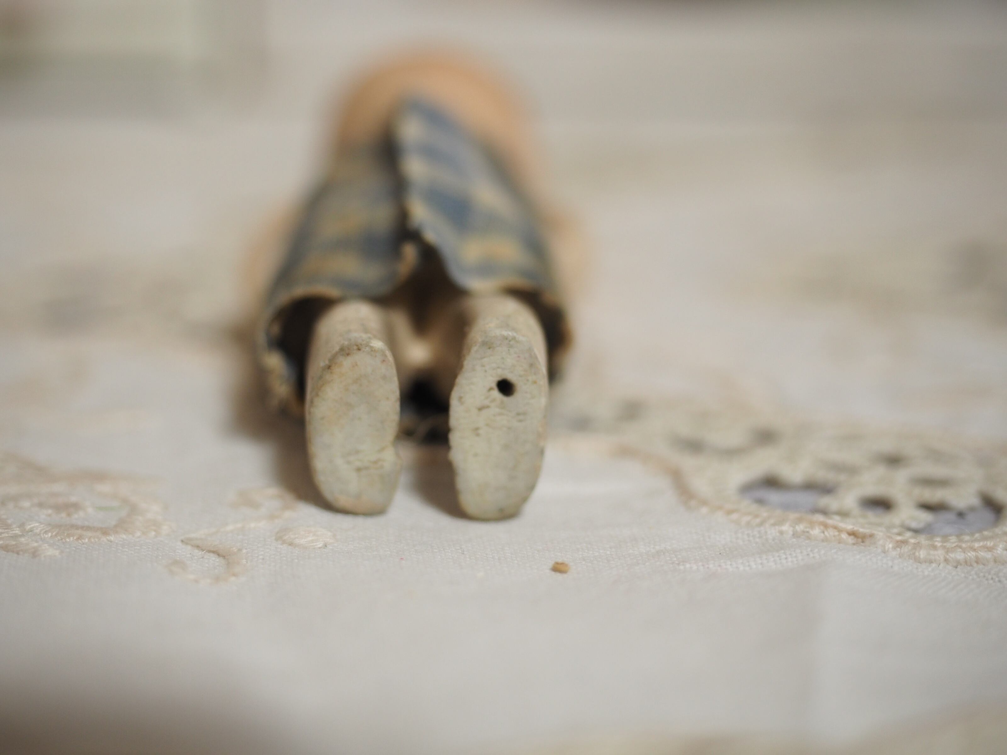 右足裏に製造時のと思われる穴があり、左足内側に欠けがございます。