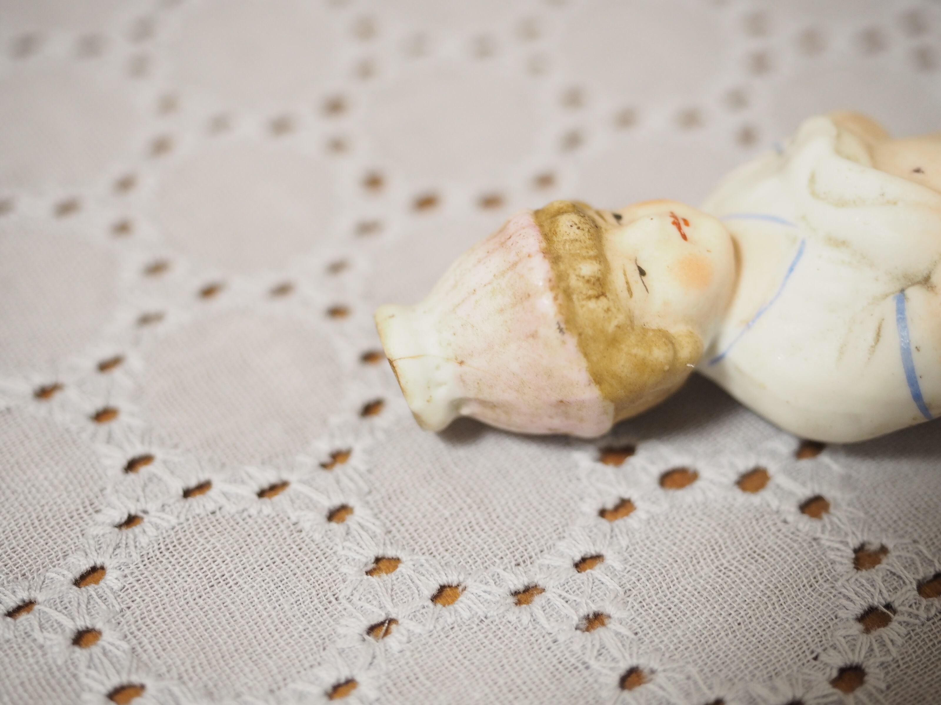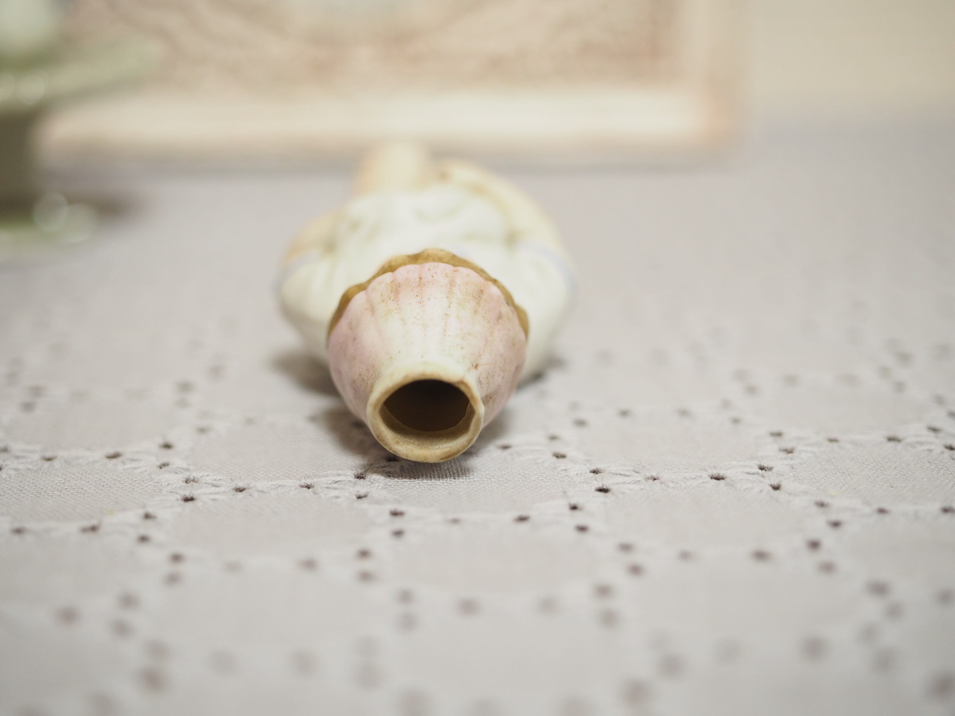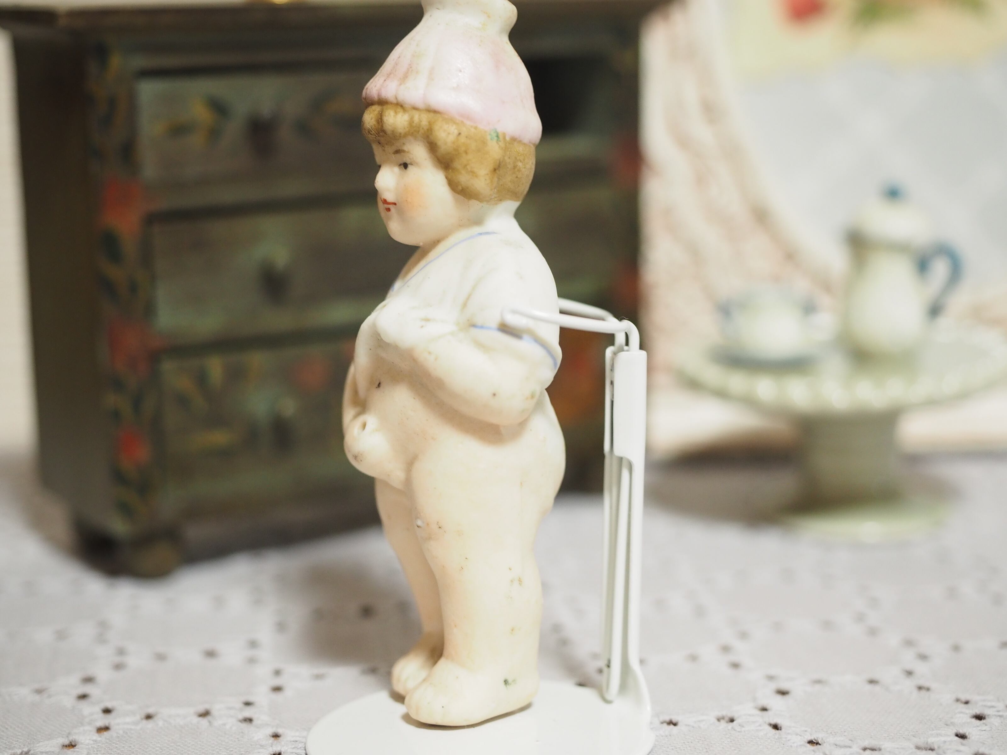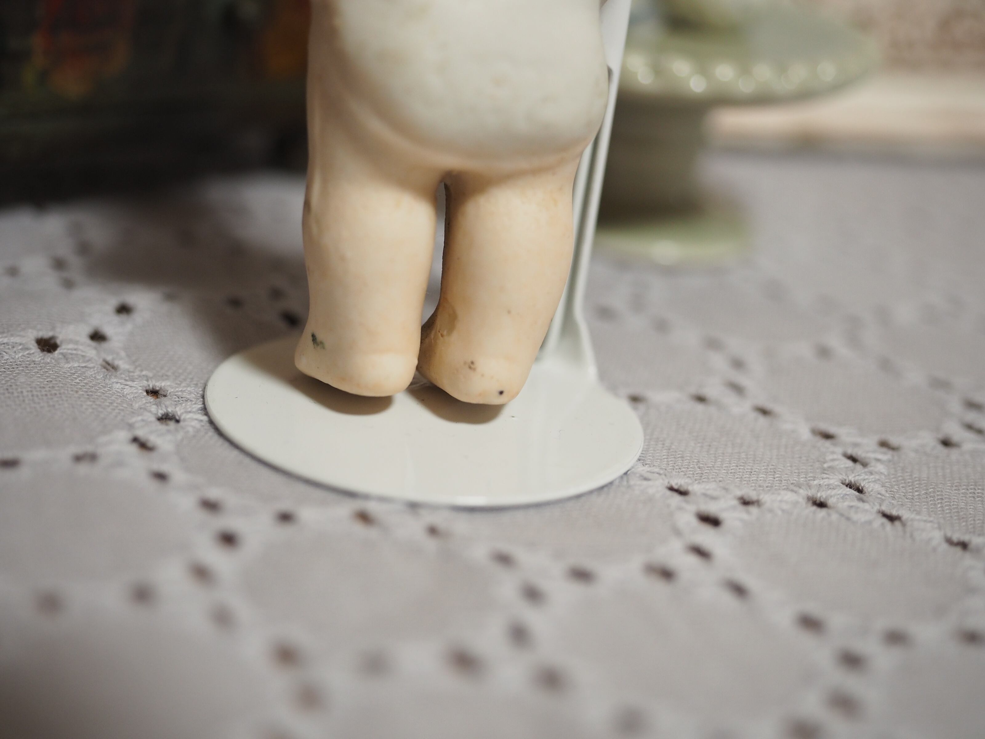 ドイツ製で見られた様式のお人形ですが、国名の刻印はありません。お尻部分にうっすら数字の刻印がありますが、薄く判読が難しいです。
