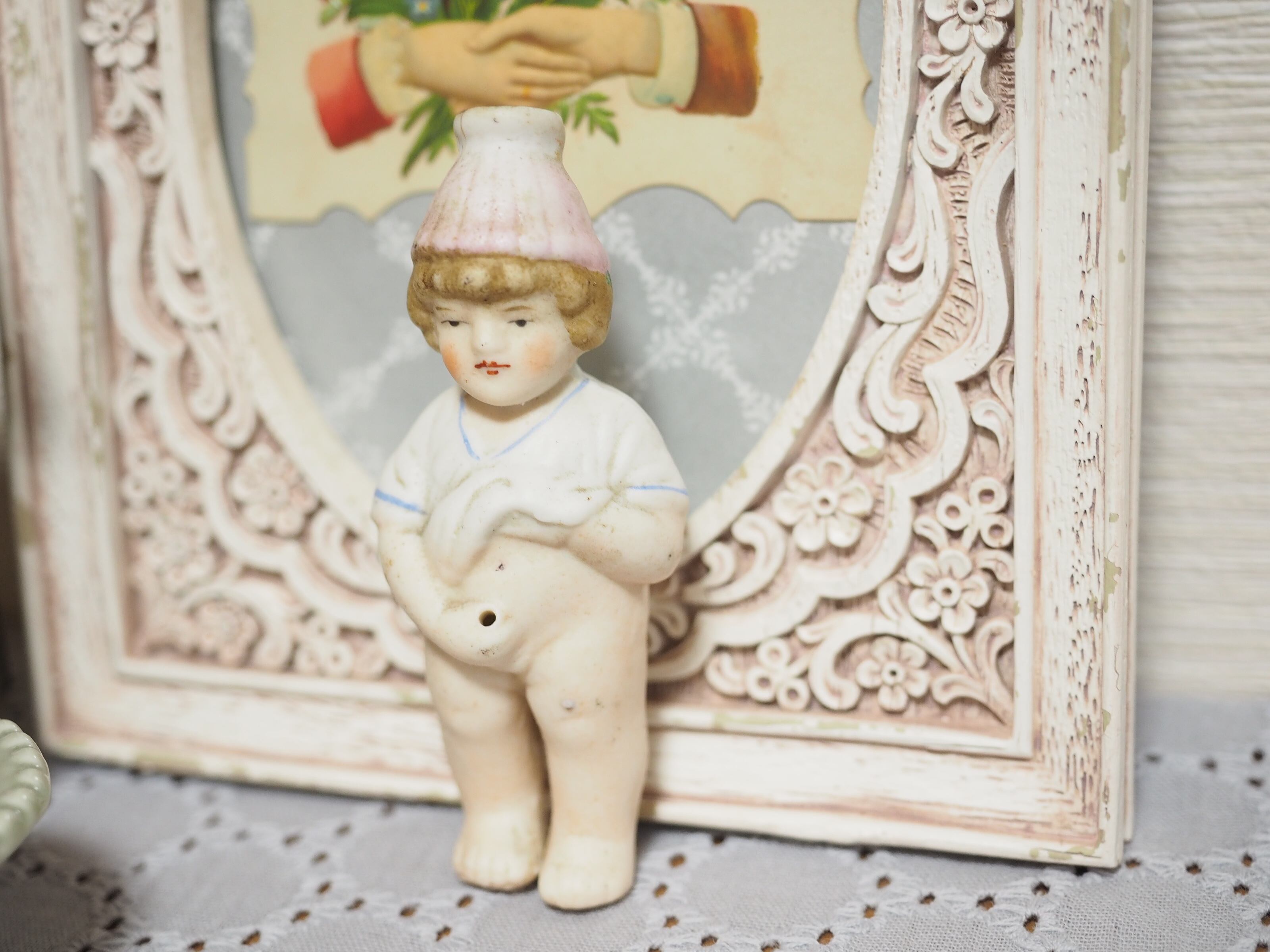 ほんのりピンク色のニットの帽子をかぶった小便小僧さん、頭は穴が開いており水を入れて遊べたようです。