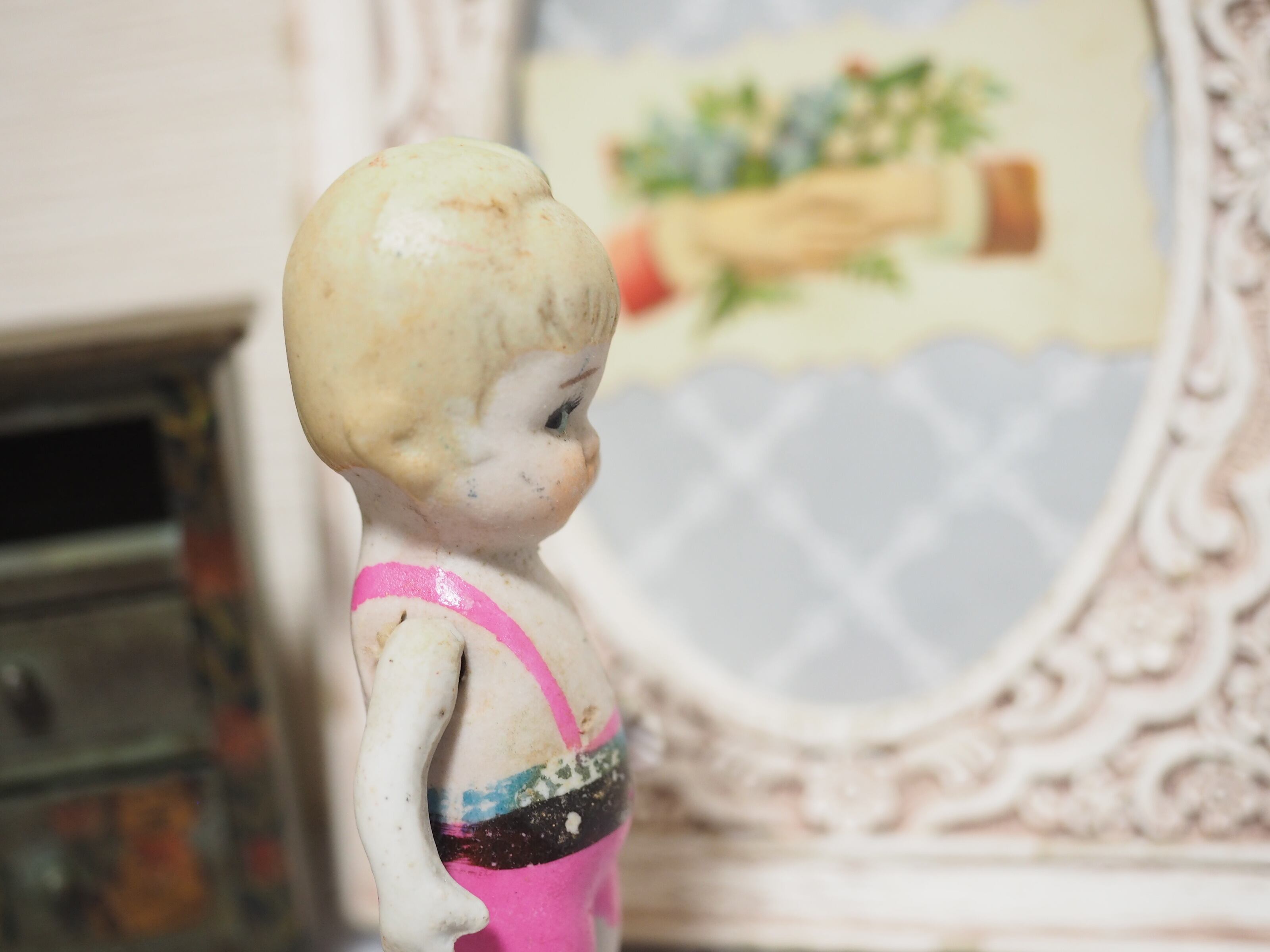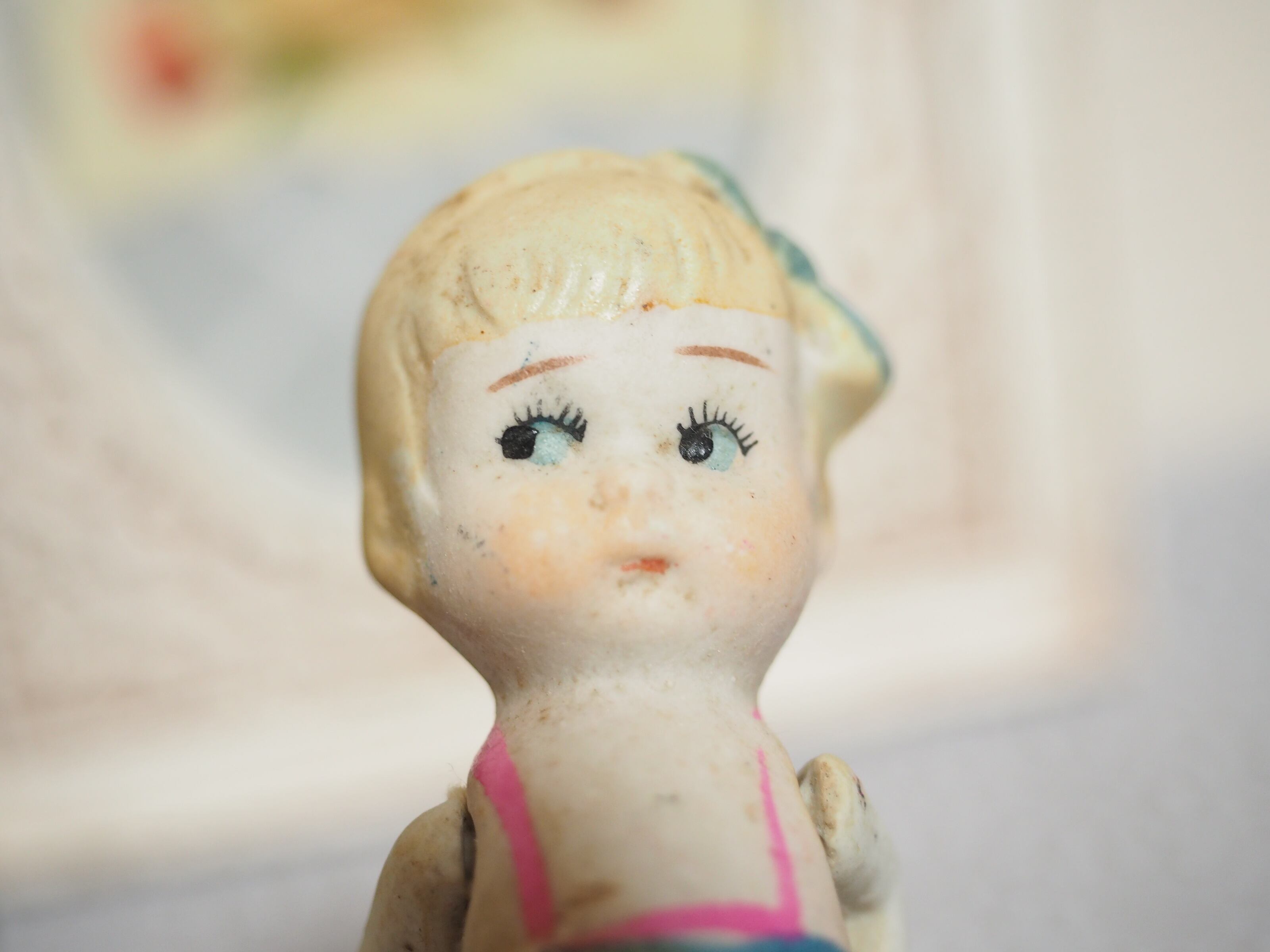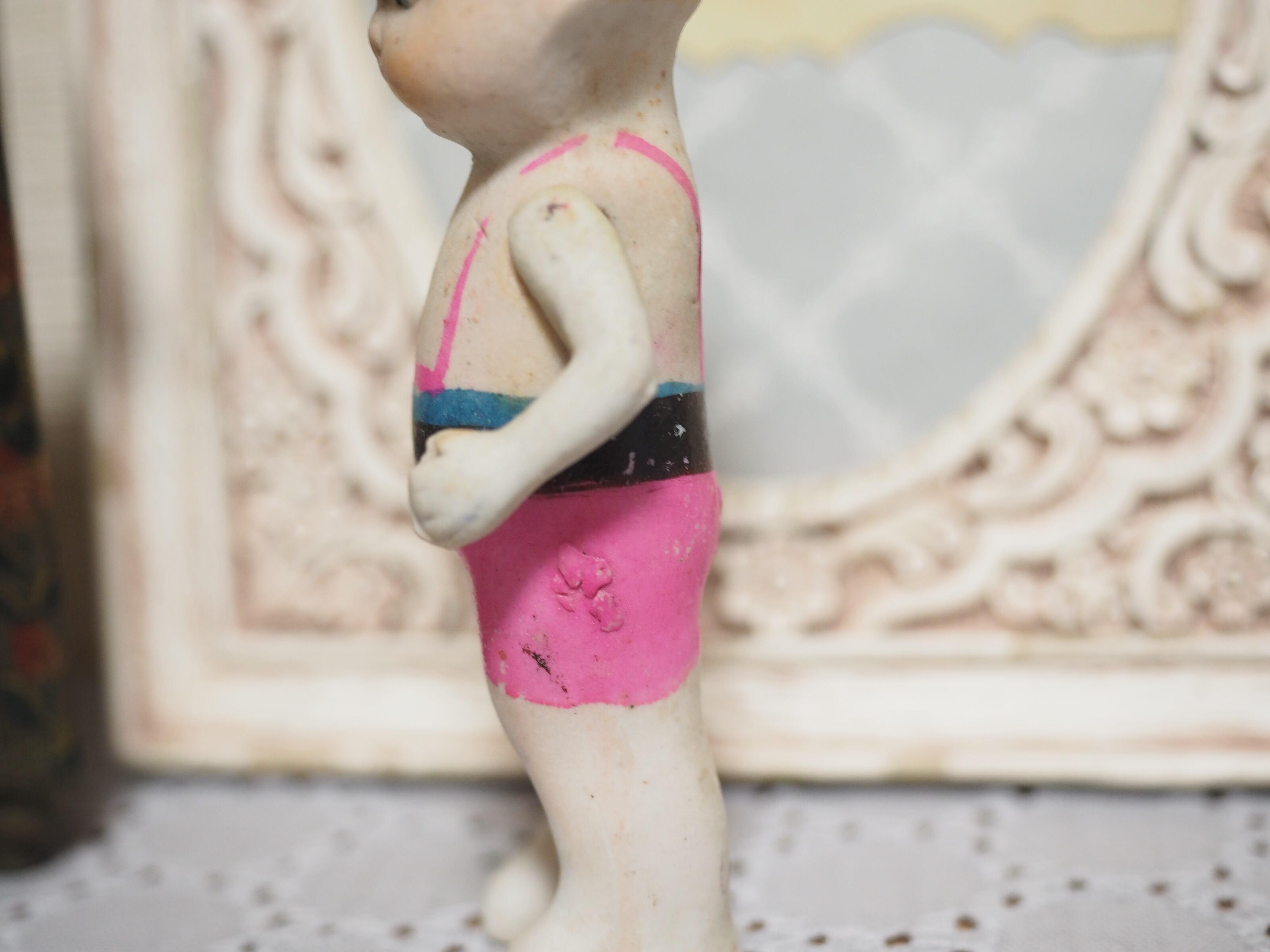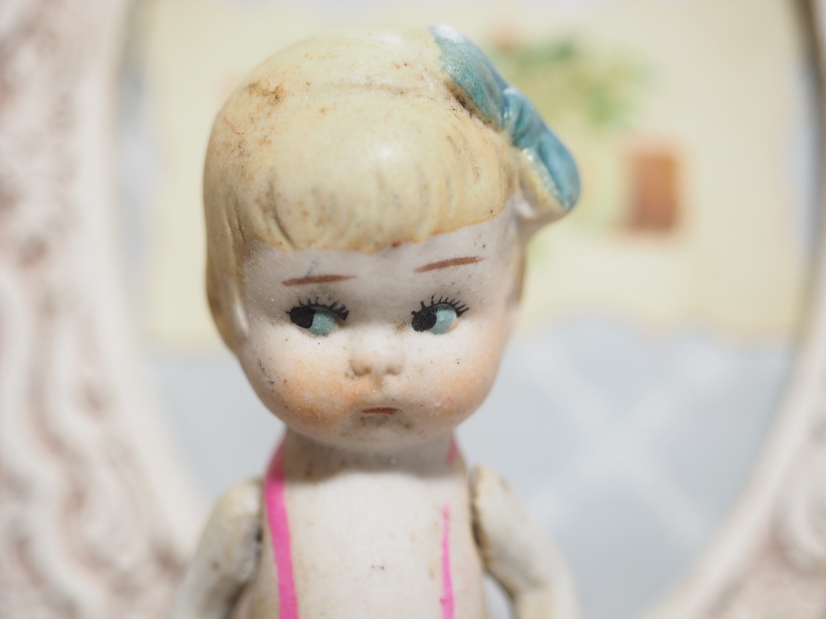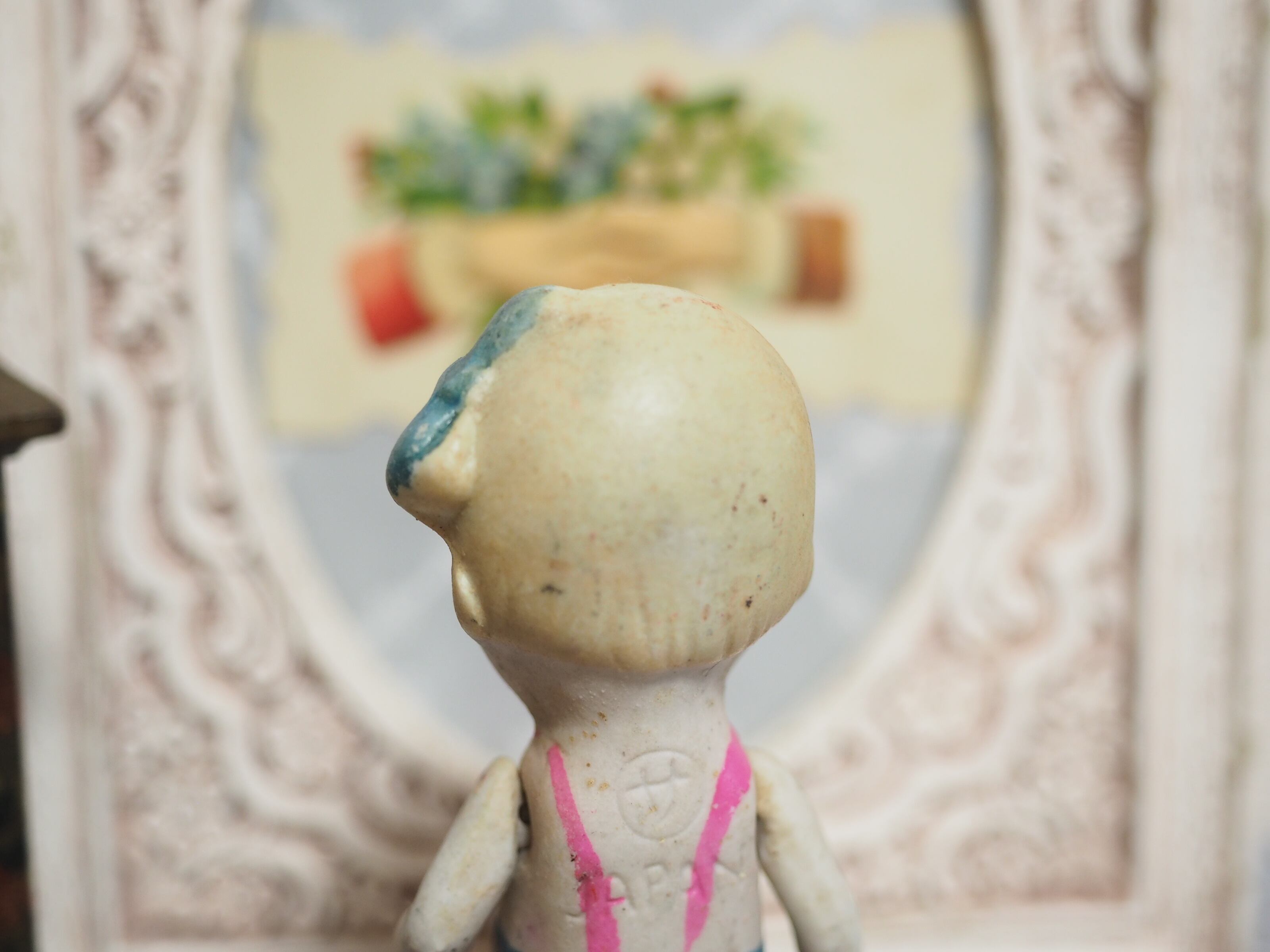 ビスク製、背中にサ〇、JAPAN刻印、サクラビスクなどを作られていた酒井のドールと思われます。古い時代の手活人形