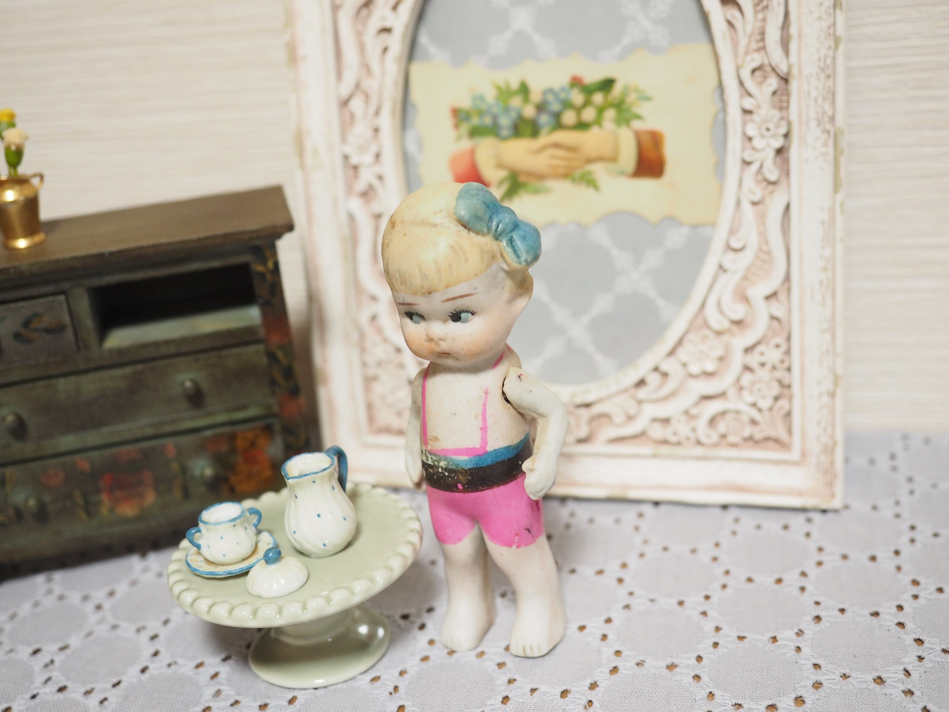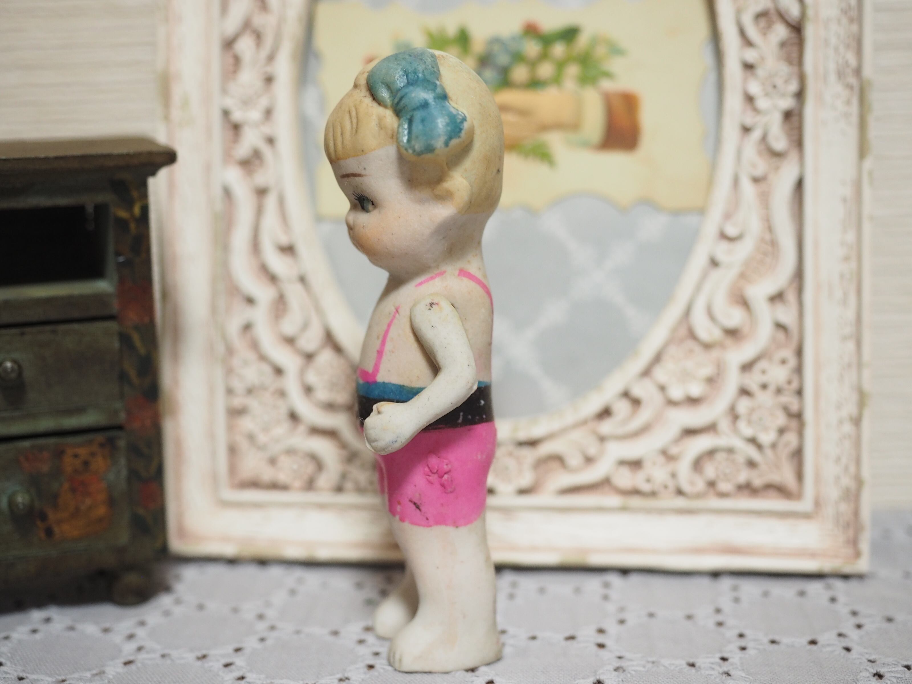 ぽってりしたフォルムに大きなリボン、表情がなんともかわいい女の子です。