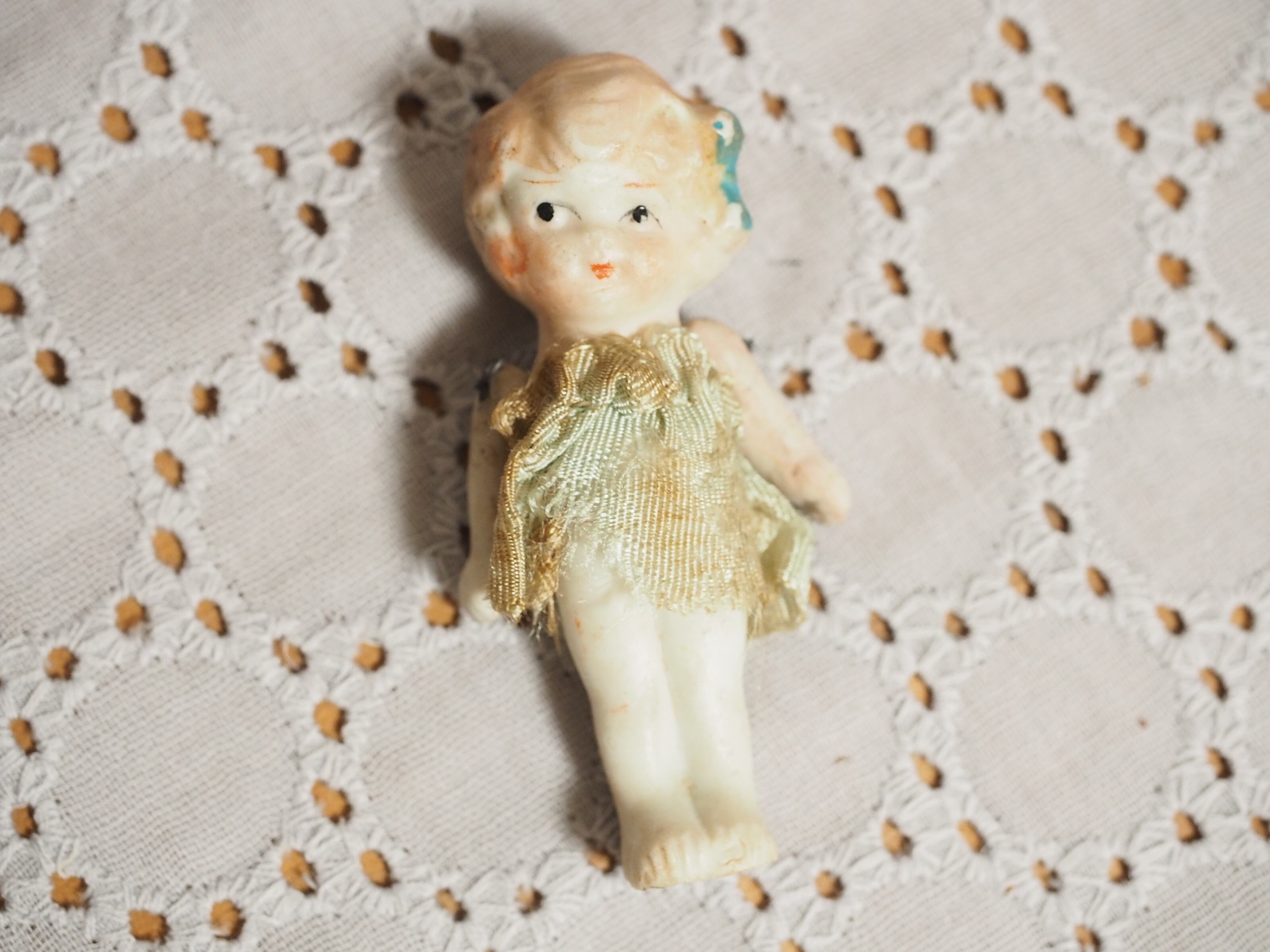 光沢のある薄グリーンのお洋服は当時物と思われ、破れや経年の変色がございます。後ろが糸でつながれています。
